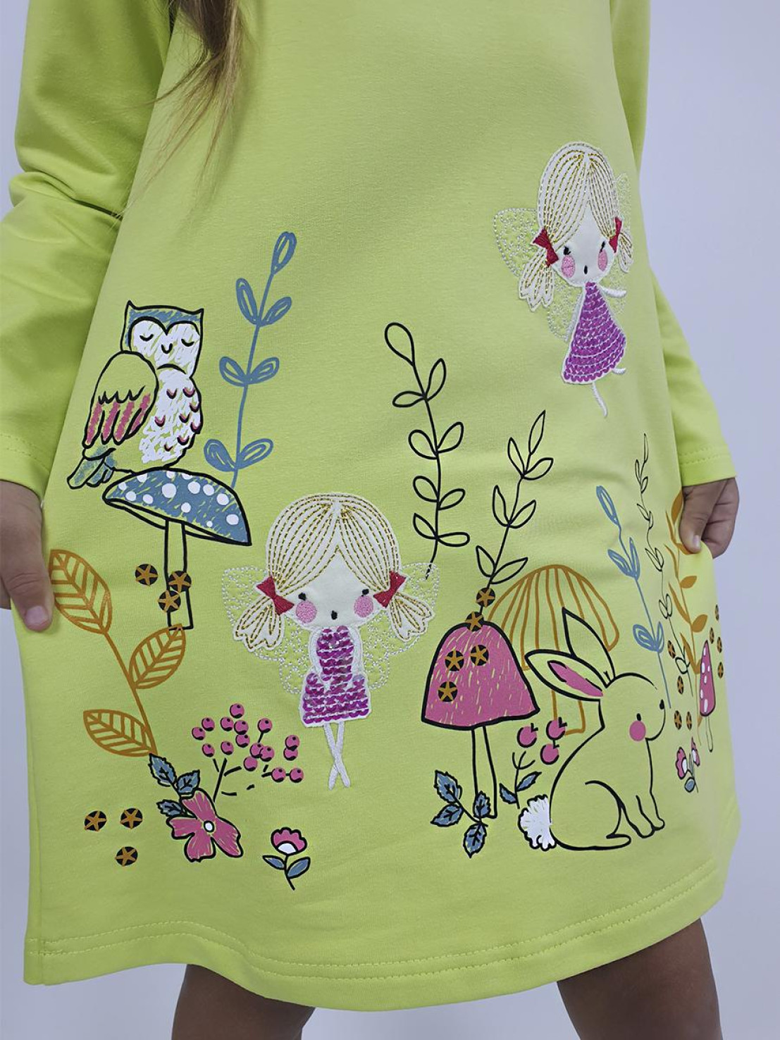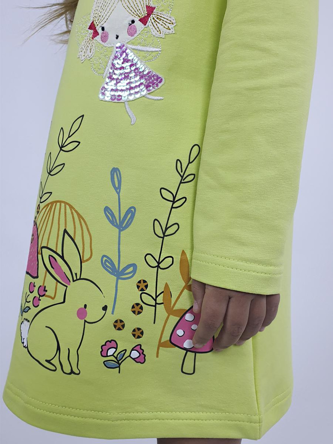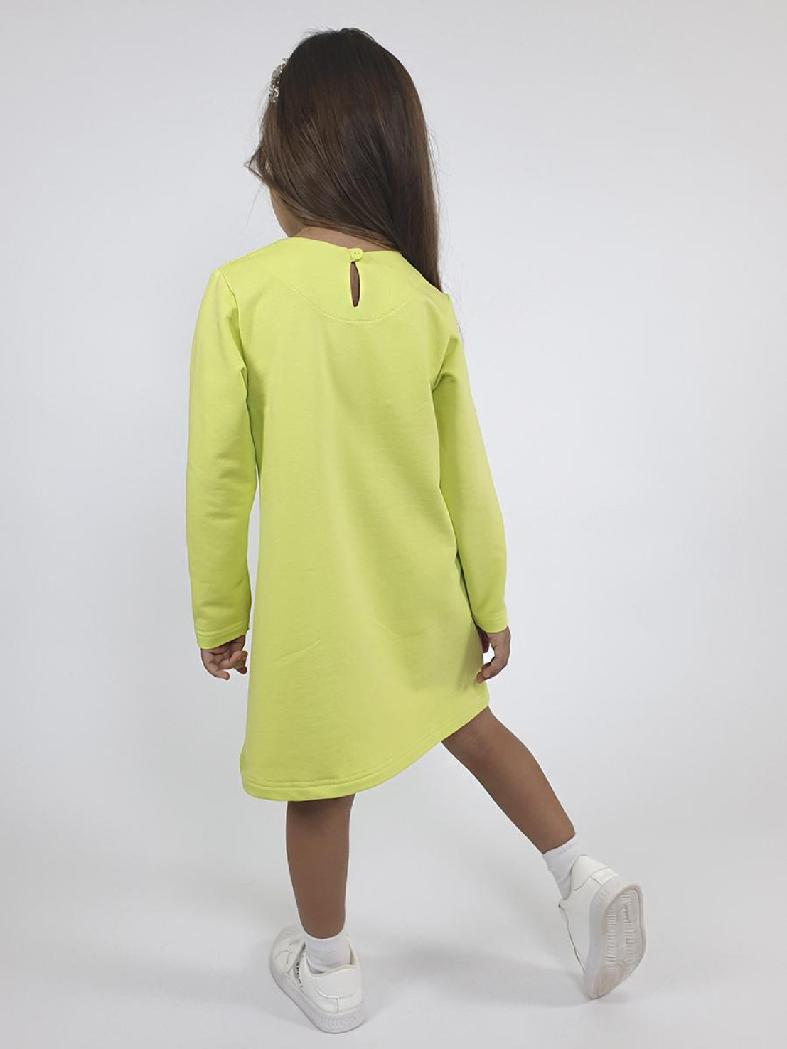 Футер 2-х нитка:97% х/б,3% лайкра. Платье-силуэт трапеция,без воротника,застежка на пуговицу по спинке.Втачной,длинный рукав.Печать и вышивка аппликация(пайетки) на полочке.