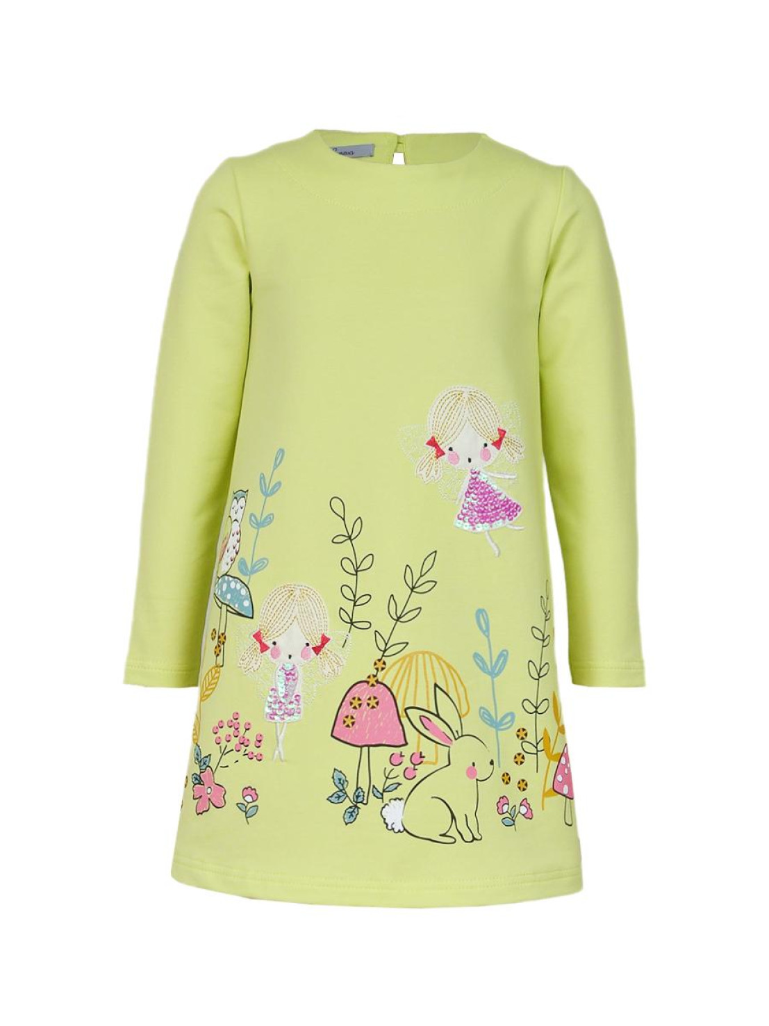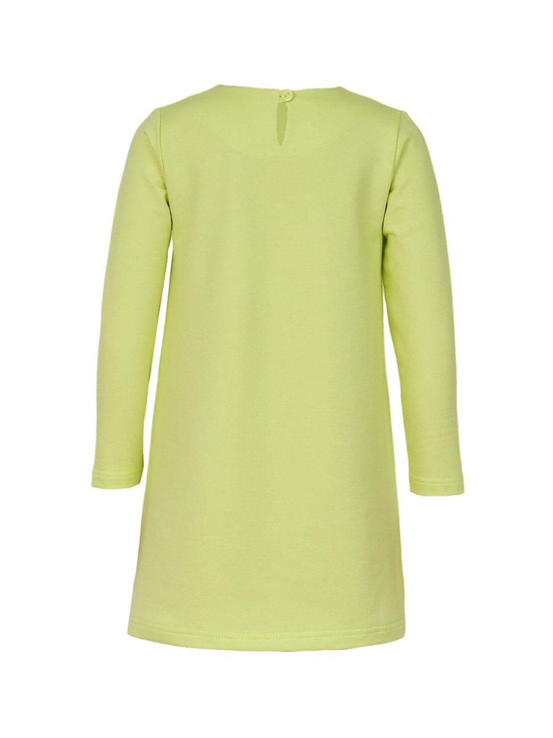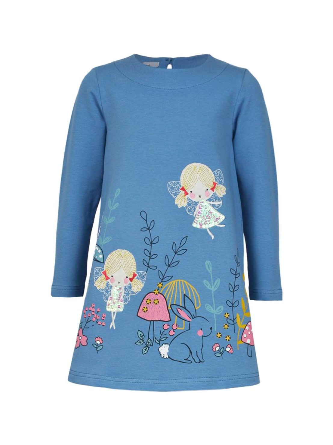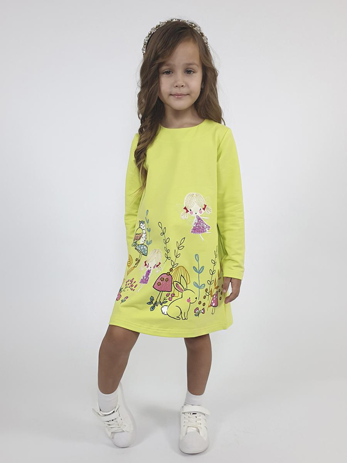 Футер 2-х нитка:97% х/б,3% лайкра. Платье-силуэт трапеция,без воротника,застежка на пуговицу по спинке.Втачной,длинный рукав.Печать и вышивка аппликация(пайетки) на полочке.