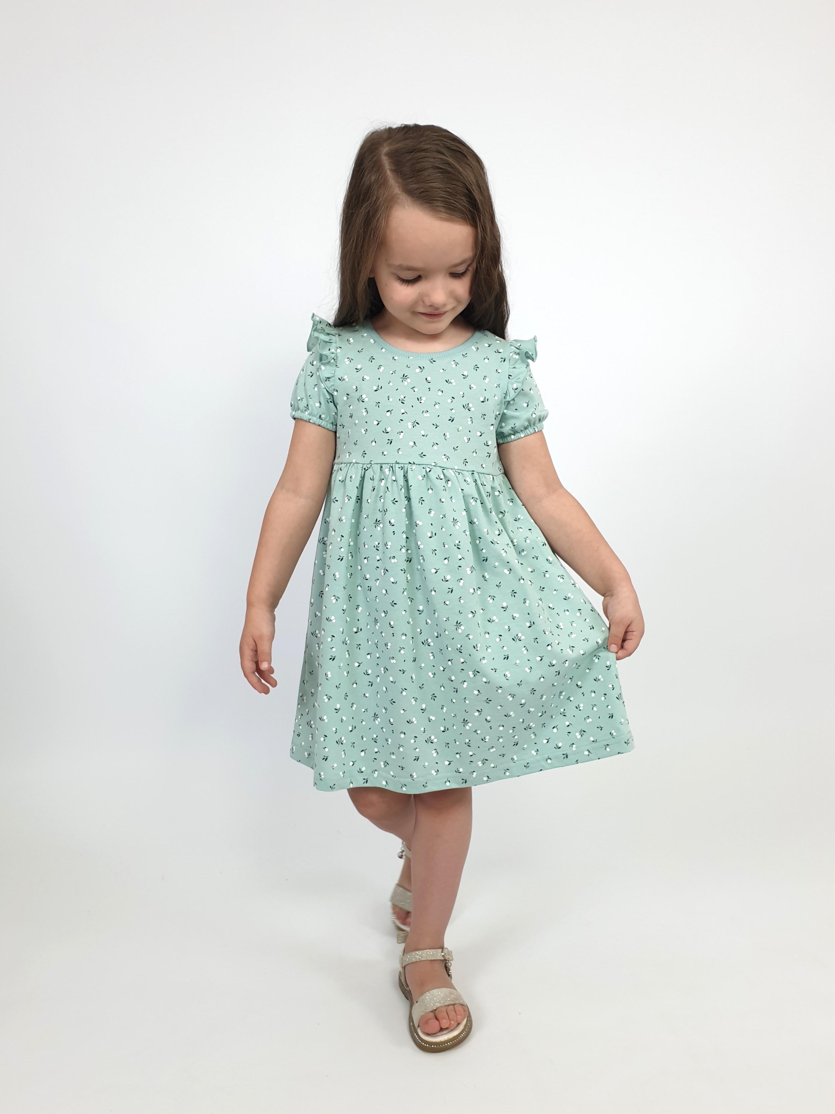 Кулирное полотно:100% х/б. Платье-перед и спинка с кокеткой,сборка по верху юбки.Рукав короткий,внизу собран на резинку,в пройме рюша.Горловина обработана ластиком.