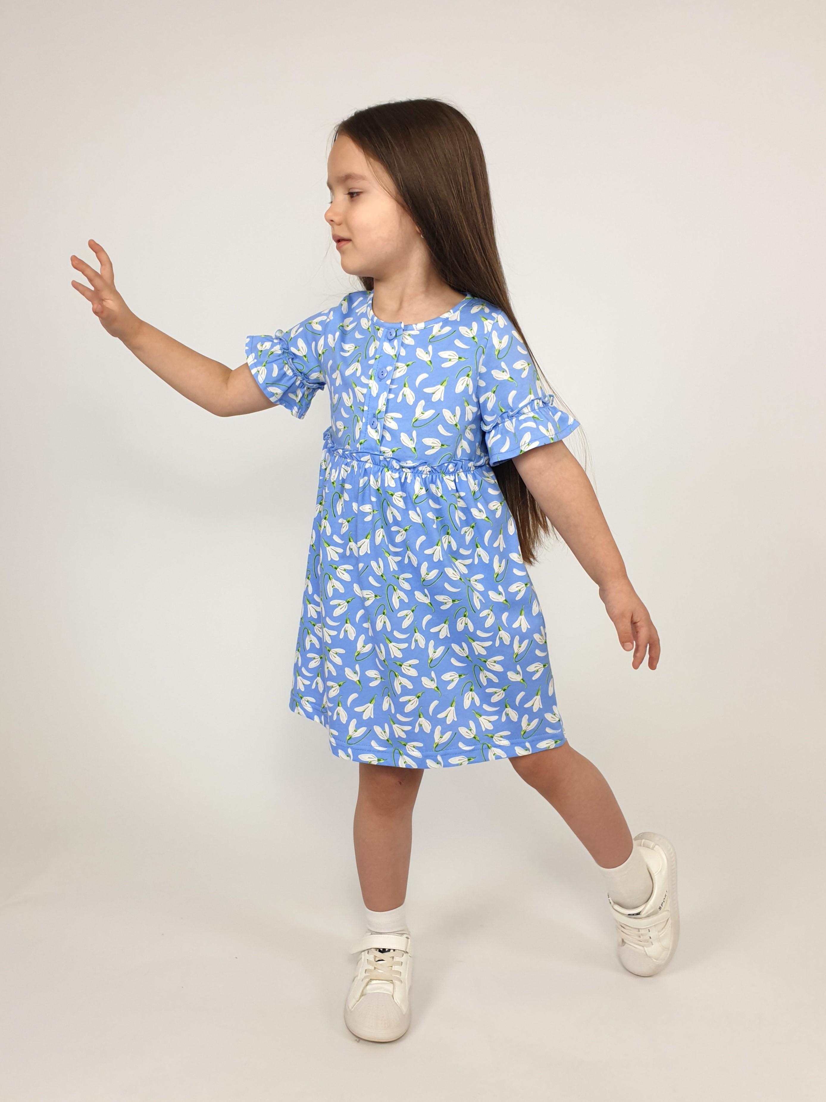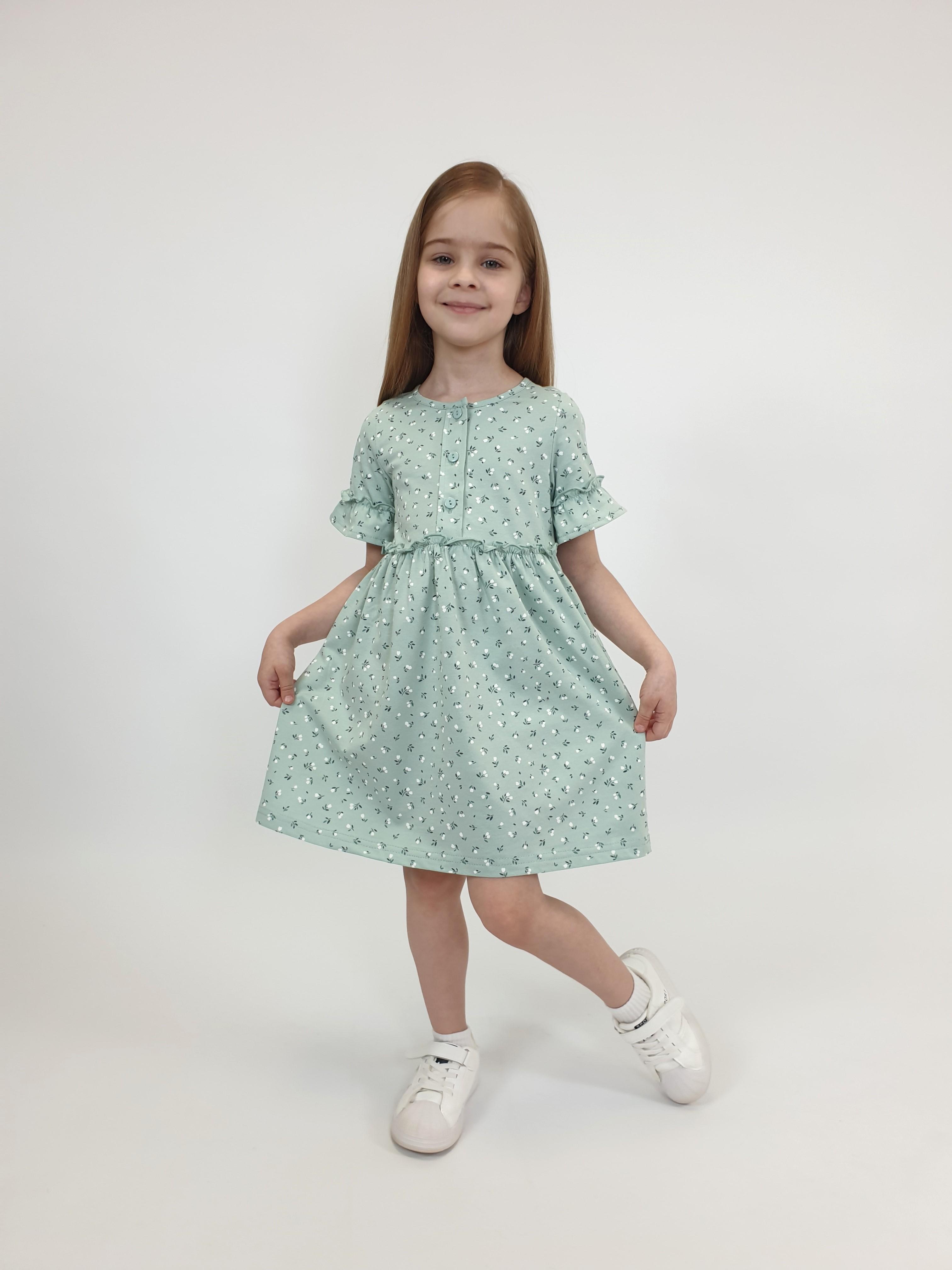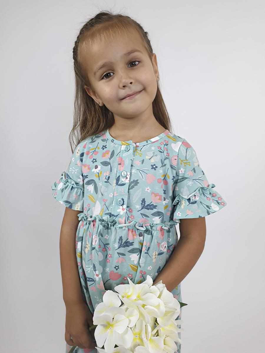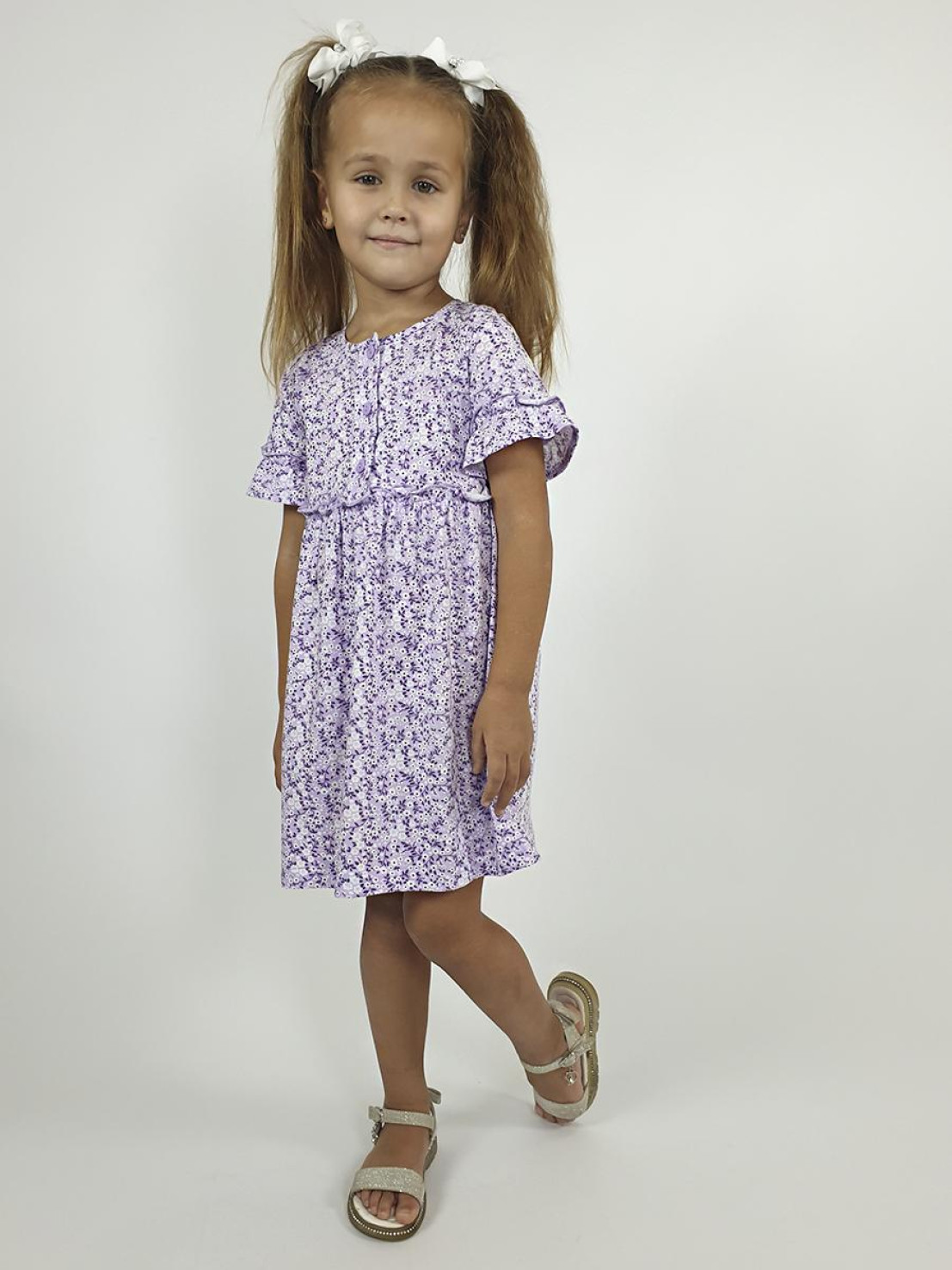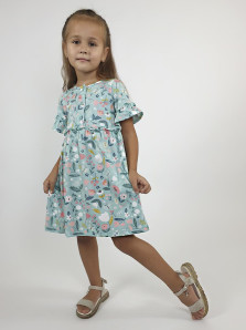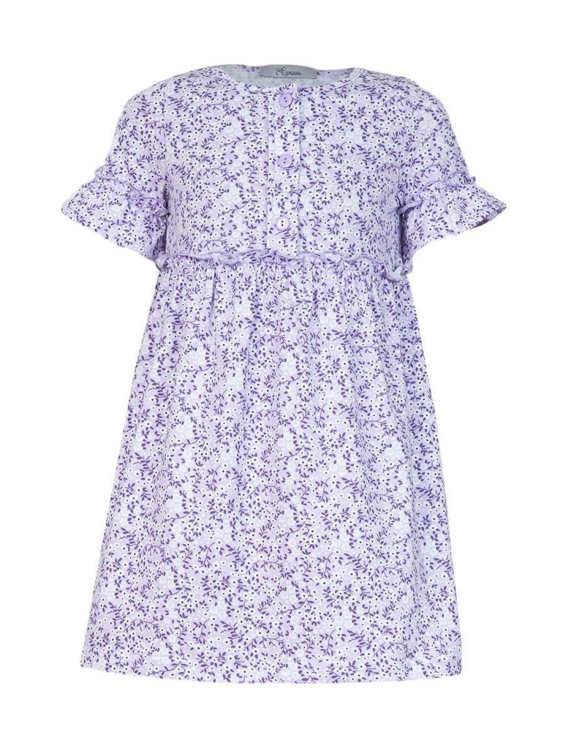 Кулирное полотно (набивка):100% х/б. Платье-силуэт трапеция,перед и спинка с кокеткой,юбка со сборкой.Рукав короткий с рюшей.Застежка по переду,на пуговицы.Горловина окантована.
