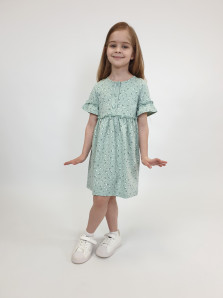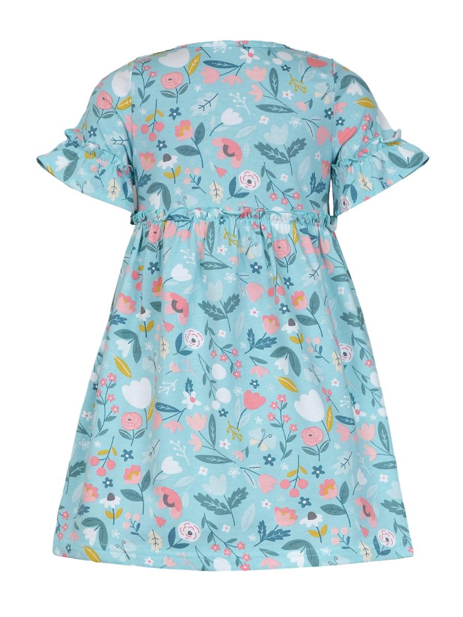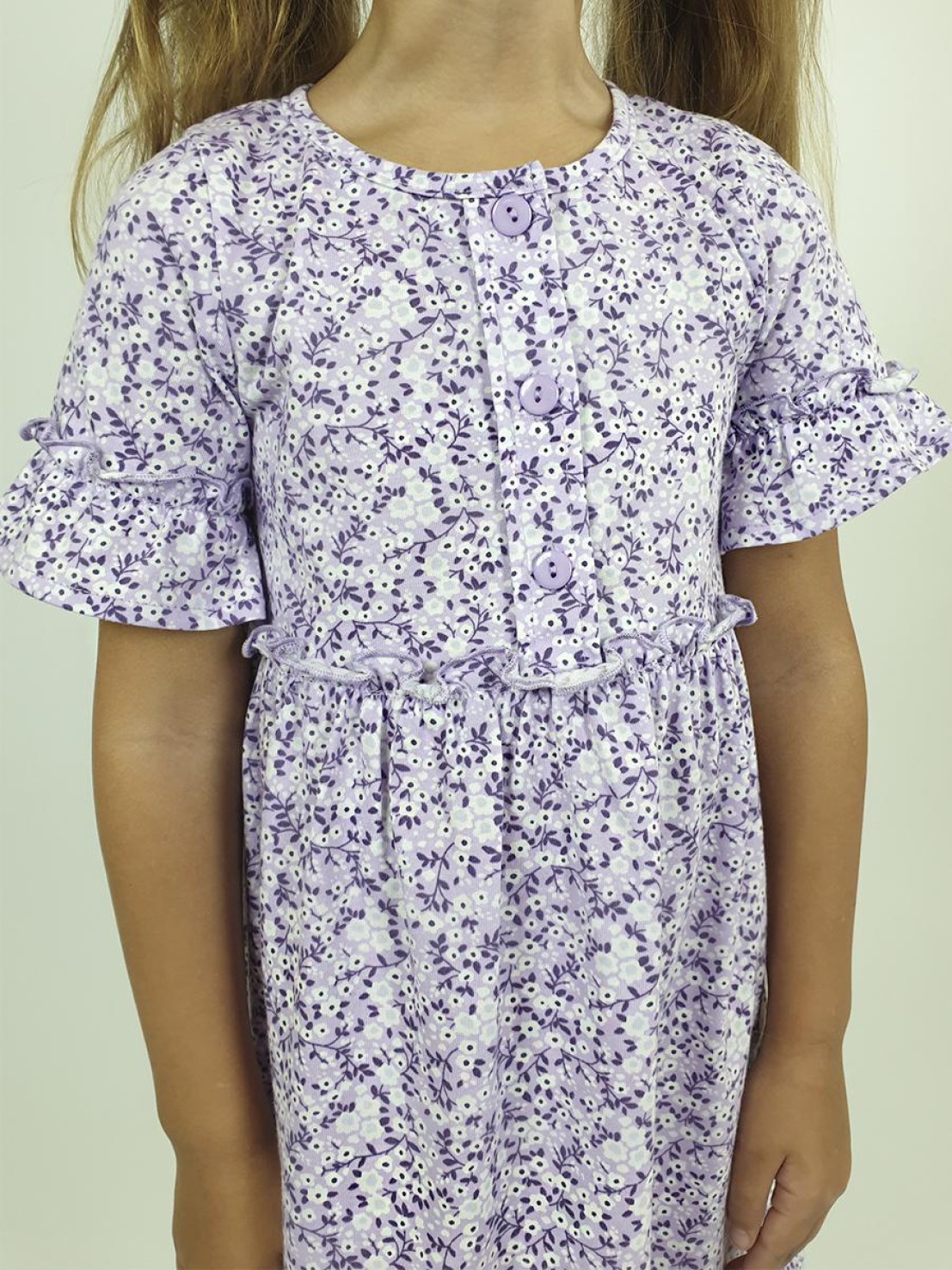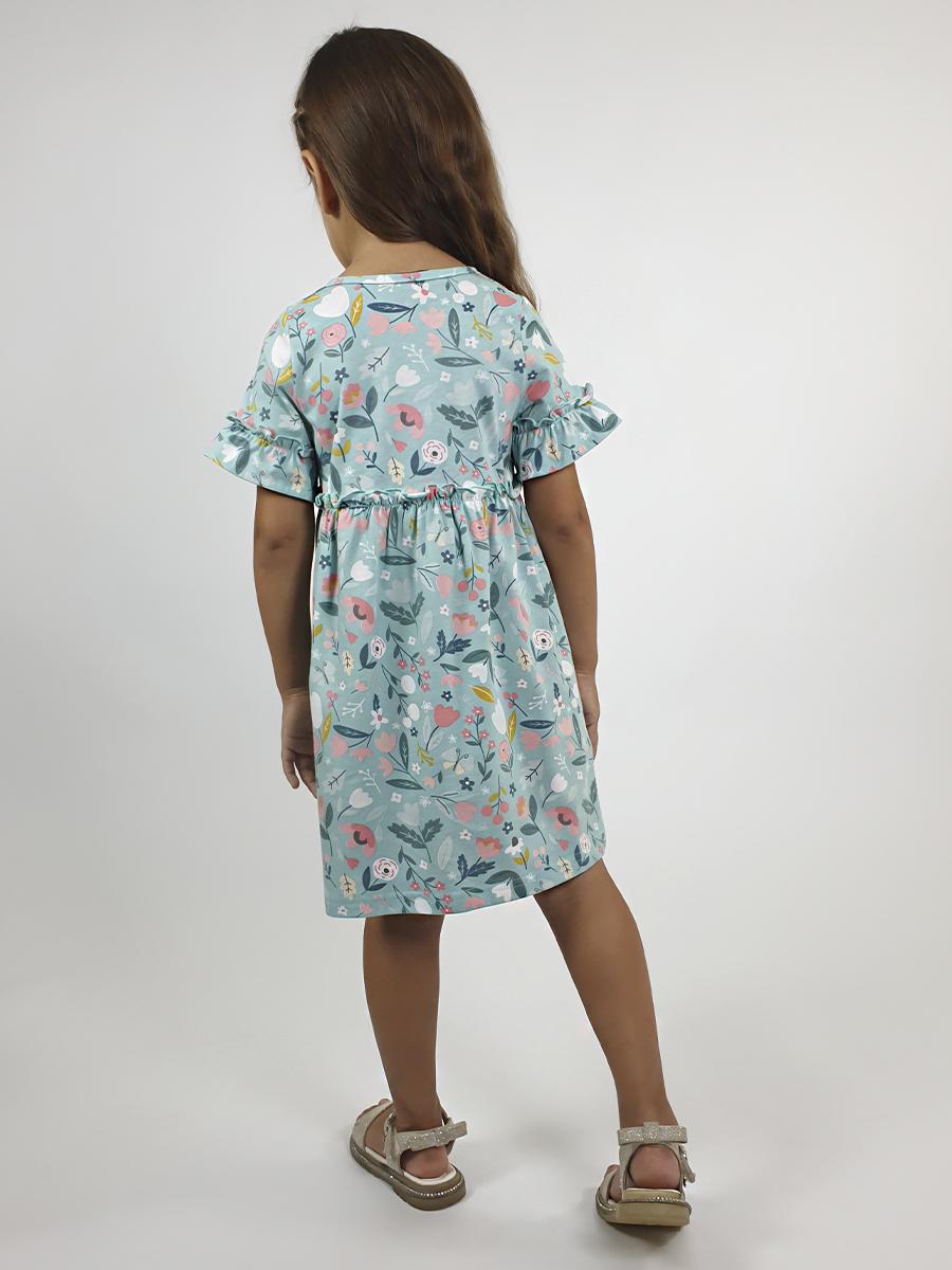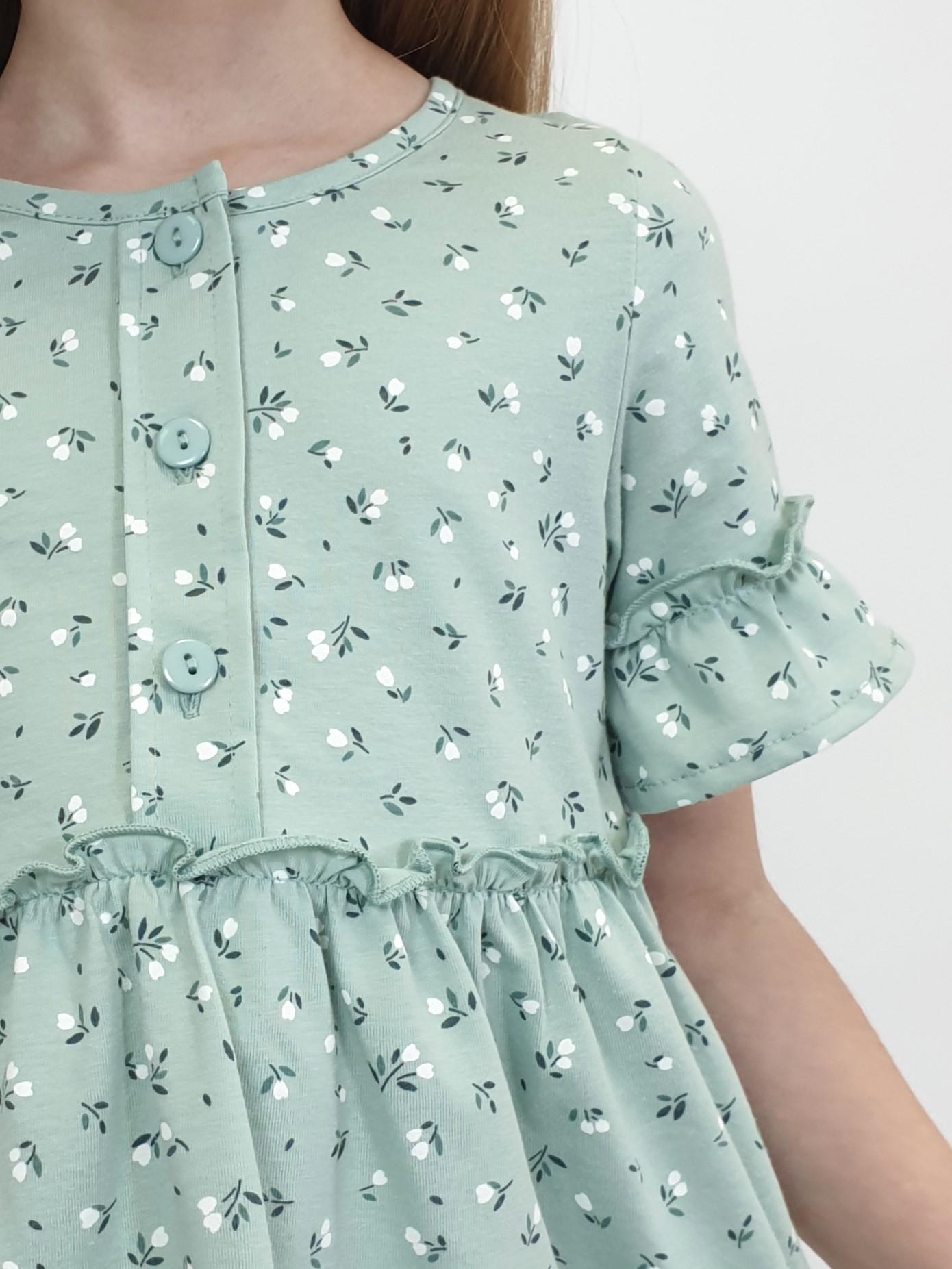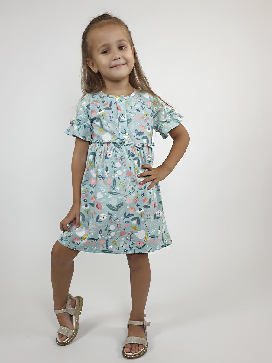 Кулирное полотно (набивка):100% х/б. Платье-силуэт трапеция,перед и спинка с кокеткой,юбка со сборкой.Рукав короткий с рюшей.Застежка по переду,на пуговицы.Горловина окантована.