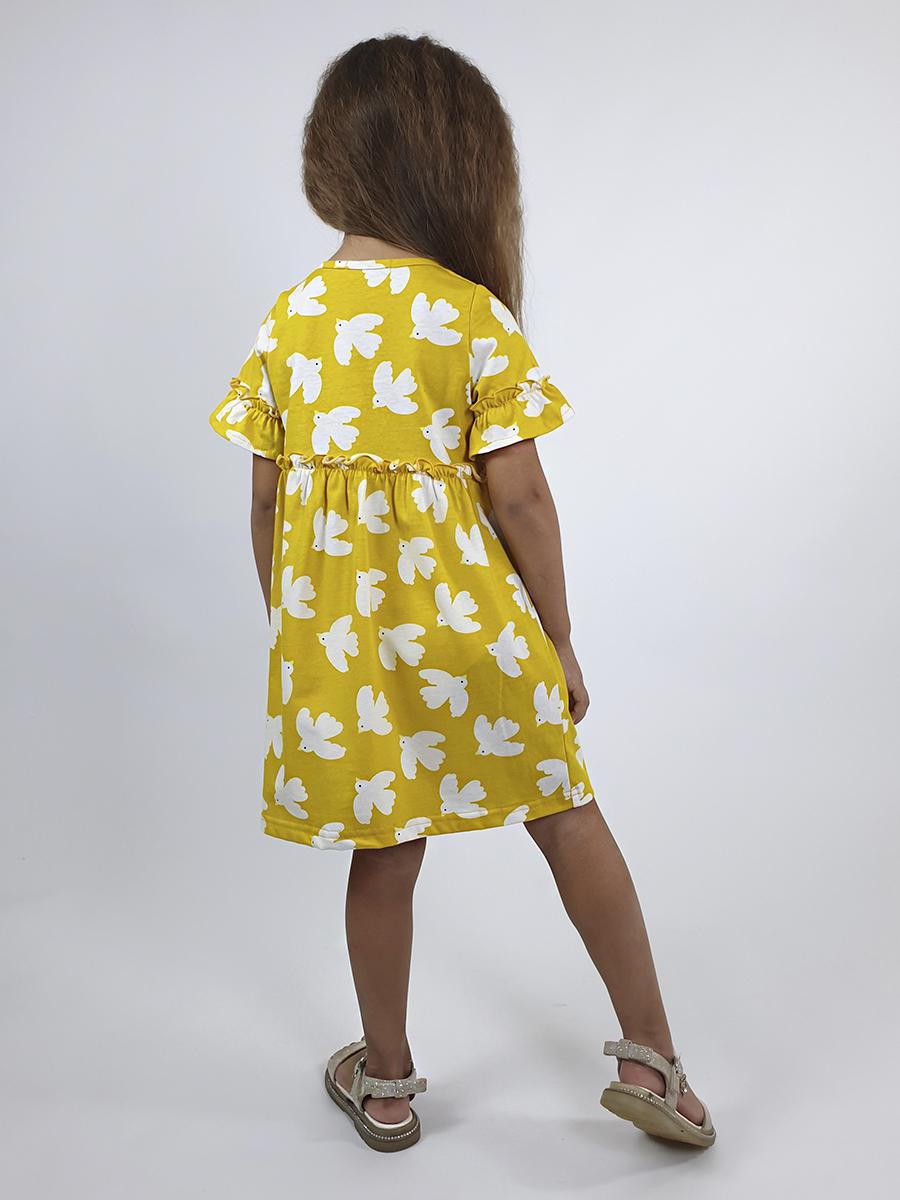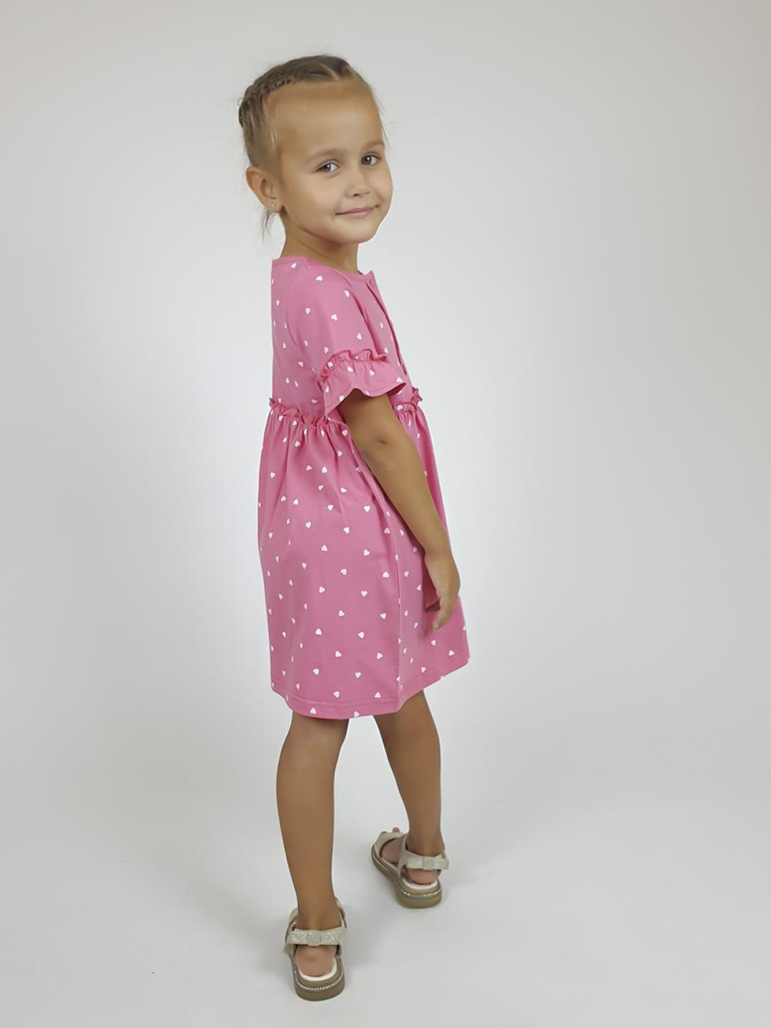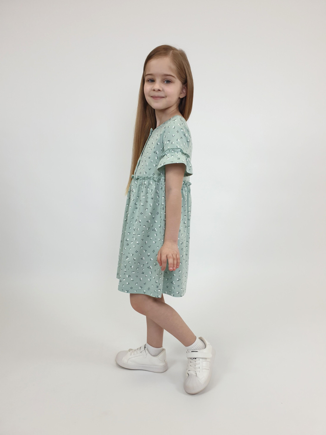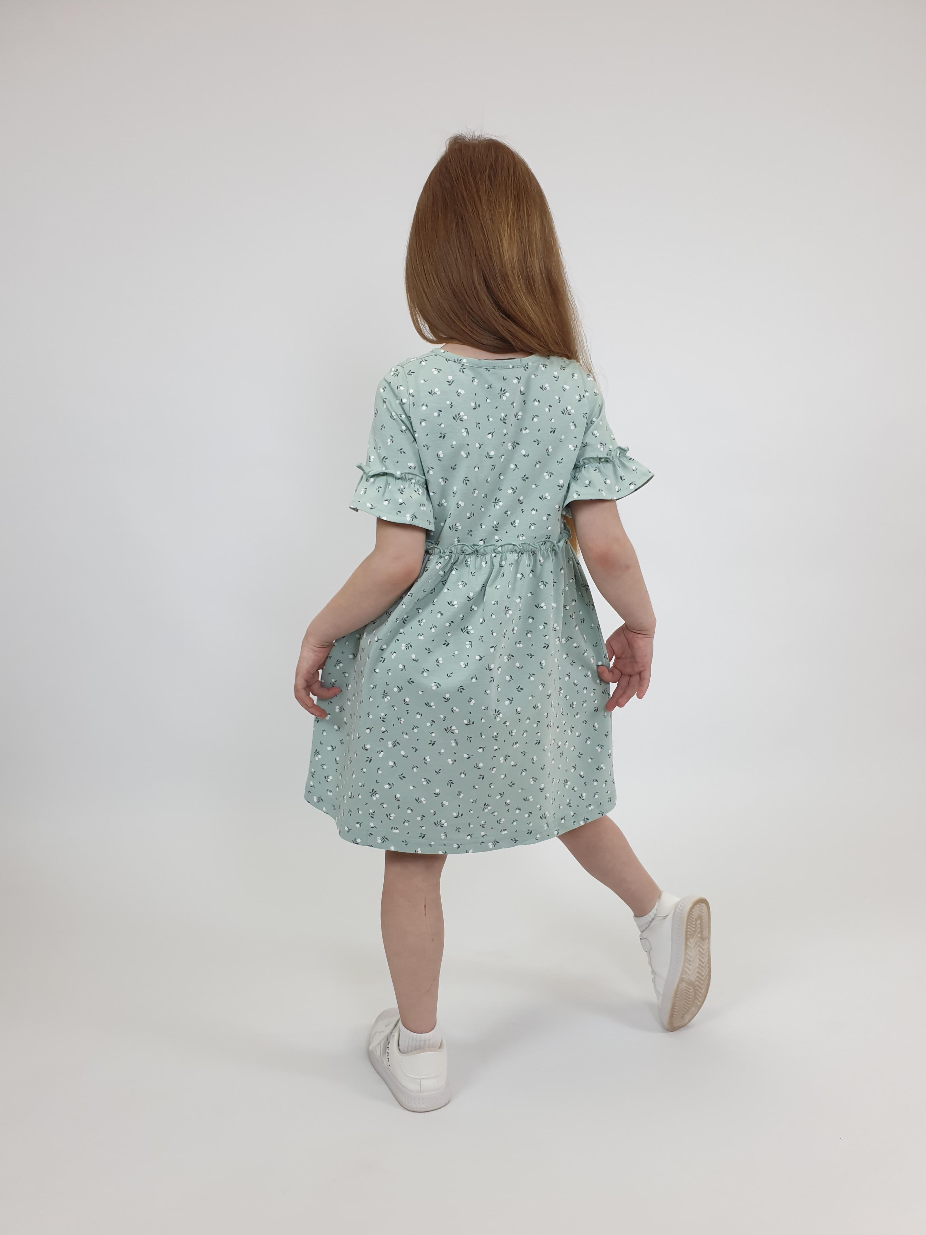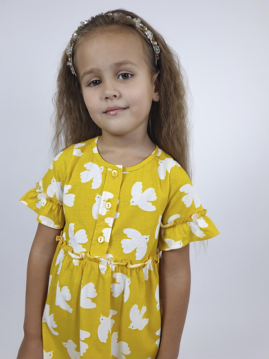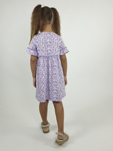 Кулирное полотно (набивка):100% х/б. Платье-силуэт трапеция,перед и спинка с кокеткой,юбка со сборкой.Рукав короткий с рюшей.Застежка по переду,на пуговицы.Горловина окантована.