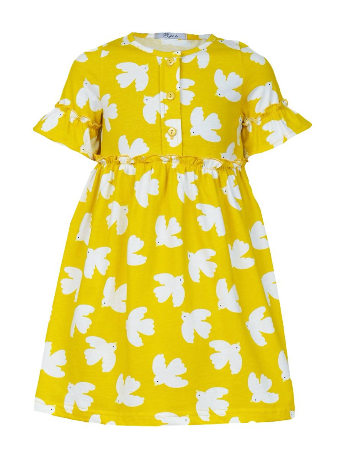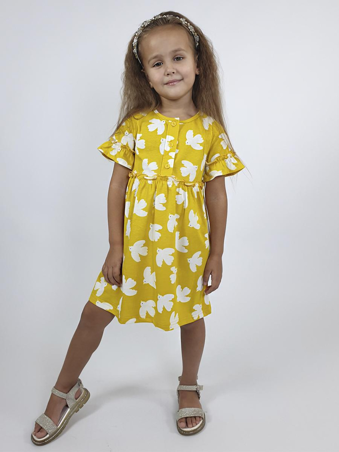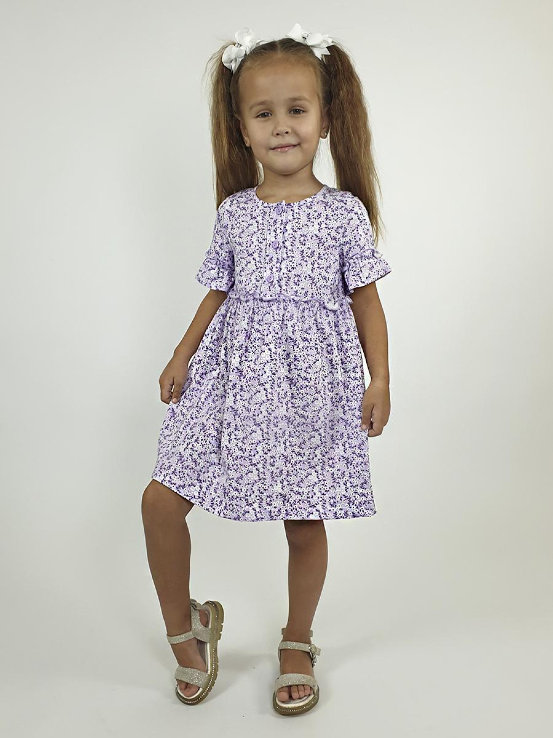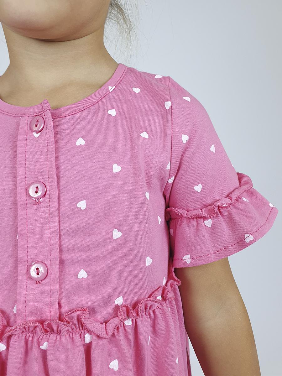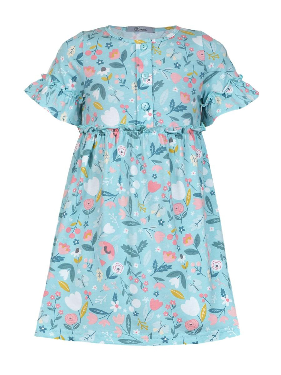 Кулирное полотно (набивка):100% х/б. Платье-силуэт трапеция,перед и спинка с кокеткой,юбка со сборкой.Рукав короткий с рюшей.Застежка по переду,на пуговицы.Горловина окантована.
