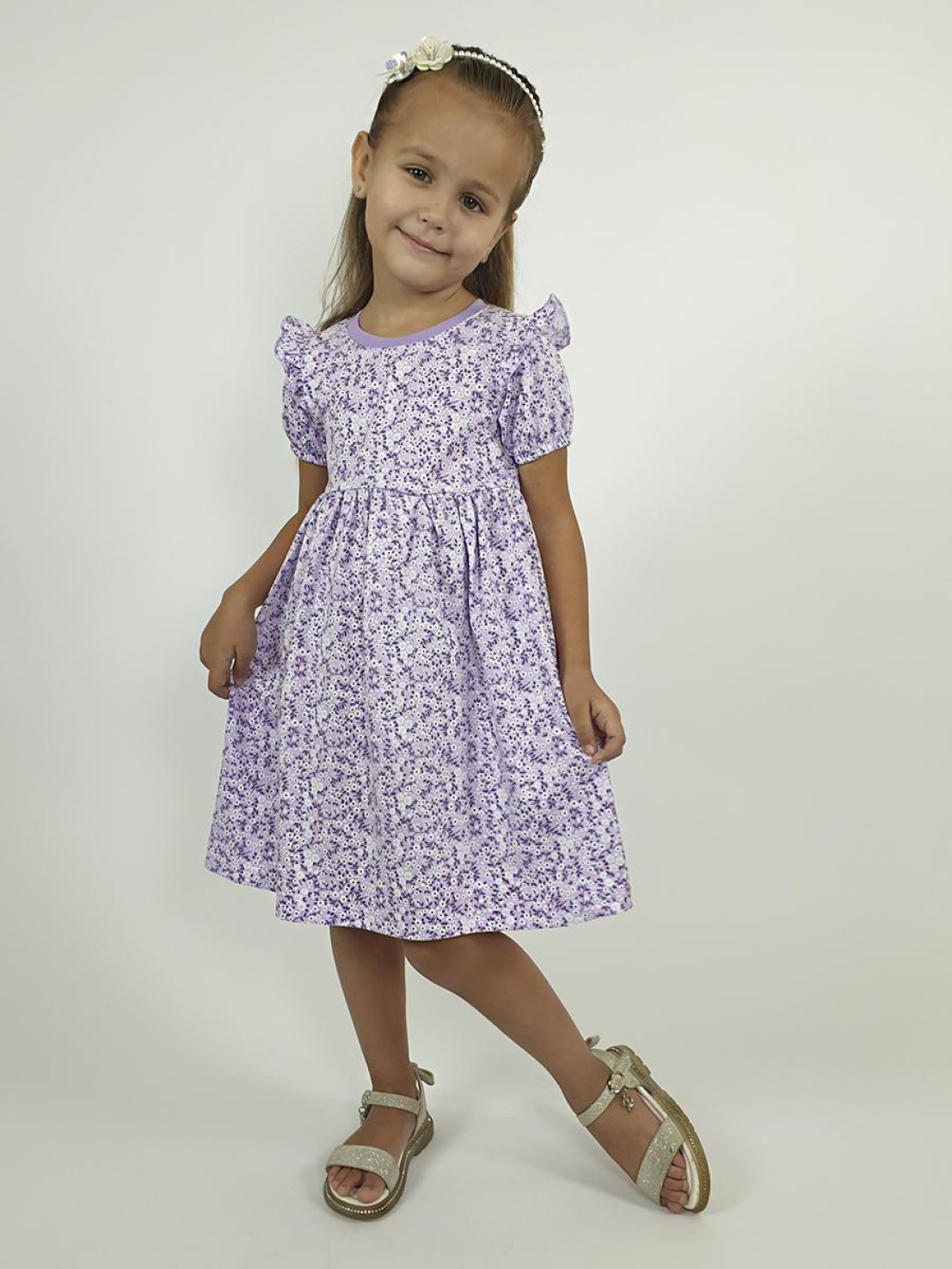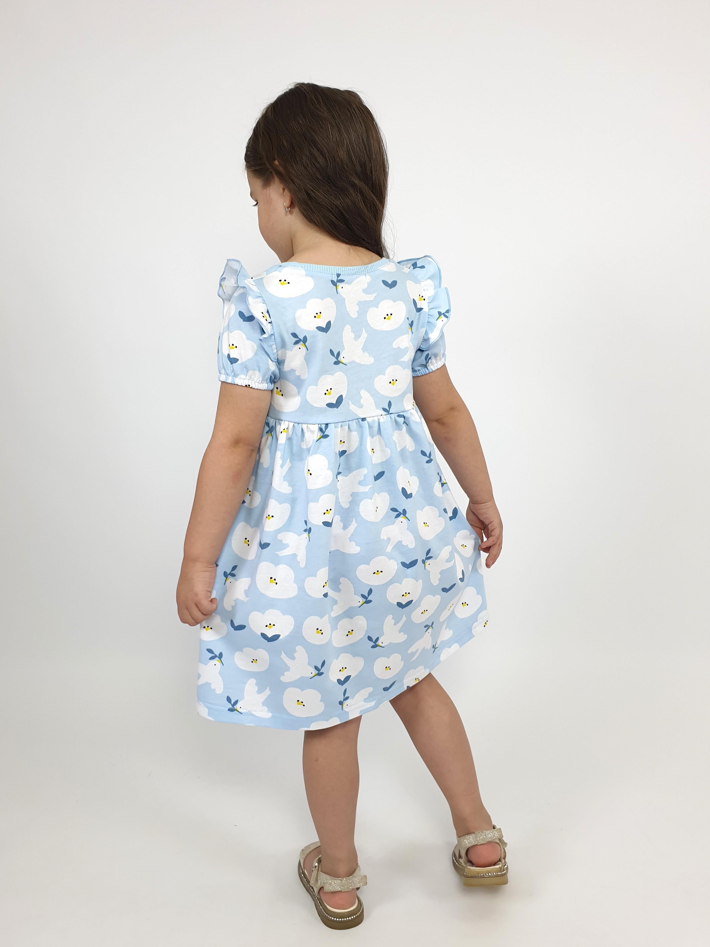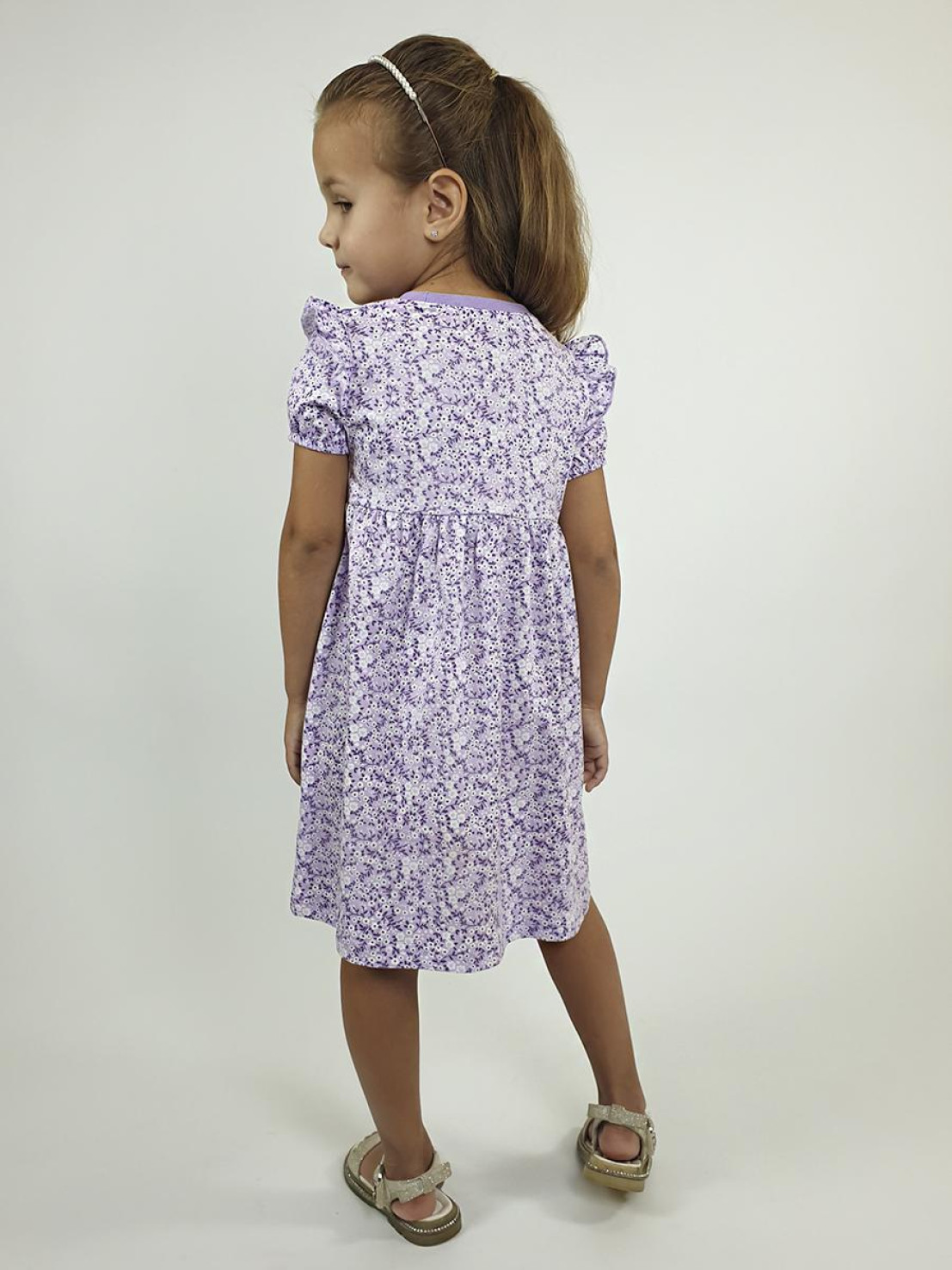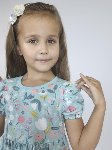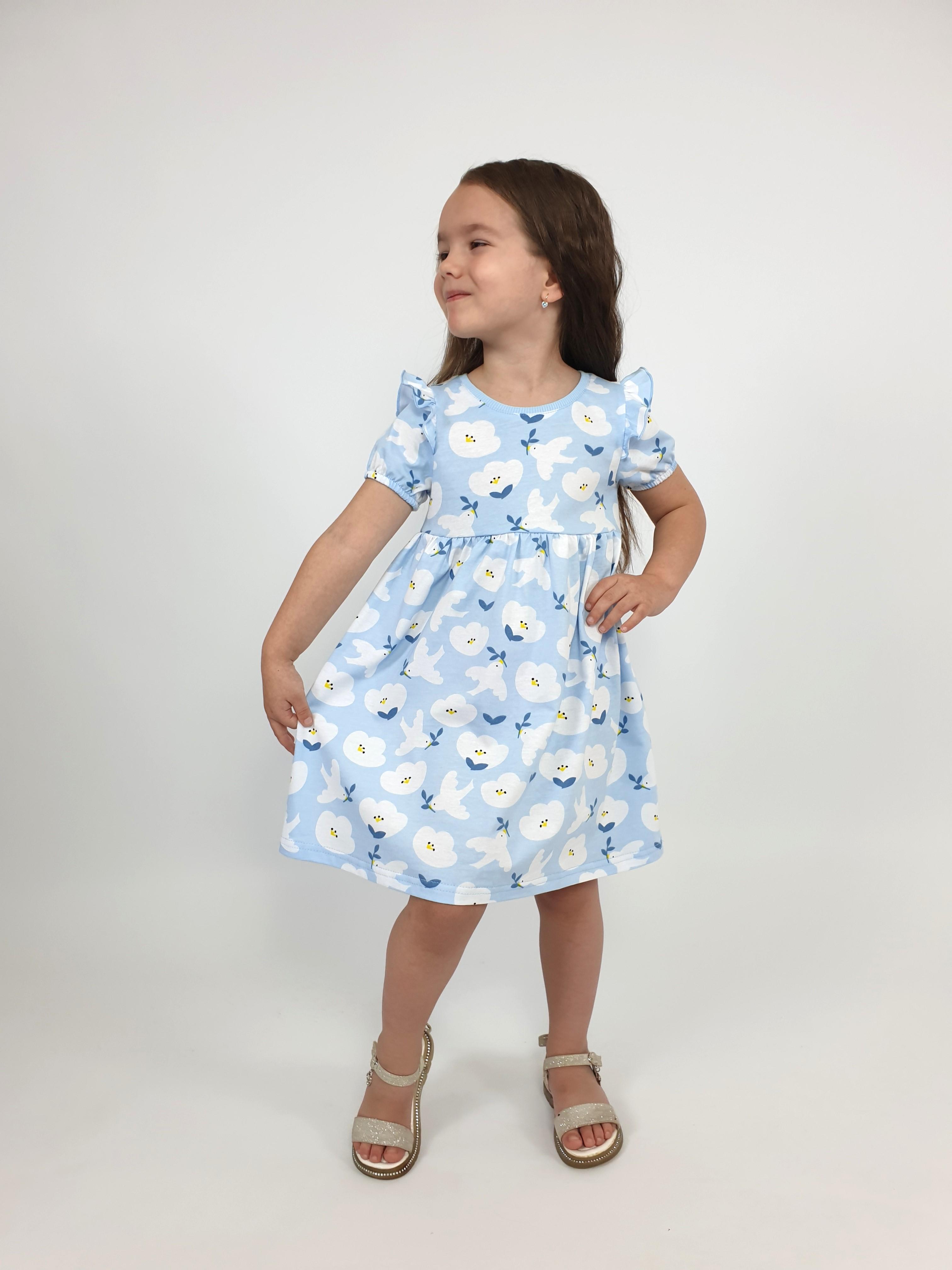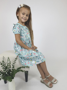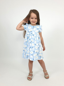 Кулирное полотно:100% х/б. Платье-перед и спинка с кокеткой,сборка по верху юбки.Рукав короткий,внизу собран на резинку,в пройме рюша.Горловина обработана ластиком.