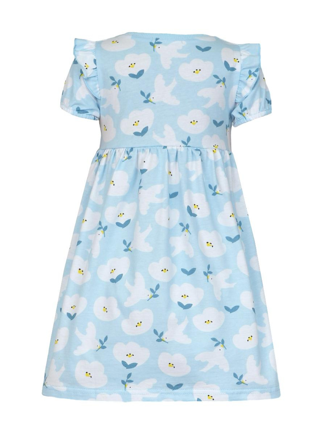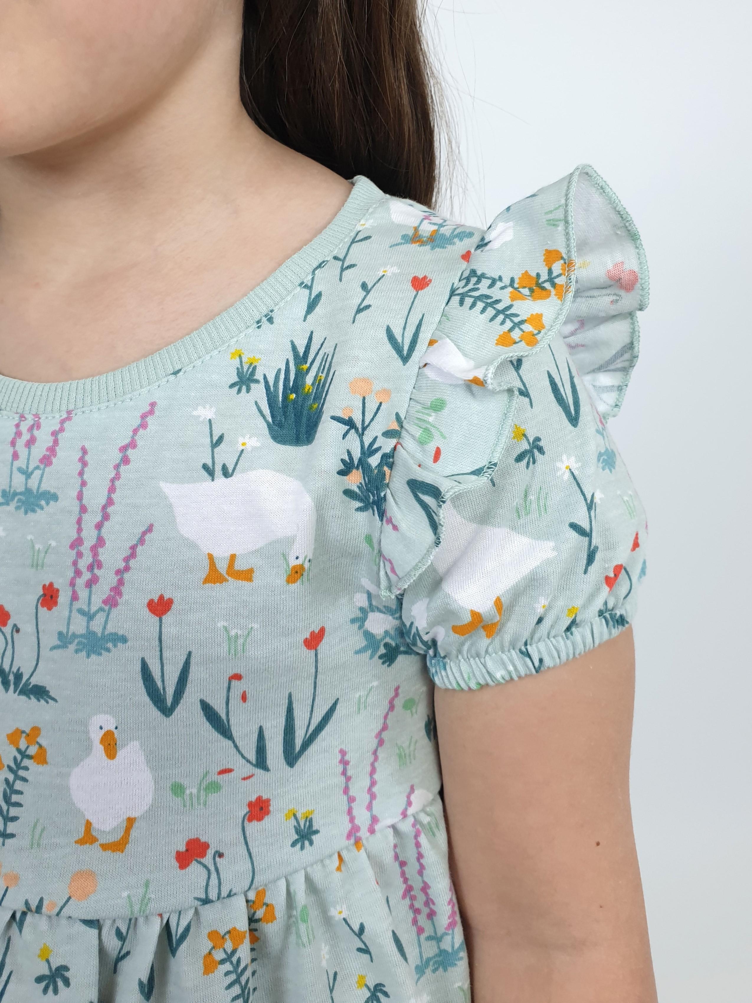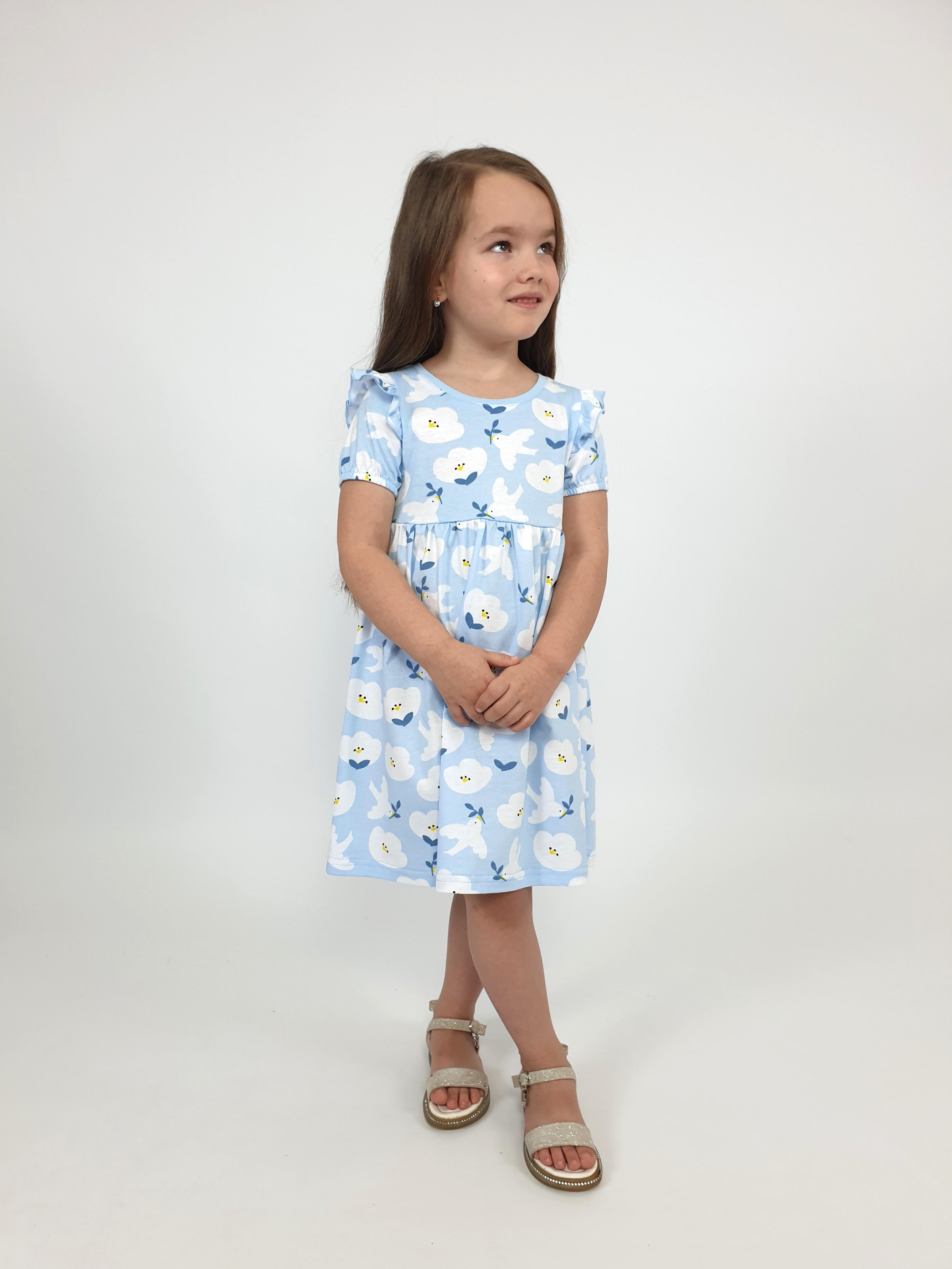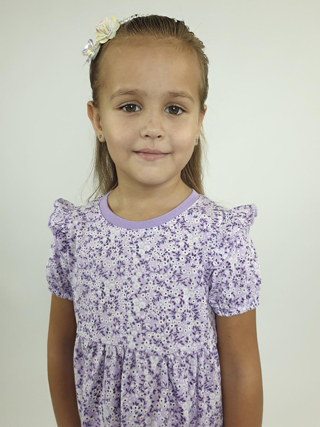 Кулирное полотно:100% х/б. Платье-перед и спинка с кокеткой,сборка по верху юбки.Рукав короткий,внизу собран на резинку,в пройме рюша.Горловина обработана ластиком.