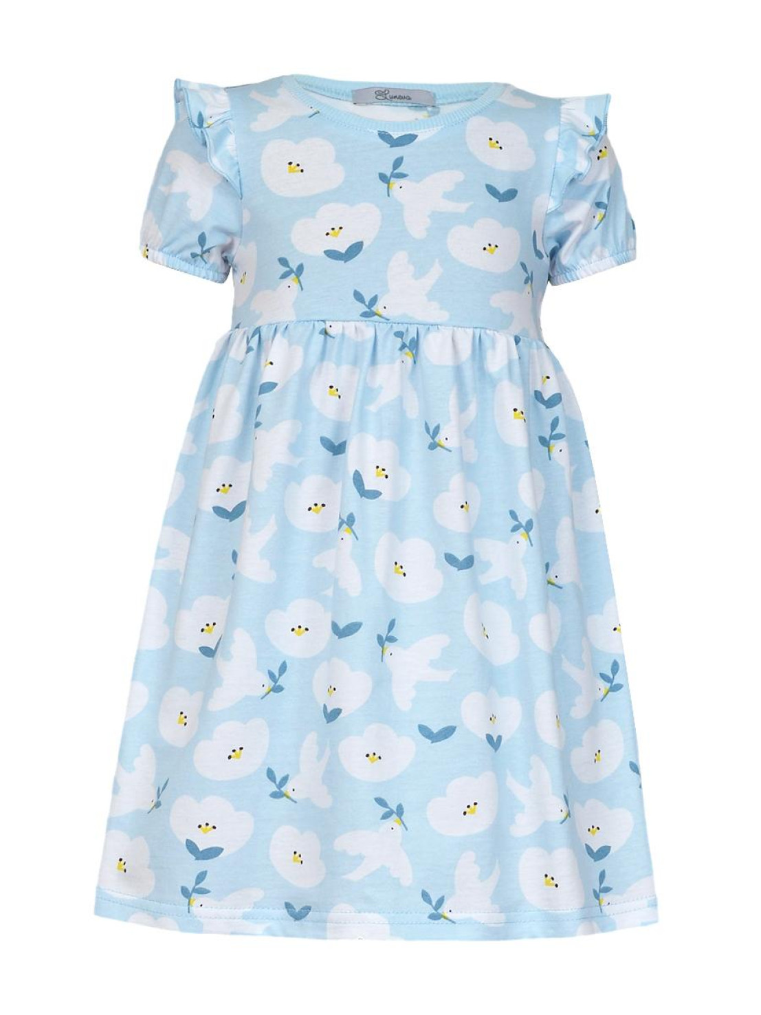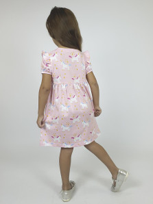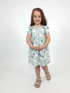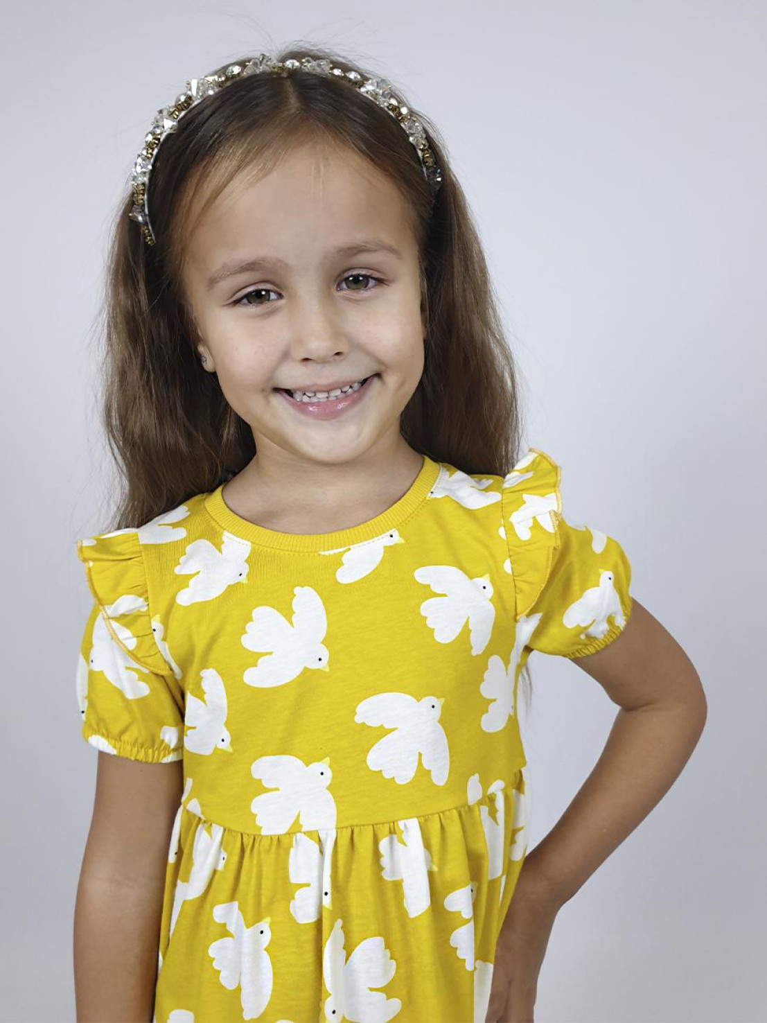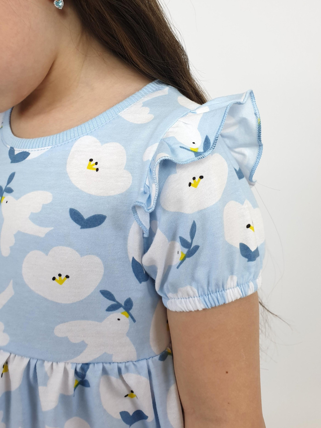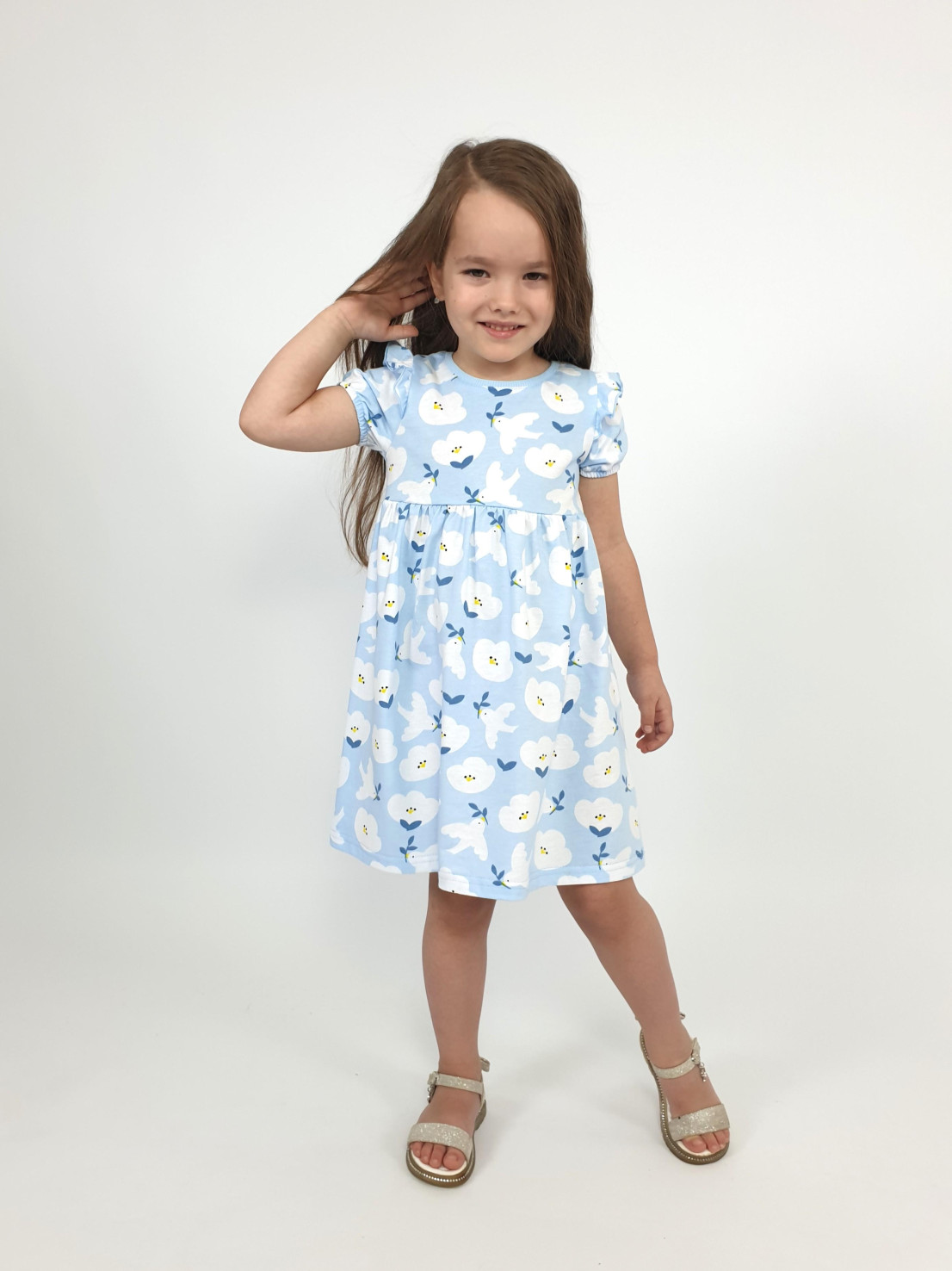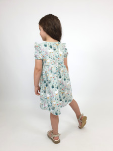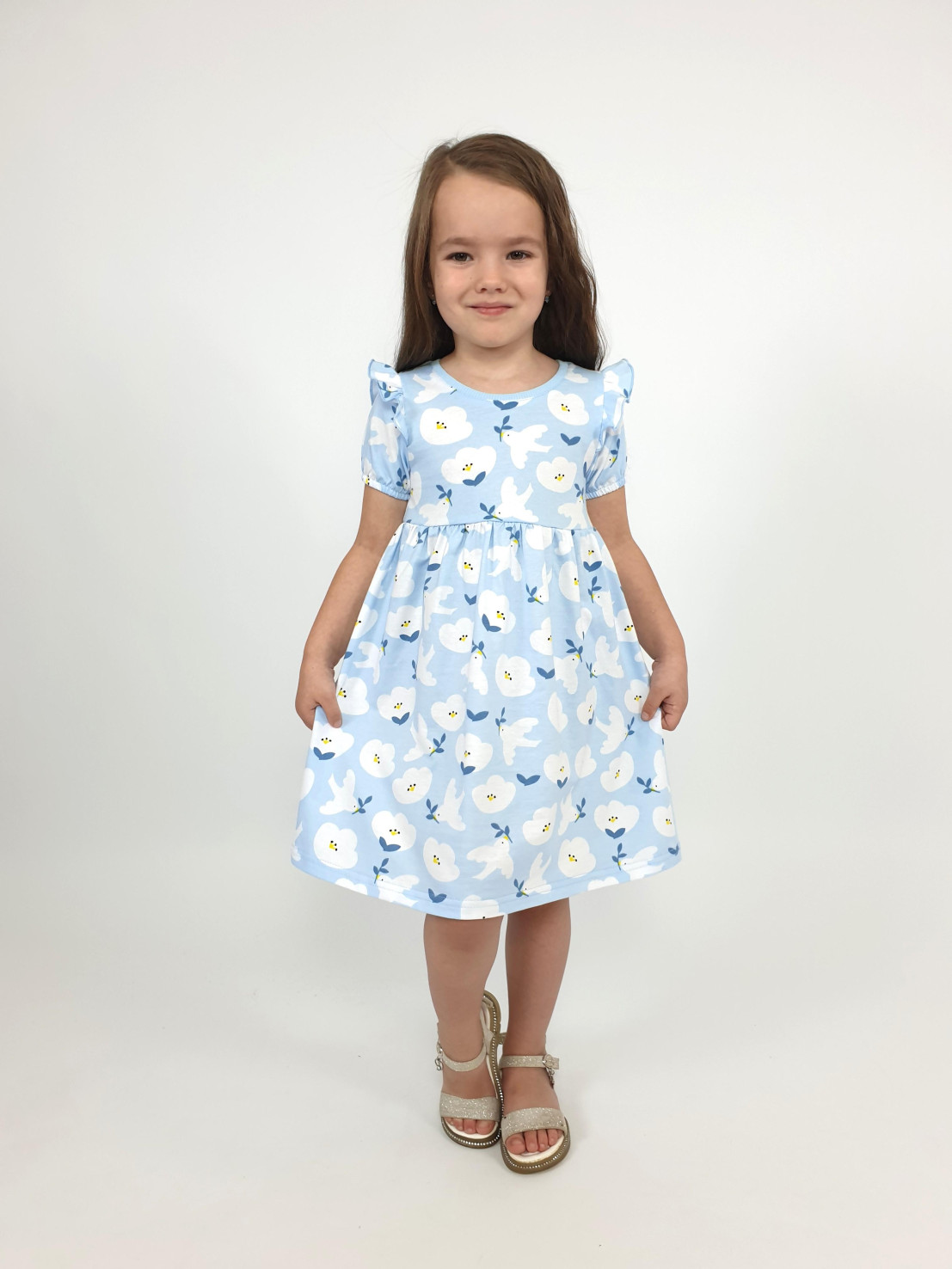 Кулирное полотно:100% х/б. Платье-перед и спинка с кокеткой,сборка по верху юбки.Рукав короткий,внизу собран на резинку,в пройме рюша.Горловина обработана ластиком.