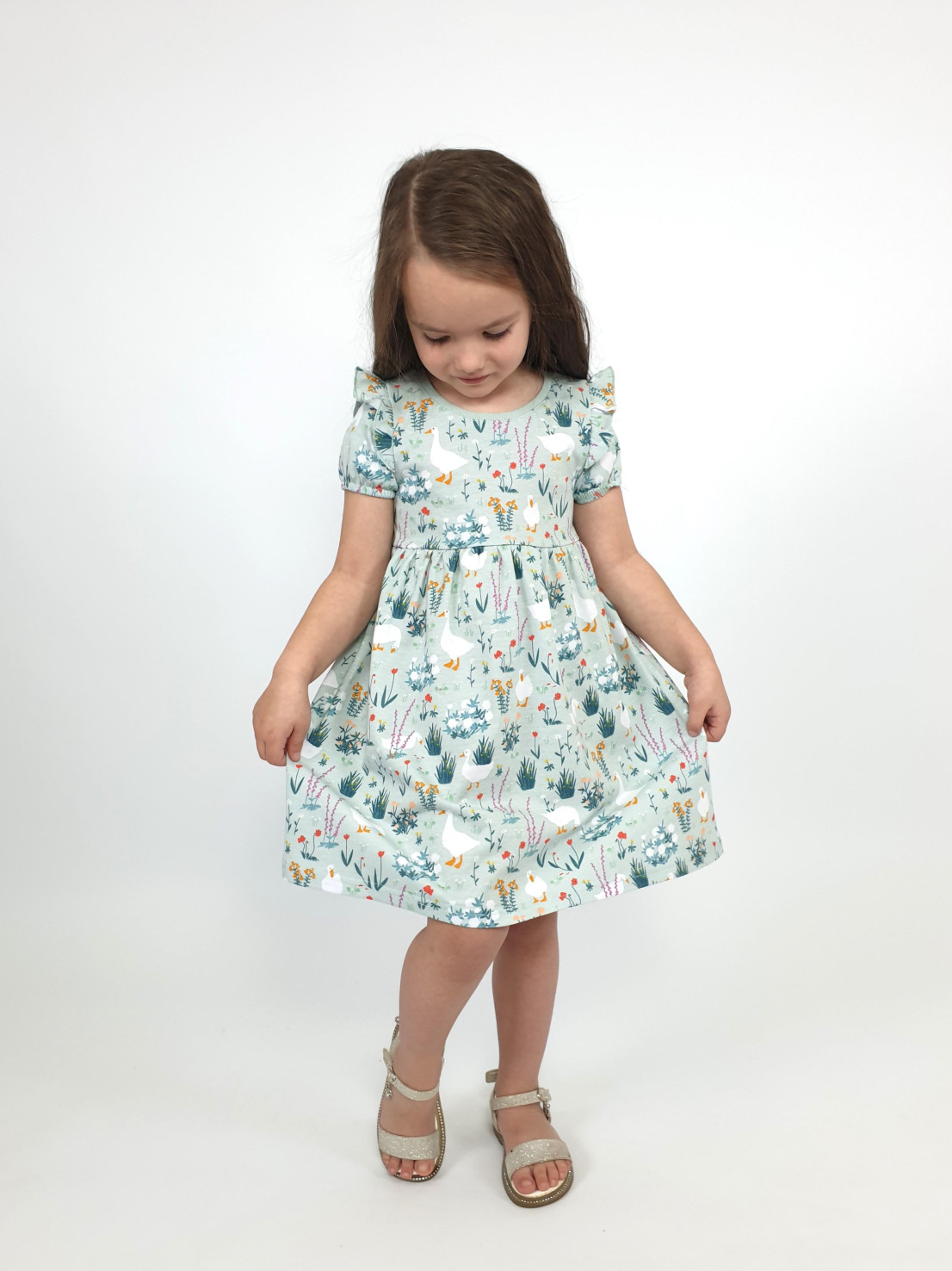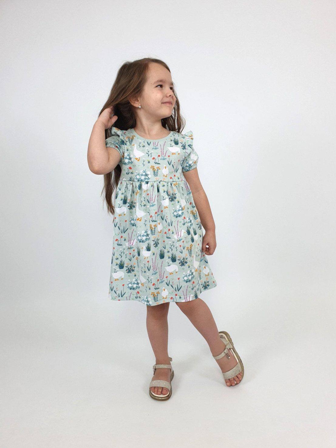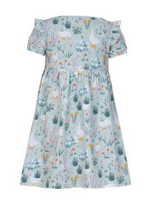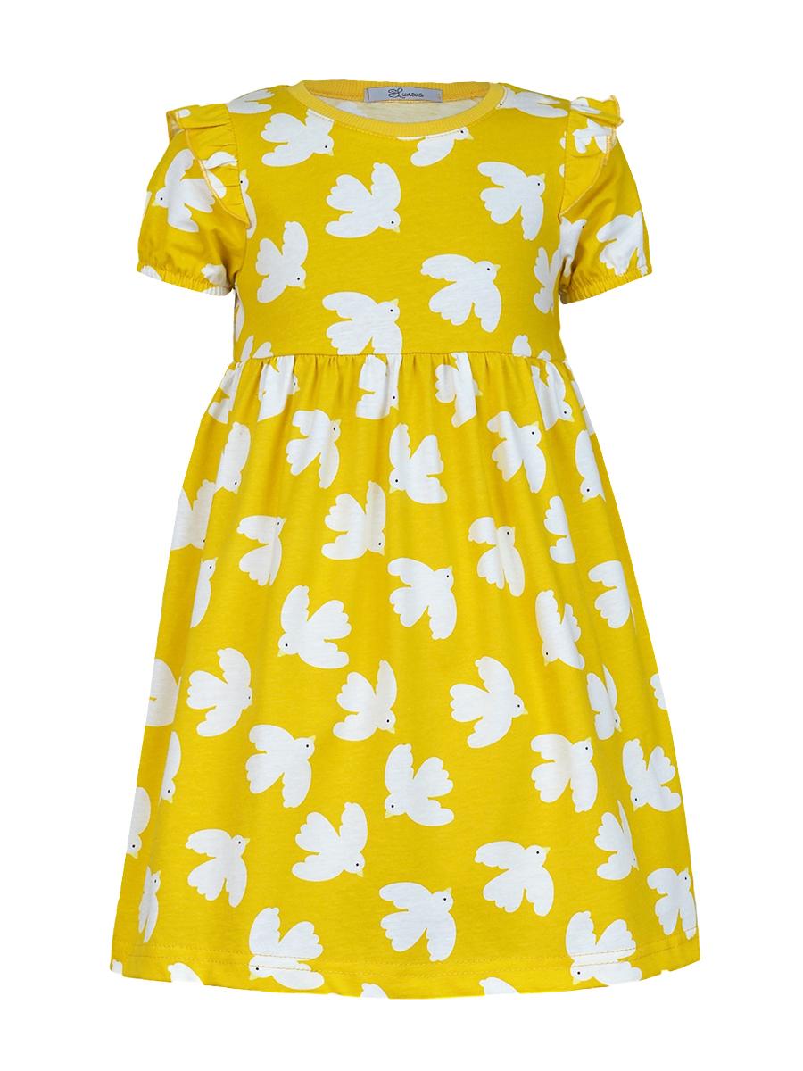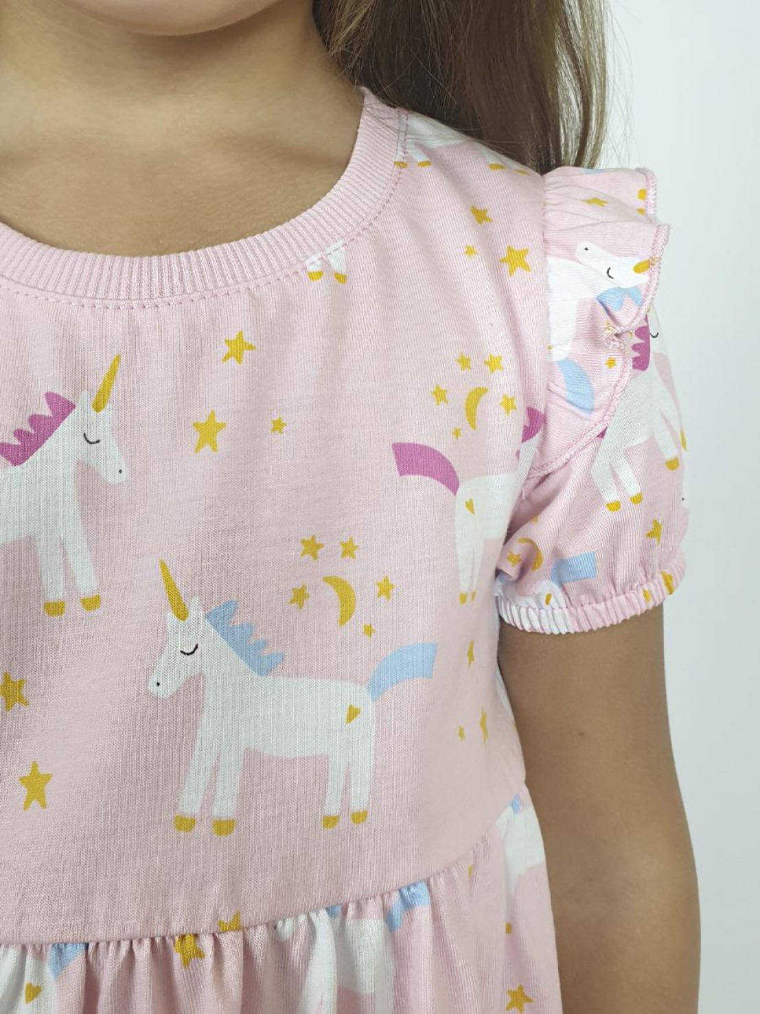 Кулирное полотно:100% х/б. Платье-перед и спинка с кокеткой,сборка по верху юбки.Рукав короткий,внизу собран на резинку,в пройме рюша.Горловина обработана ластиком.