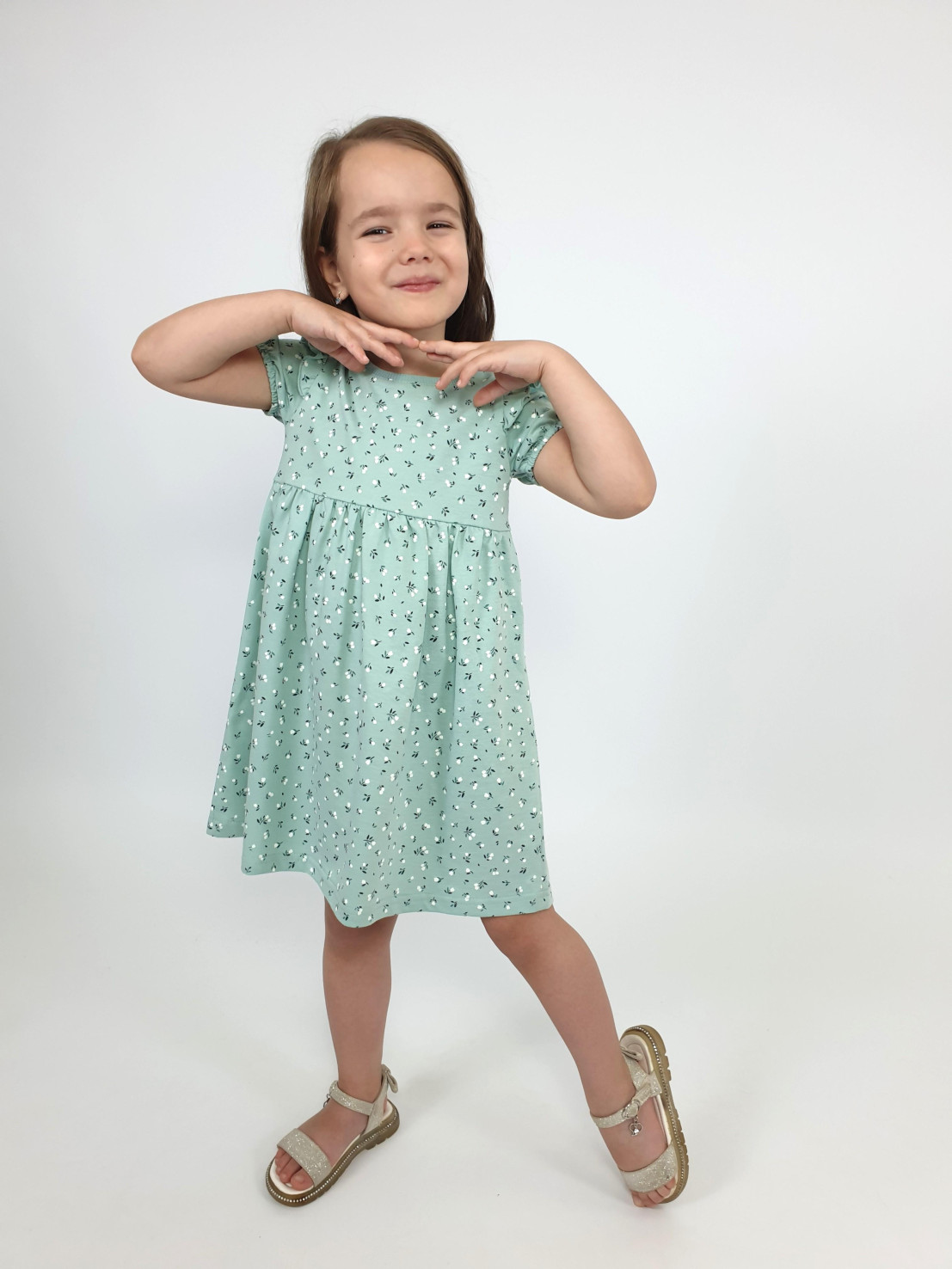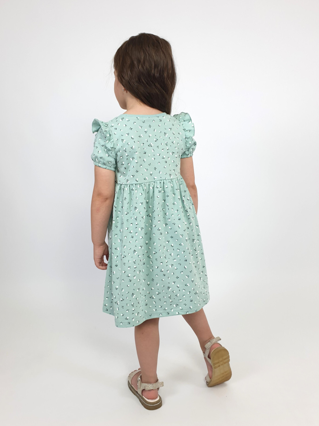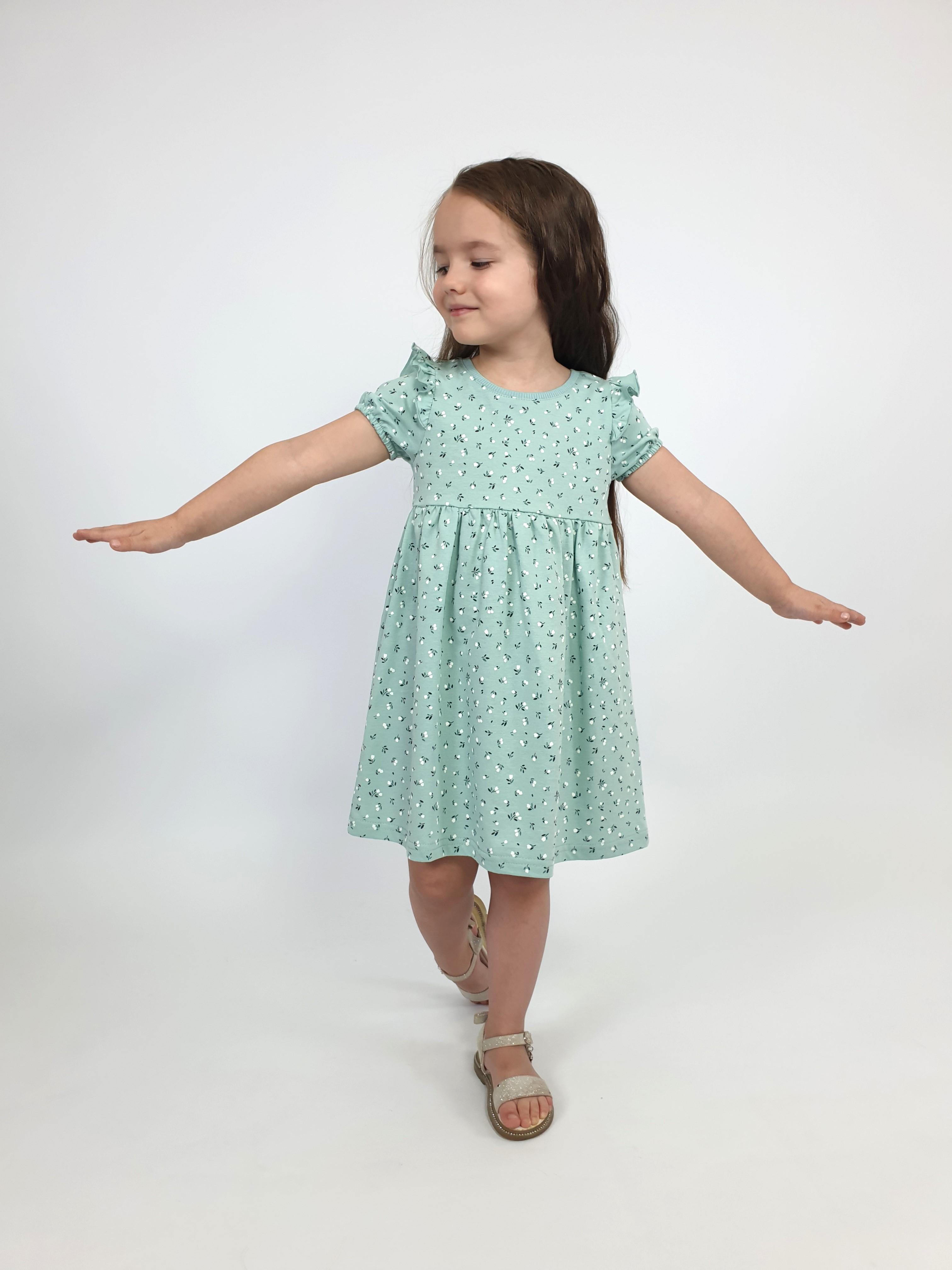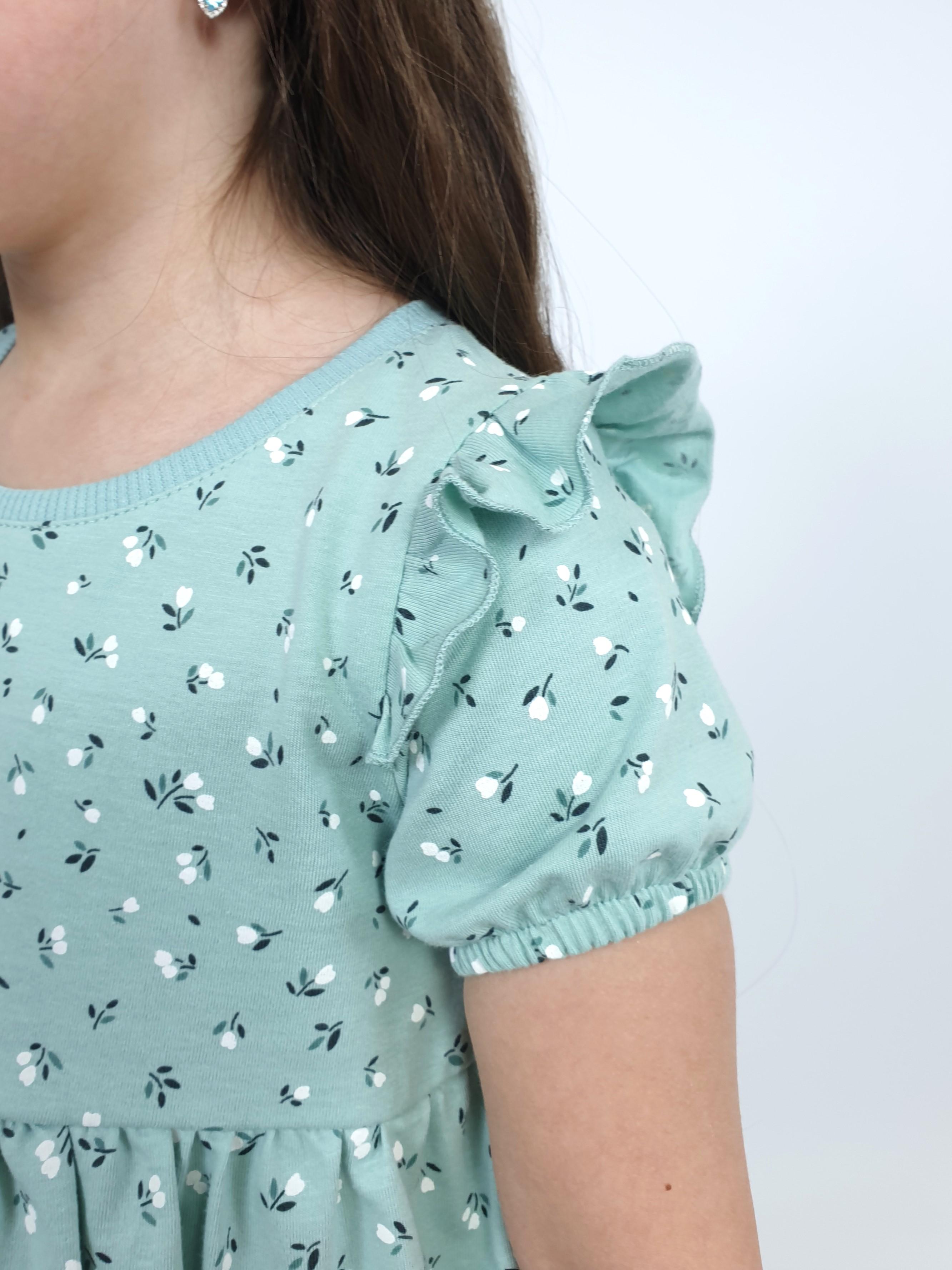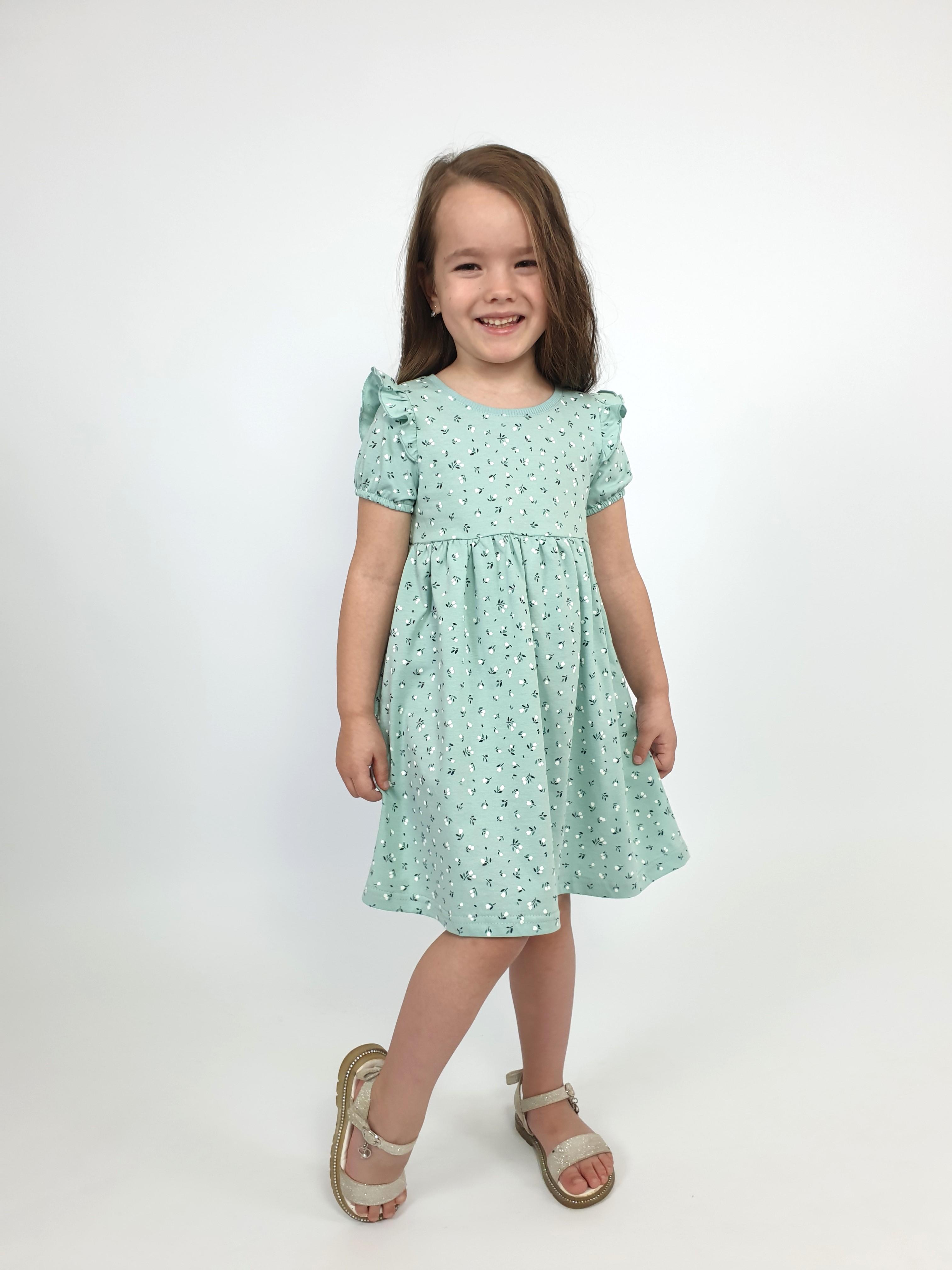 Кулирное полотно:100% х/б. Платье-перед и спинка с кокеткой,сборка по верху юбки.Рукав короткий,внизу собран на резинку,в пройме рюша.Горловина обработана ластиком.