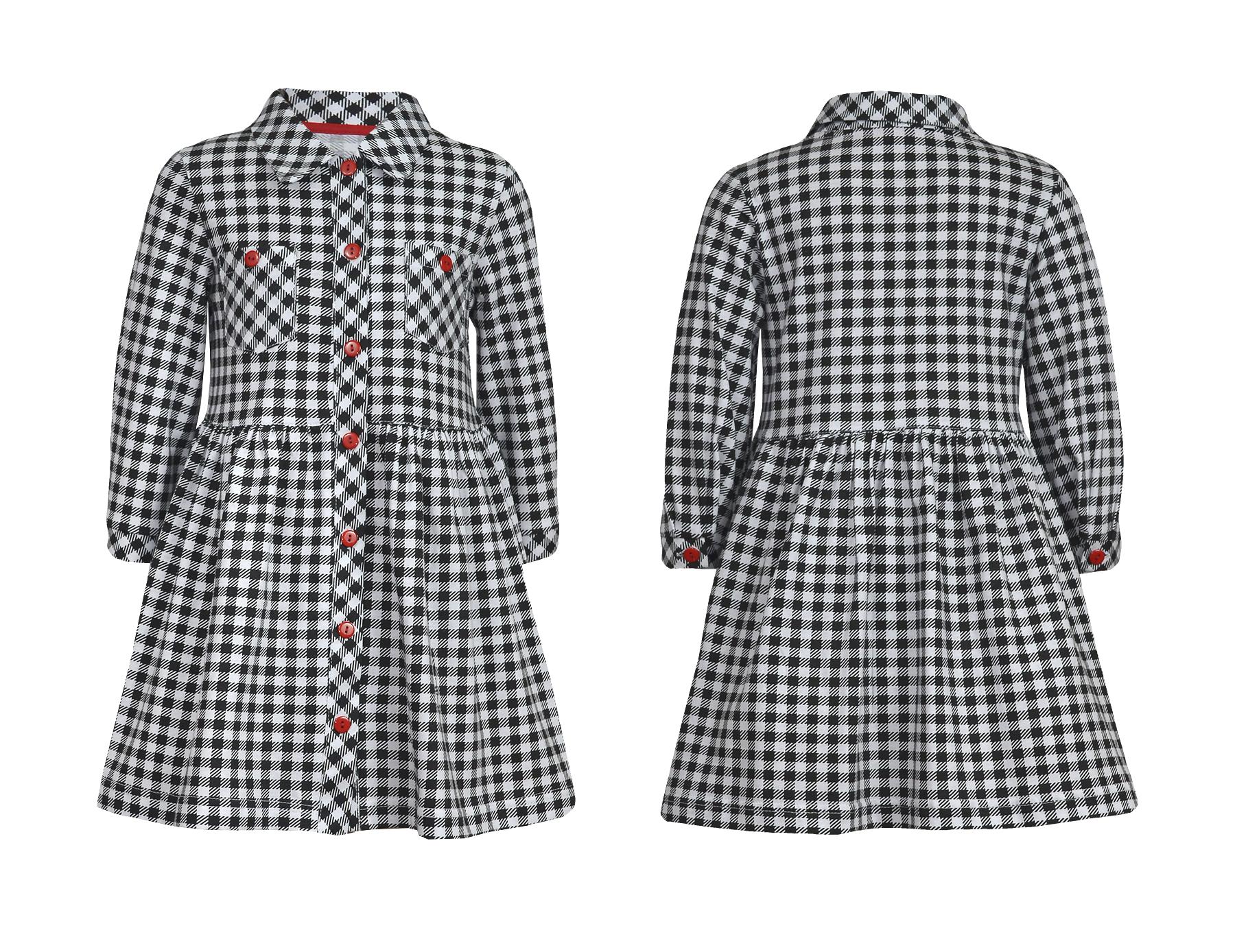 Кулирное полотно:100% х/б. Платье -отрезное по талии,рукав 3/4 на манжете с застежкой на пуговицу.Застежка центральная-планка с пуговицами.Воротник-рубашечный,два кармана с отделочными пуговицами на переде.Юбка со сборкой,внизу подшита.Шов втачивания воротника окантован.