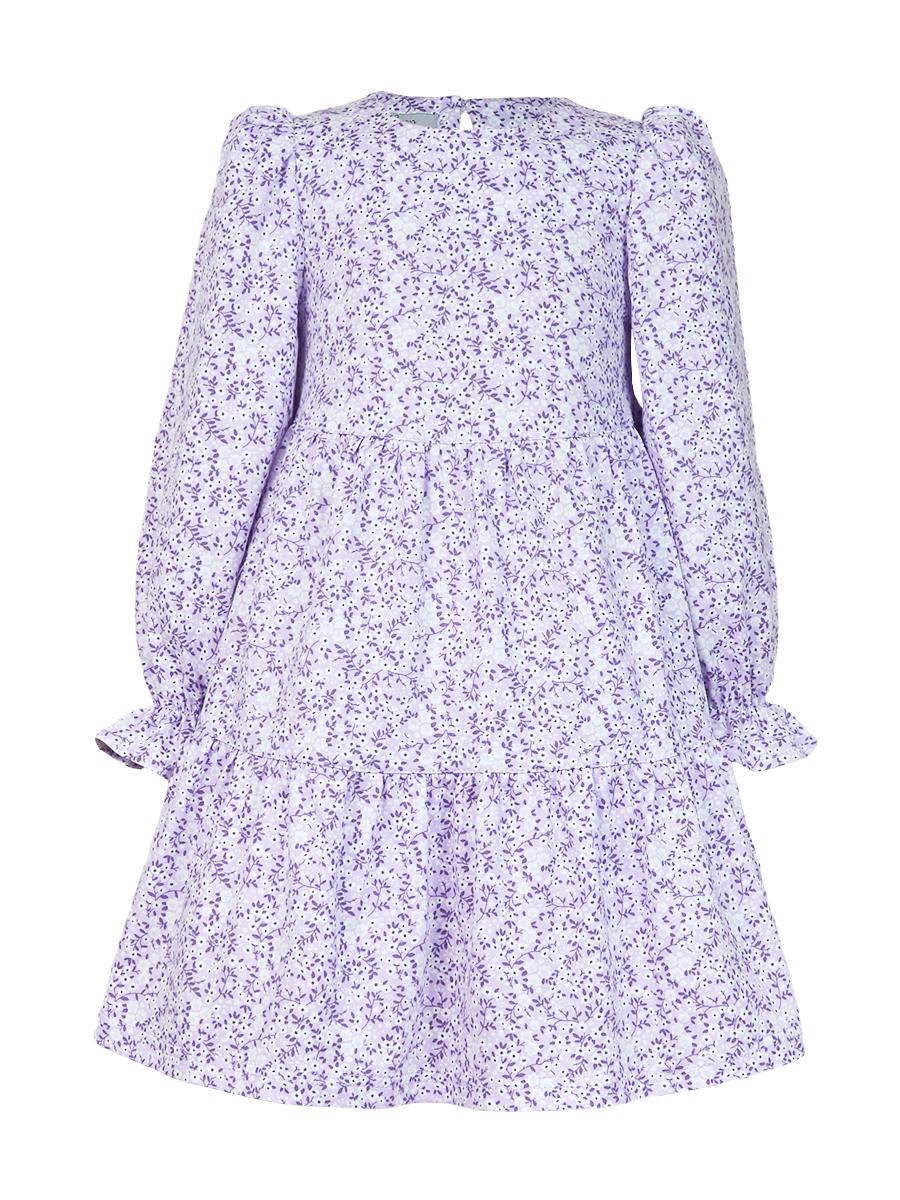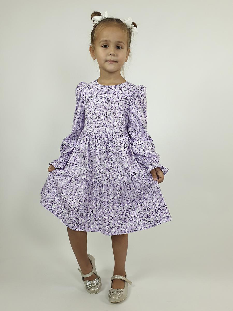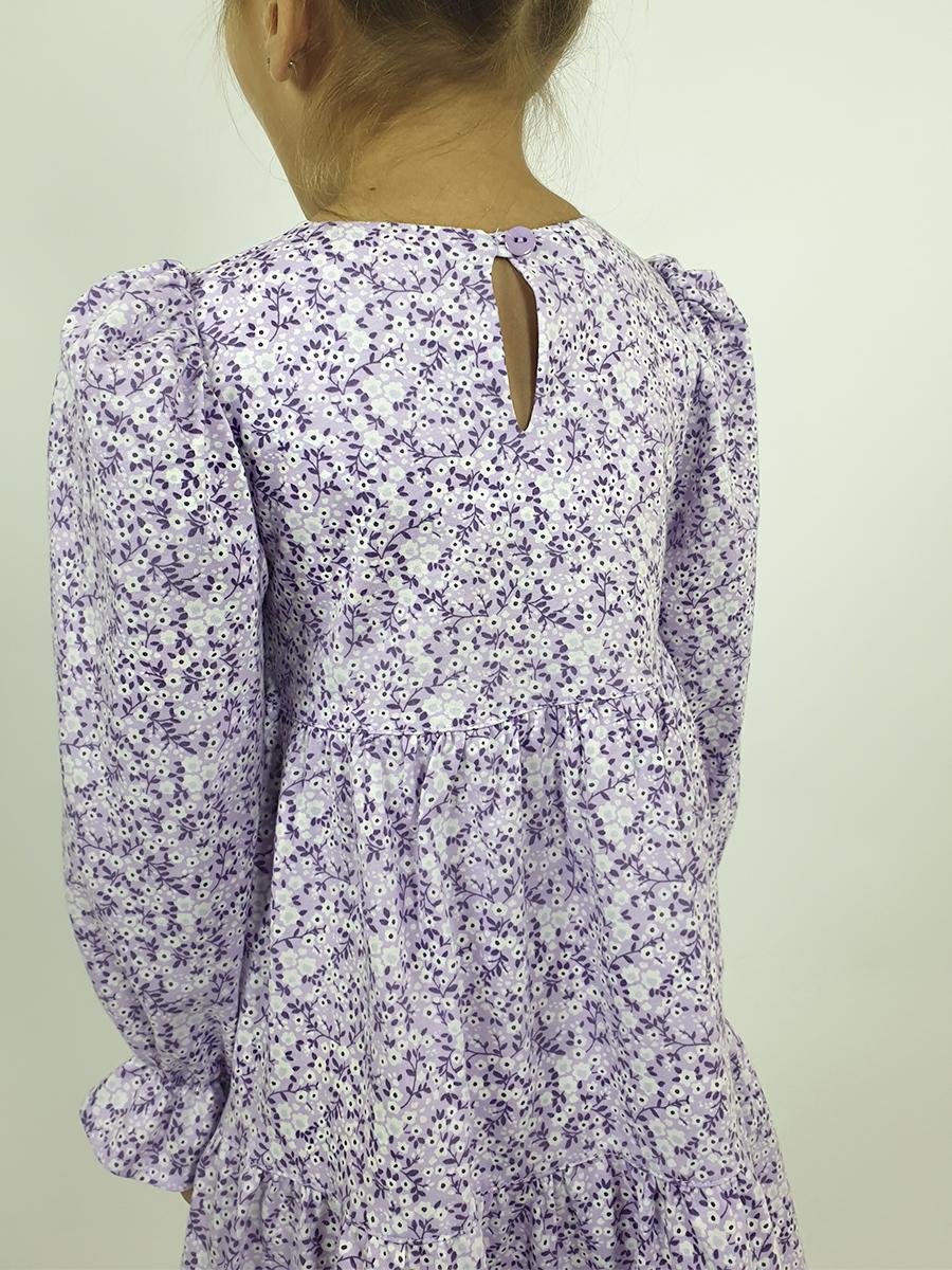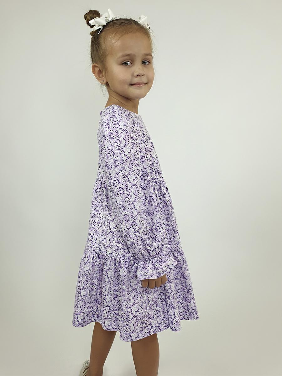 Кулирное полотно:100% х/б. Платье-силуэт трапеция,длинный втачной рукав сборка по окату,внизу собран на резинку.Юбка переда и спинки из двух воланов.Горловина обработана обтачкой,застежка на пуговицу по спинке.