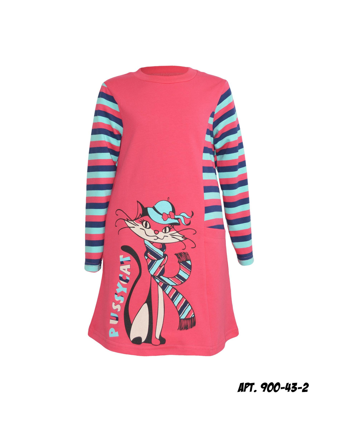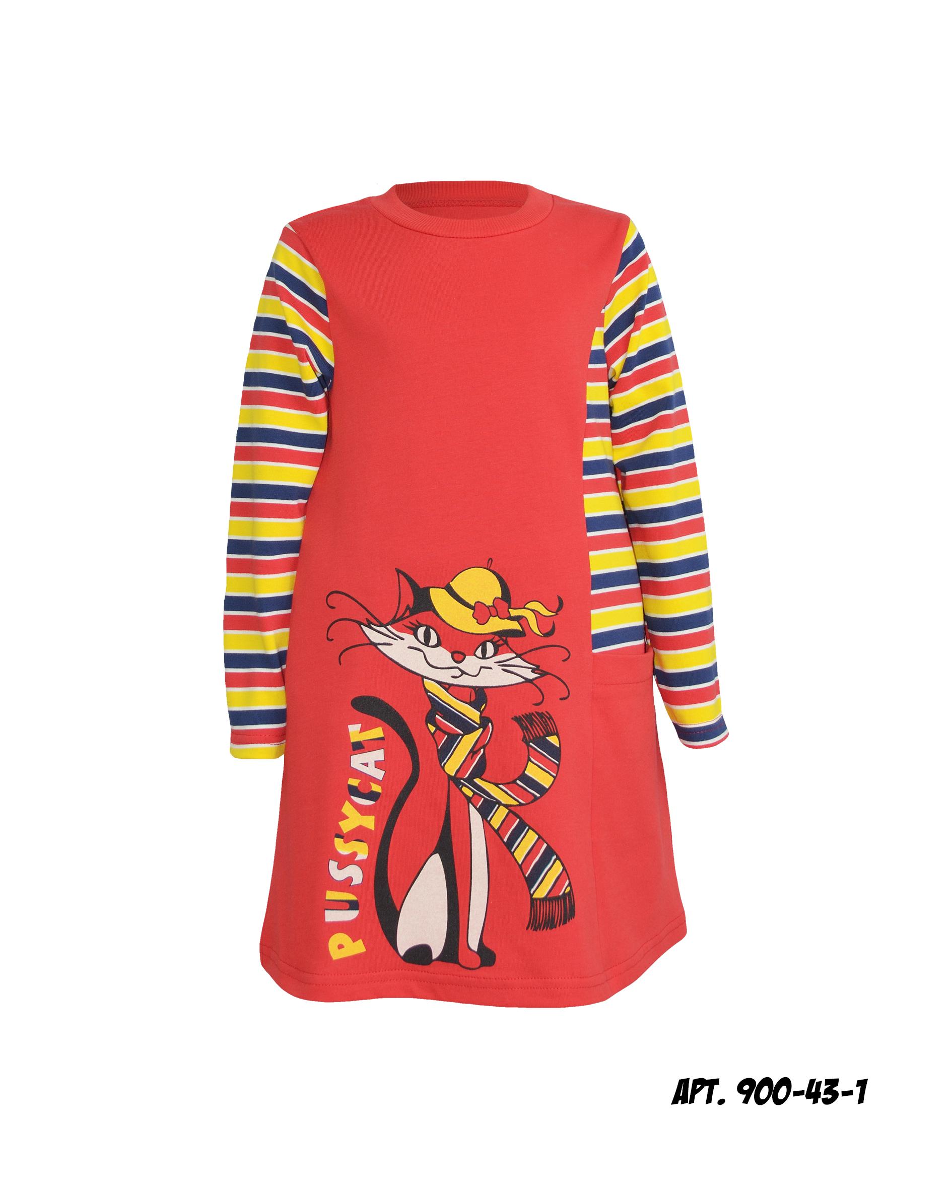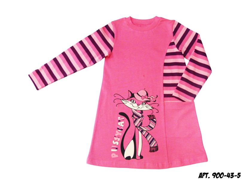 Платье. Кулирное полотно, 100% х/б (сочетание полосы и глади). Силуэт трапеция. Перед с печатью, подрезом с левой стороны, в подрезе карман. Рукав втачной длинный. Горловина обработана ластиком.