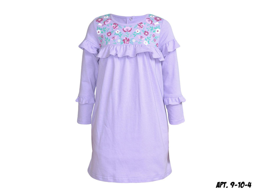 Трикотажное плолтно:100% х/б.Платье-силуэт трапеция, втачной длинный рукв с рюшами. Перед с кокеткой, печатью и рюшей из под кокетки. Застежка по спинке-планка с кнопками. Горловина окантована.