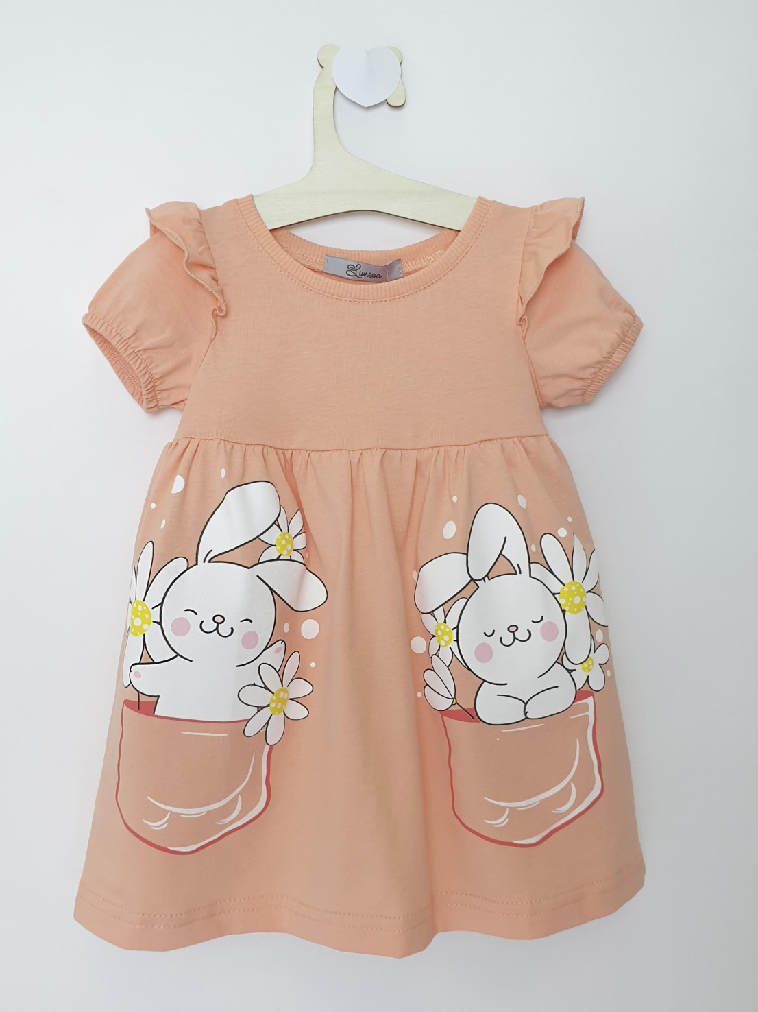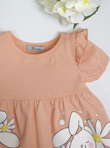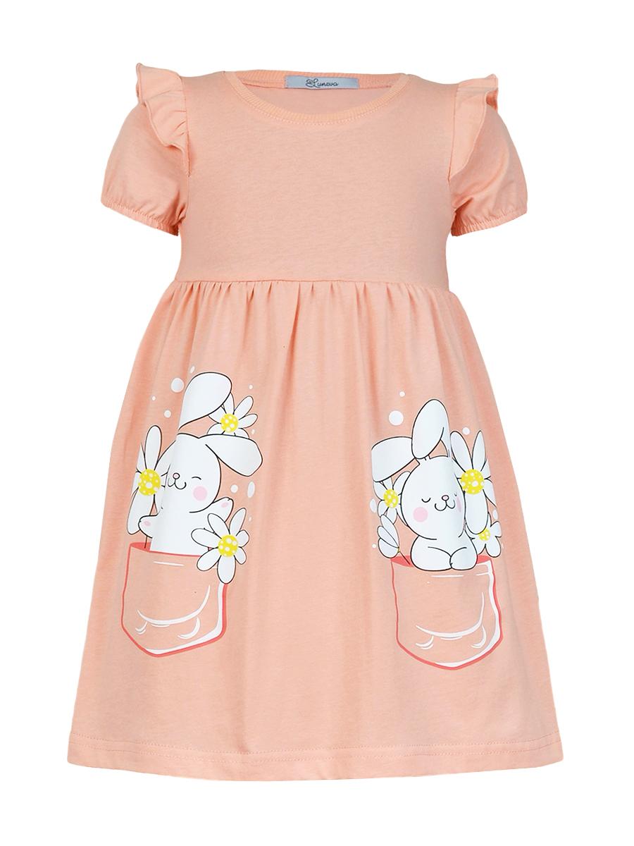 Кулирное полотно:100% х/б. Платье-перед и спинка с кокеткой,сборка по верху юбки.Рукав короткий,внизу собран на резинку,в пройме рюша.Горловина обработана ластиком.Печать на переднем полотнище юбки.
