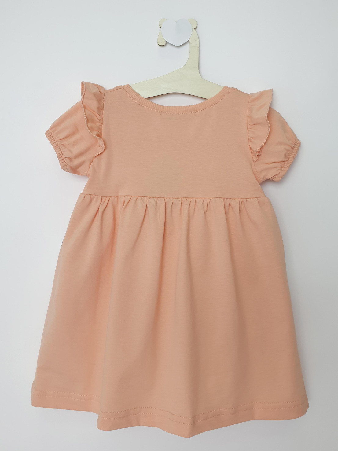 Кулирное полотно:100% х/б. Платье-перед и спинка с кокеткой,сборка по верху юбки.Рукав короткий,внизу собран на резинку,в пройме рюша.Горловина обработана ластиком.Печать на переднем полотнище юбки.