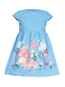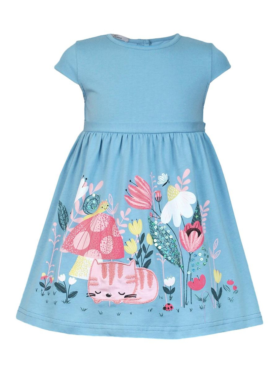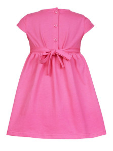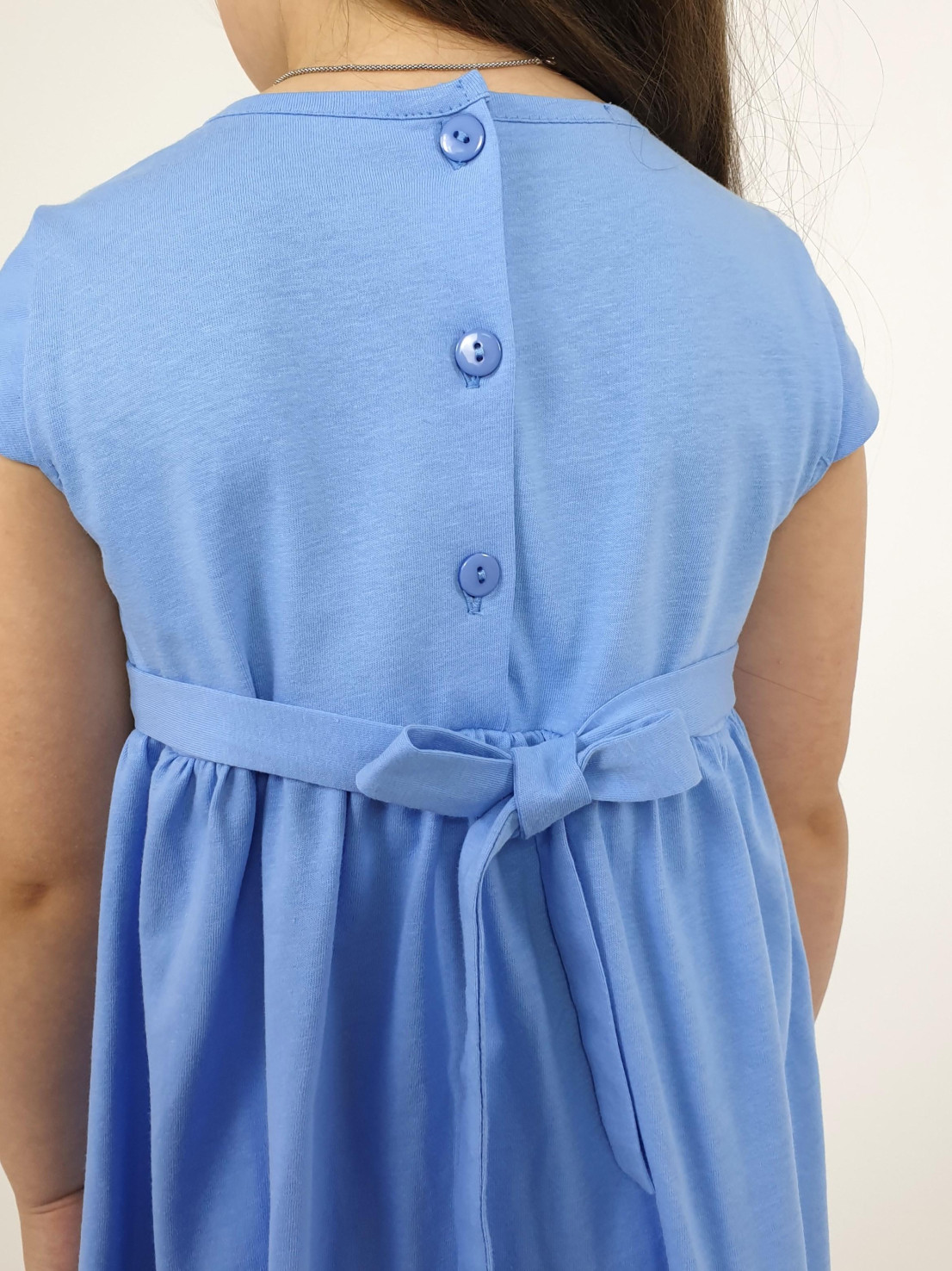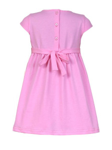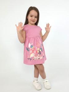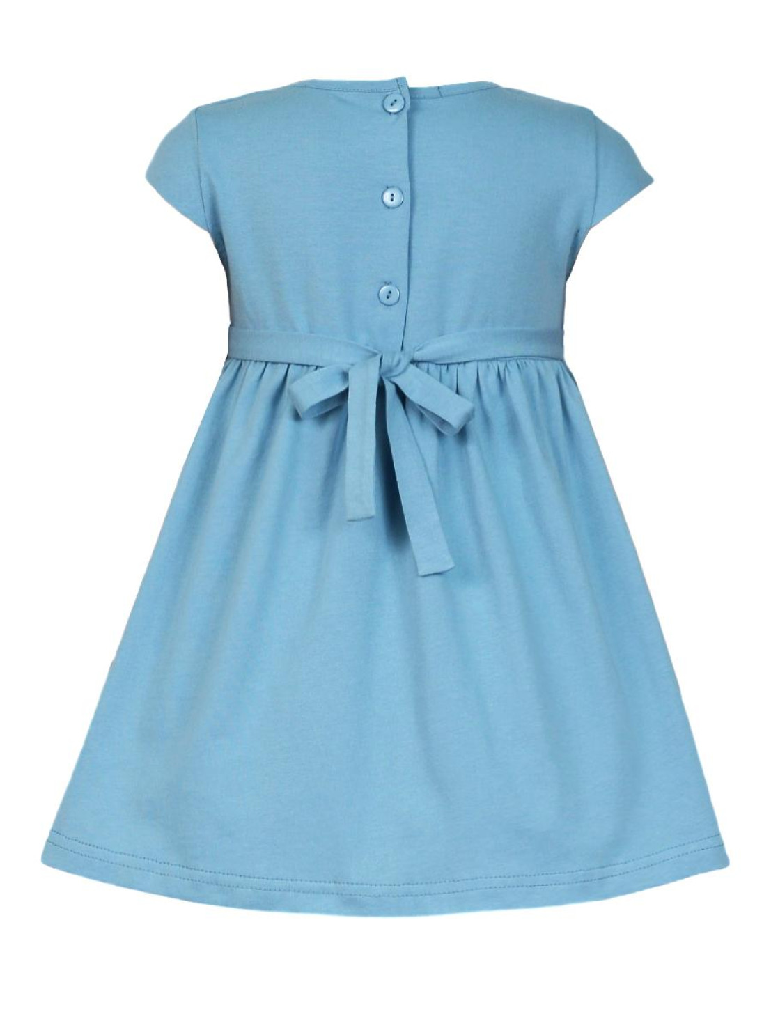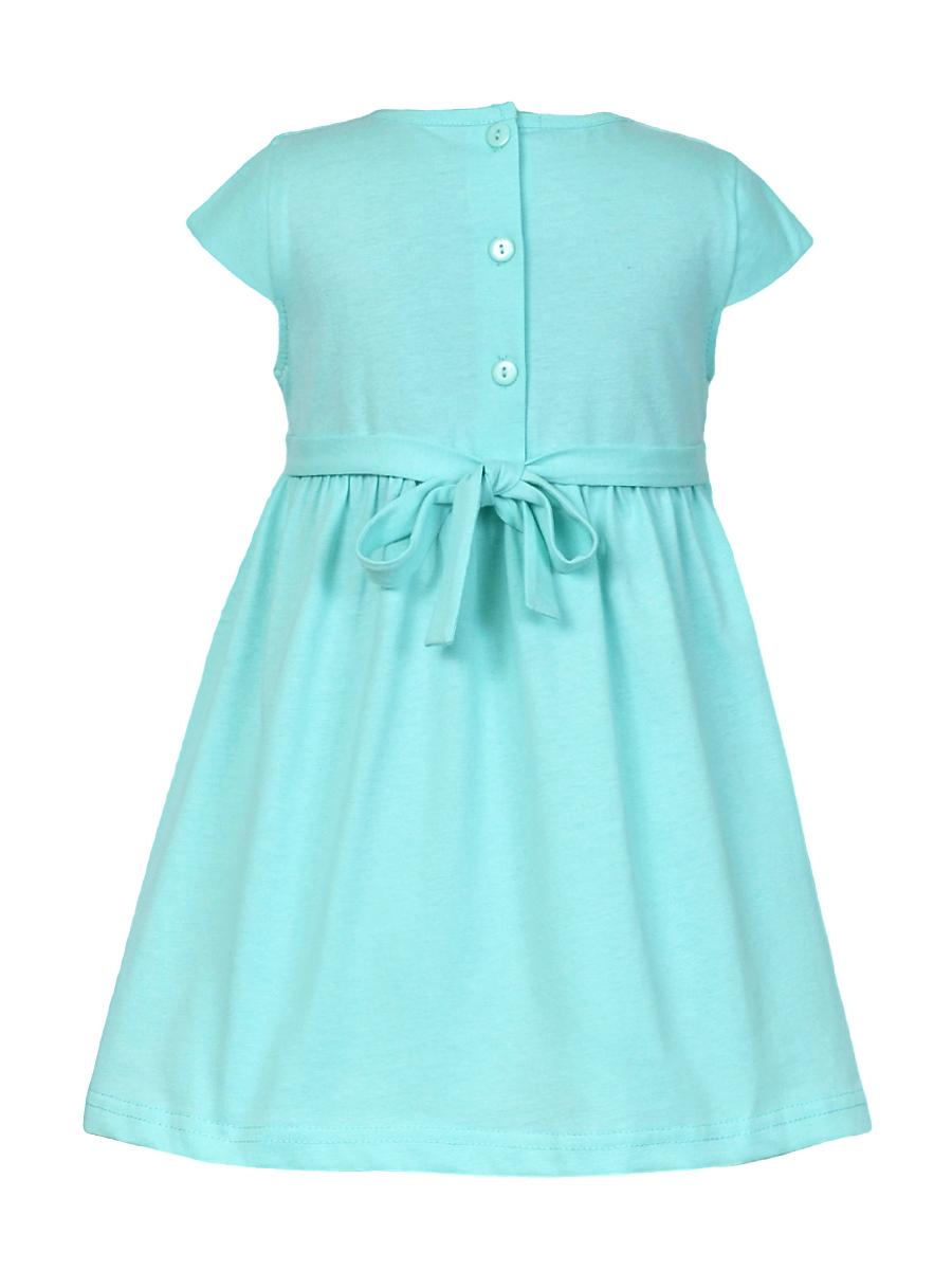Кулирное полотно:100% х/б. Платье-силуэт трапеция с завышенной линией талии на кокетке.Застежка по кокетке спинки на пуговицы.Горловина окантована.Юбка со сборкой,переднее полотнище юбки с печатью и вышивкой.Между кокеткой и юбкой переда втачан декоративный пояс,переходящий на спинку в завязывающийся.Рукав короткий.