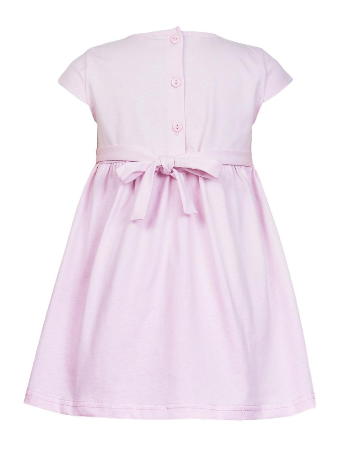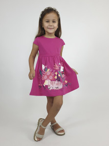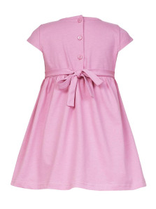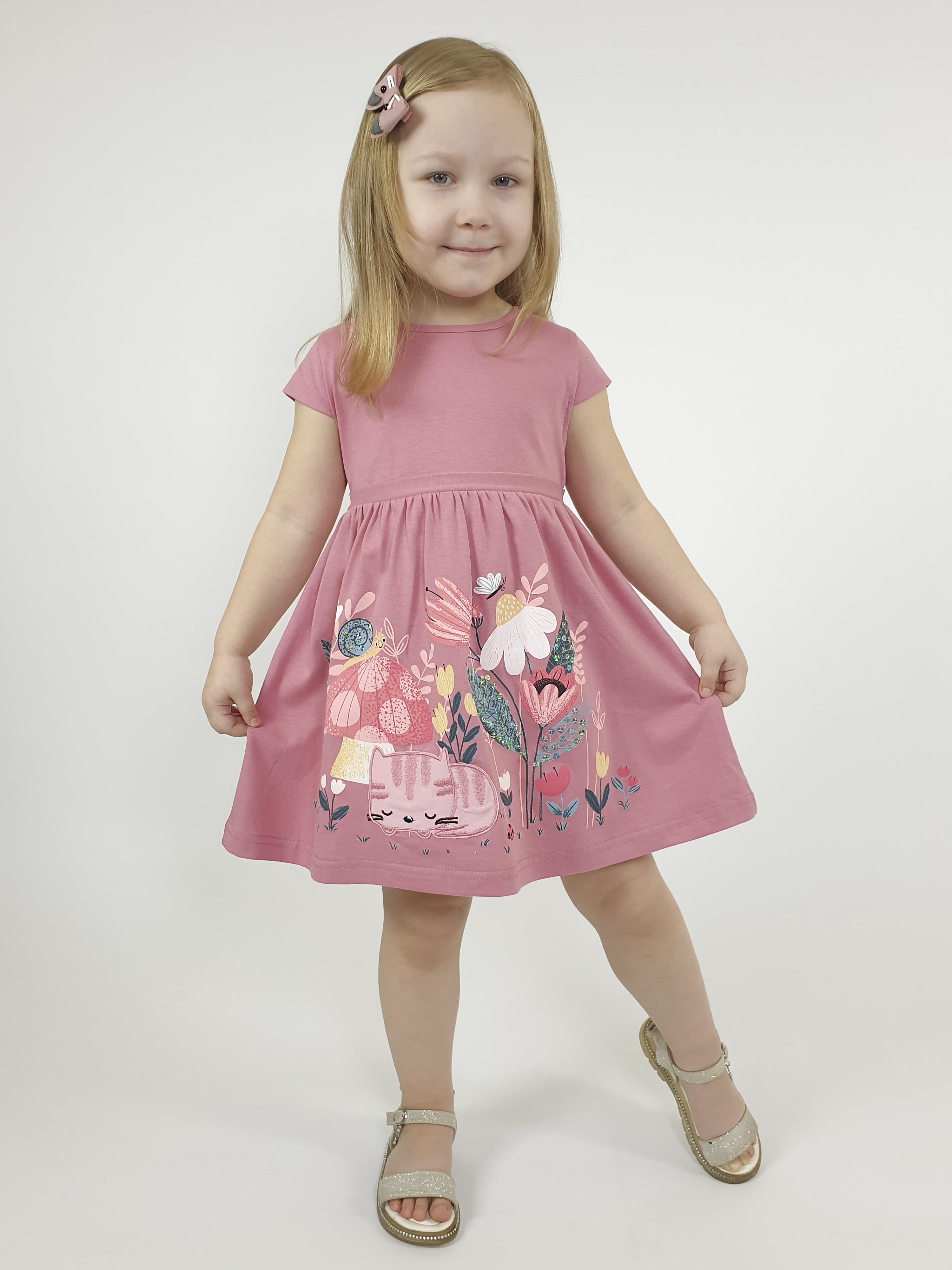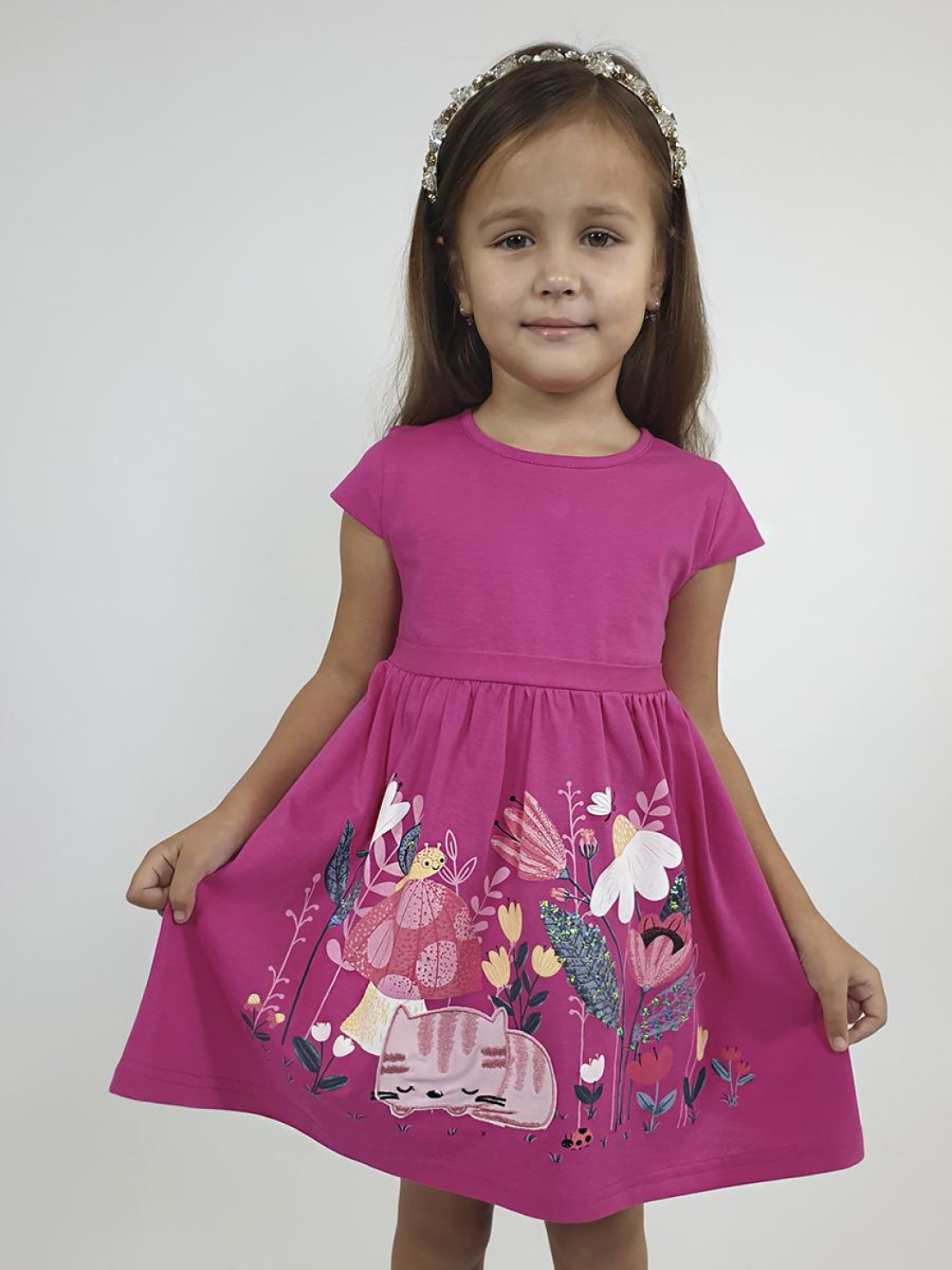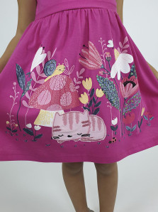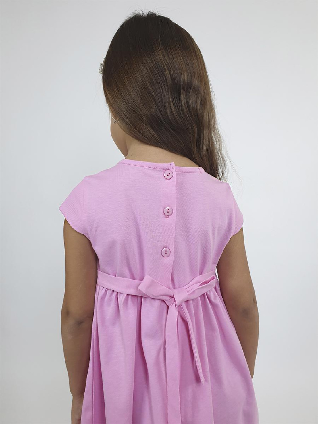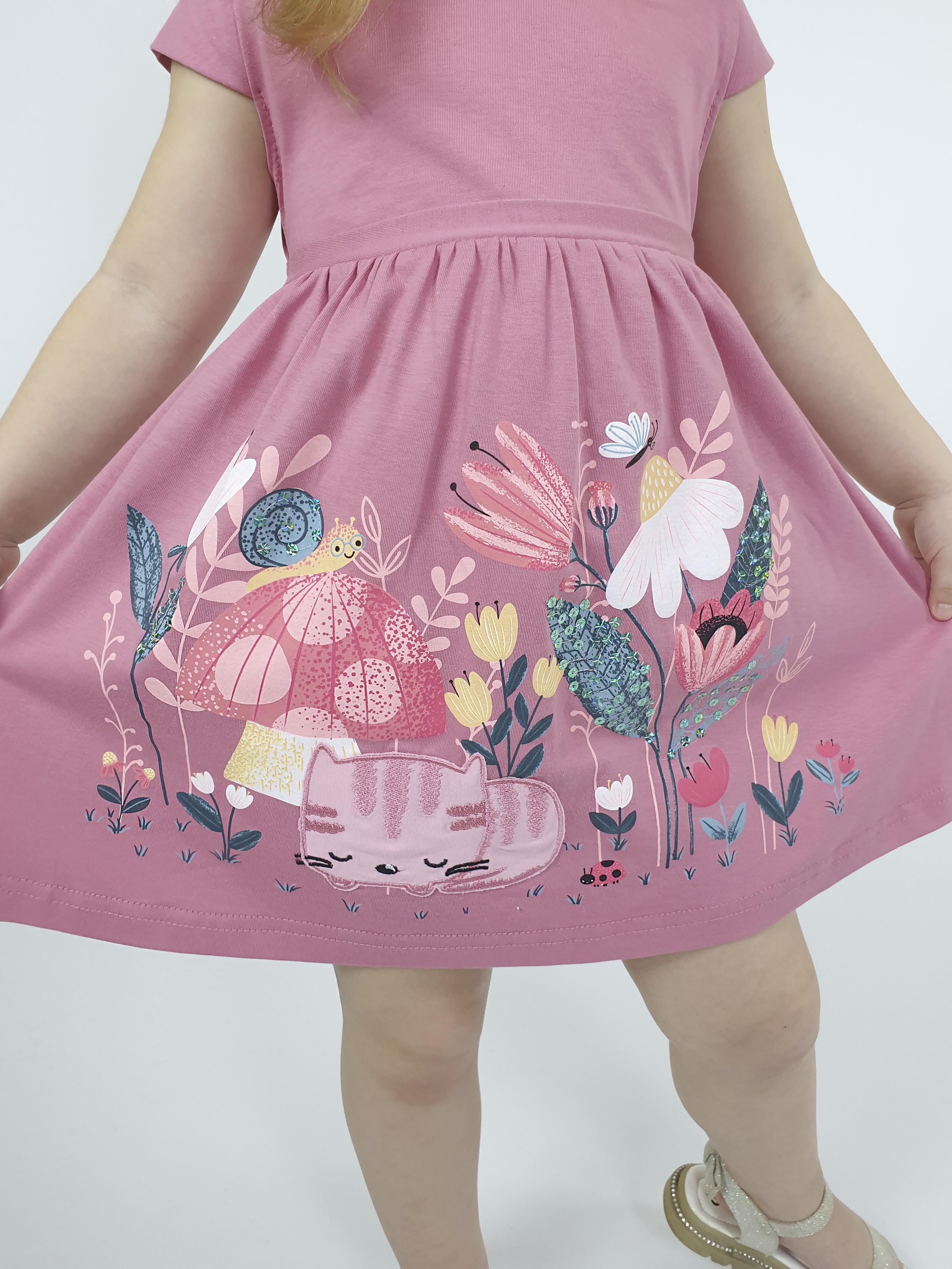 Кулирное полотно:100% х/б. Платье-силуэт трапеция с завышенной линией талии на кокетке.Застежка по кокетке спинки на пуговицы.Горловина окантована.Юбка со сборкой,переднее полотнище юбки с печатью и вышивкой.Между кокеткой и юбкой переда втачан декоративный пояс,переходящий на спинку в завязывающийся.Рукав короткий.