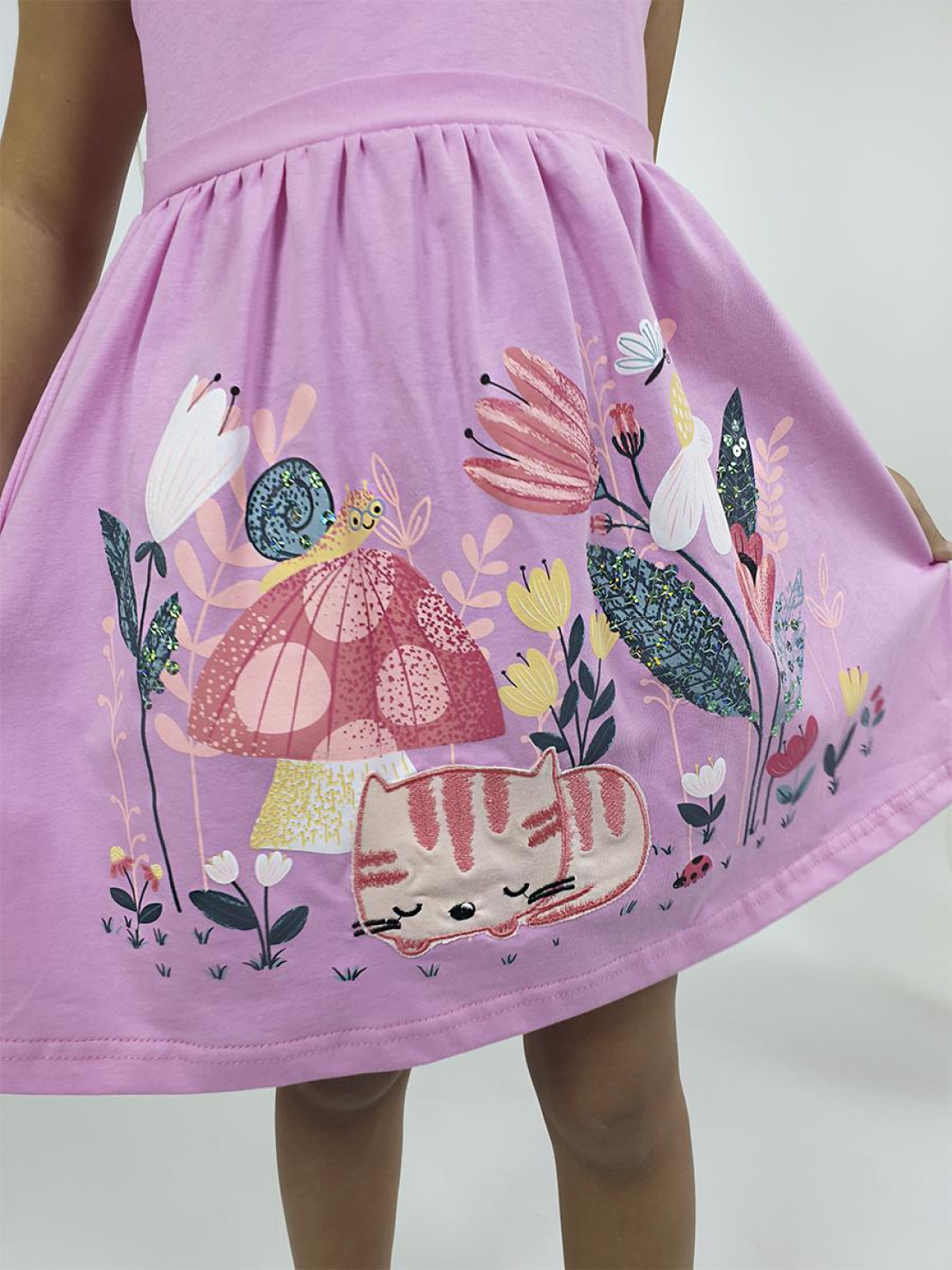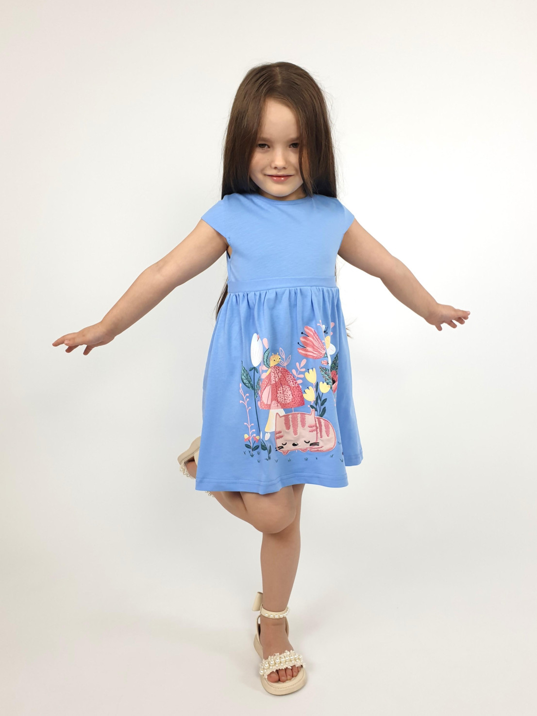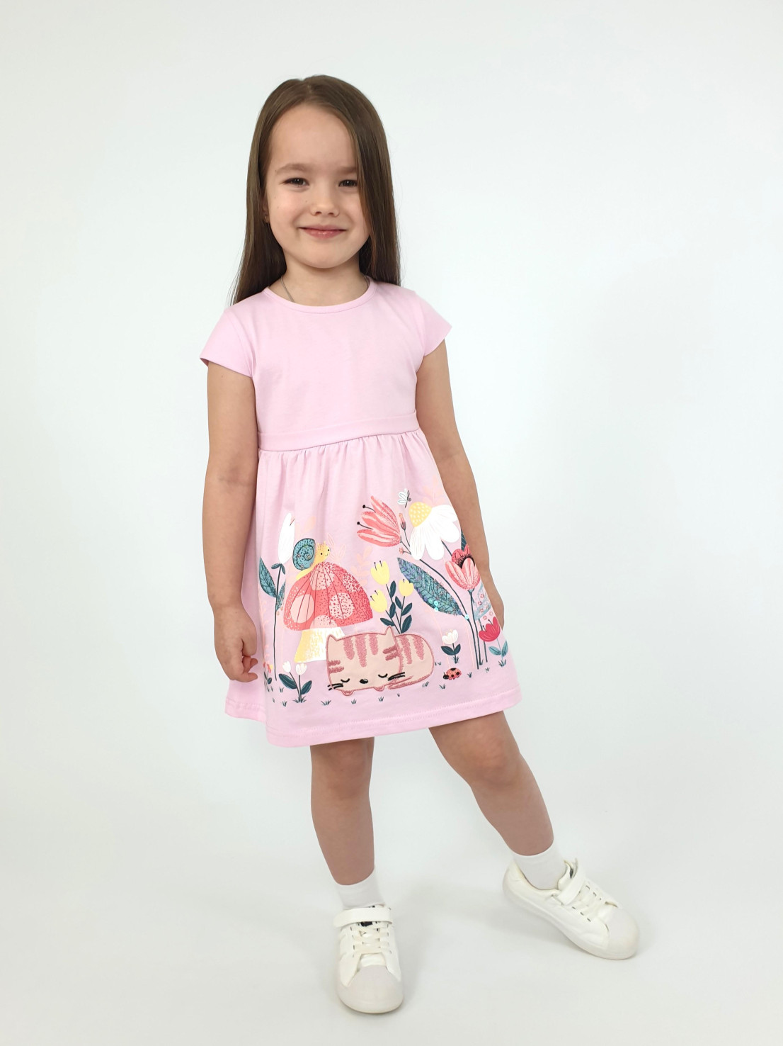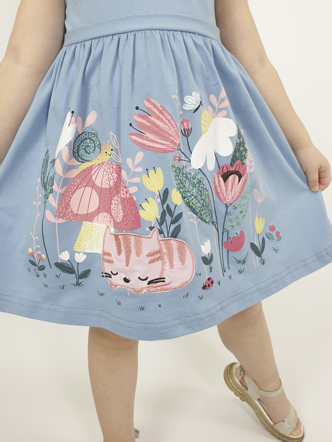 Кулирное полотно:100% х/б. Платье-силуэт трапеция с завышенной линией талии на кокетке.Застежка по кокетке спинки на пуговицы.Горловина окантована.Юбка со сборкой,переднее полотнище юбки с печатью и вышивкой.Между кокеткой и юбкой переда втачан декоративный пояс,переходящий на спинку в завязывающийся.Рукав короткий.