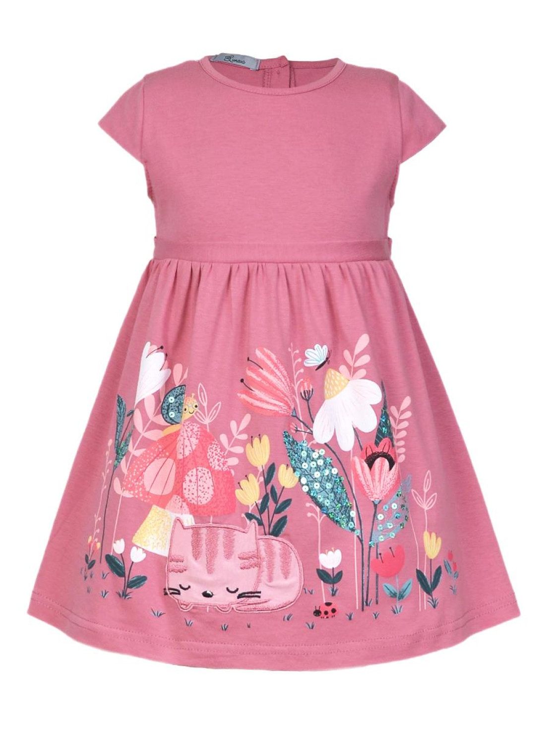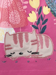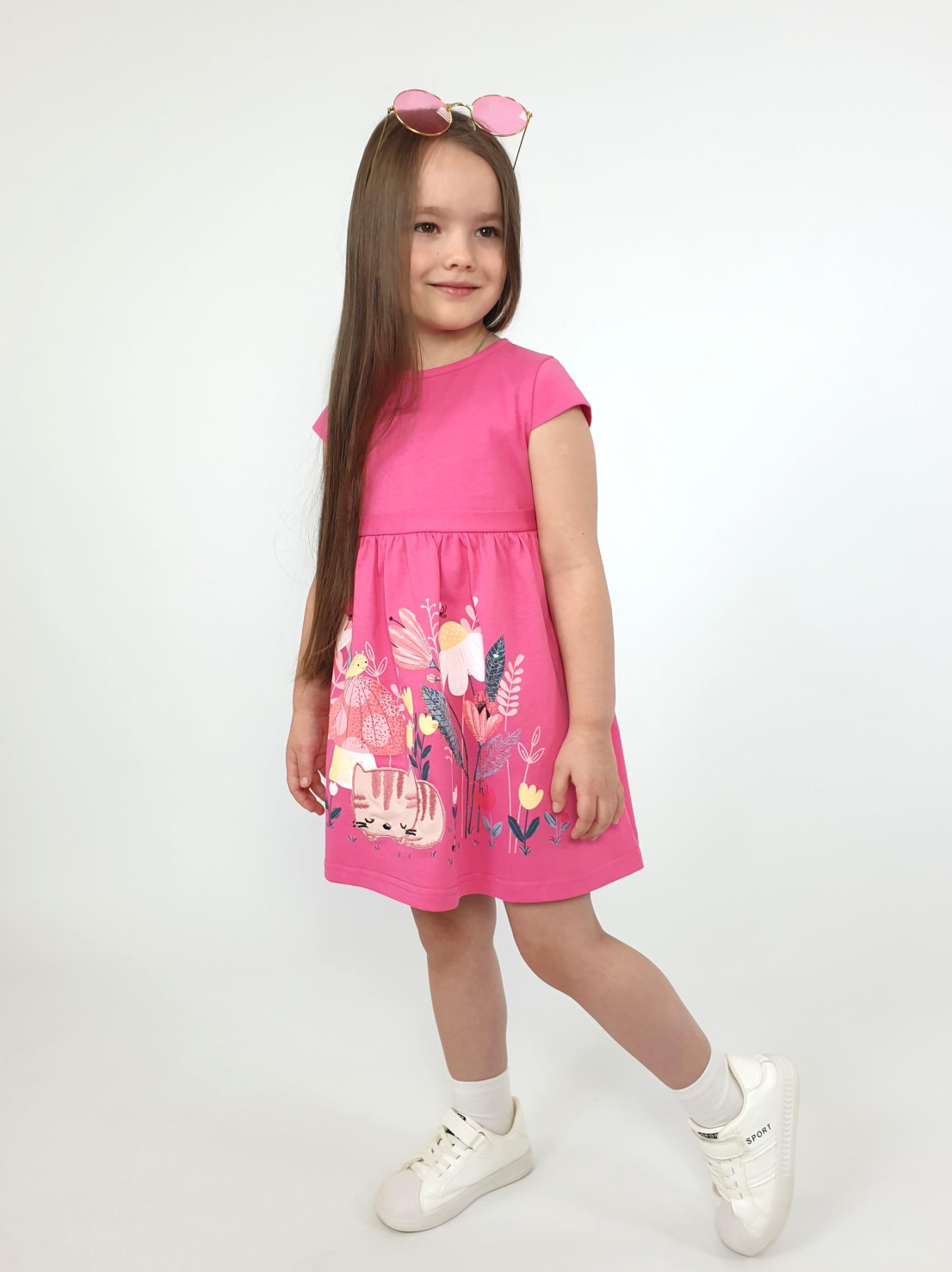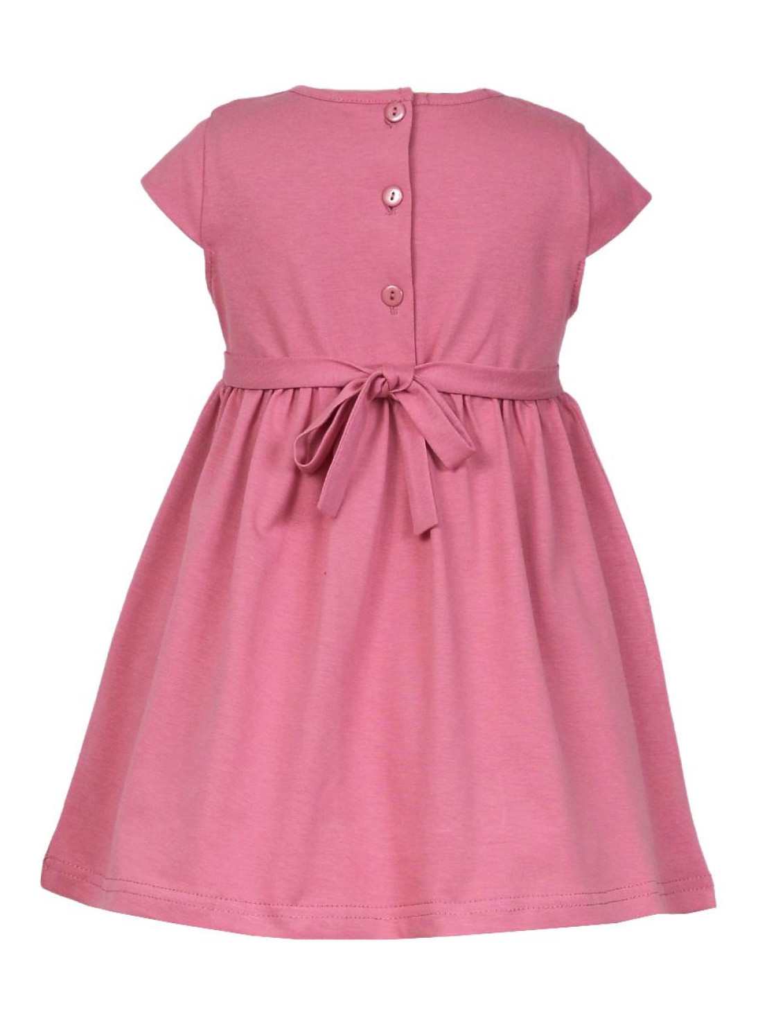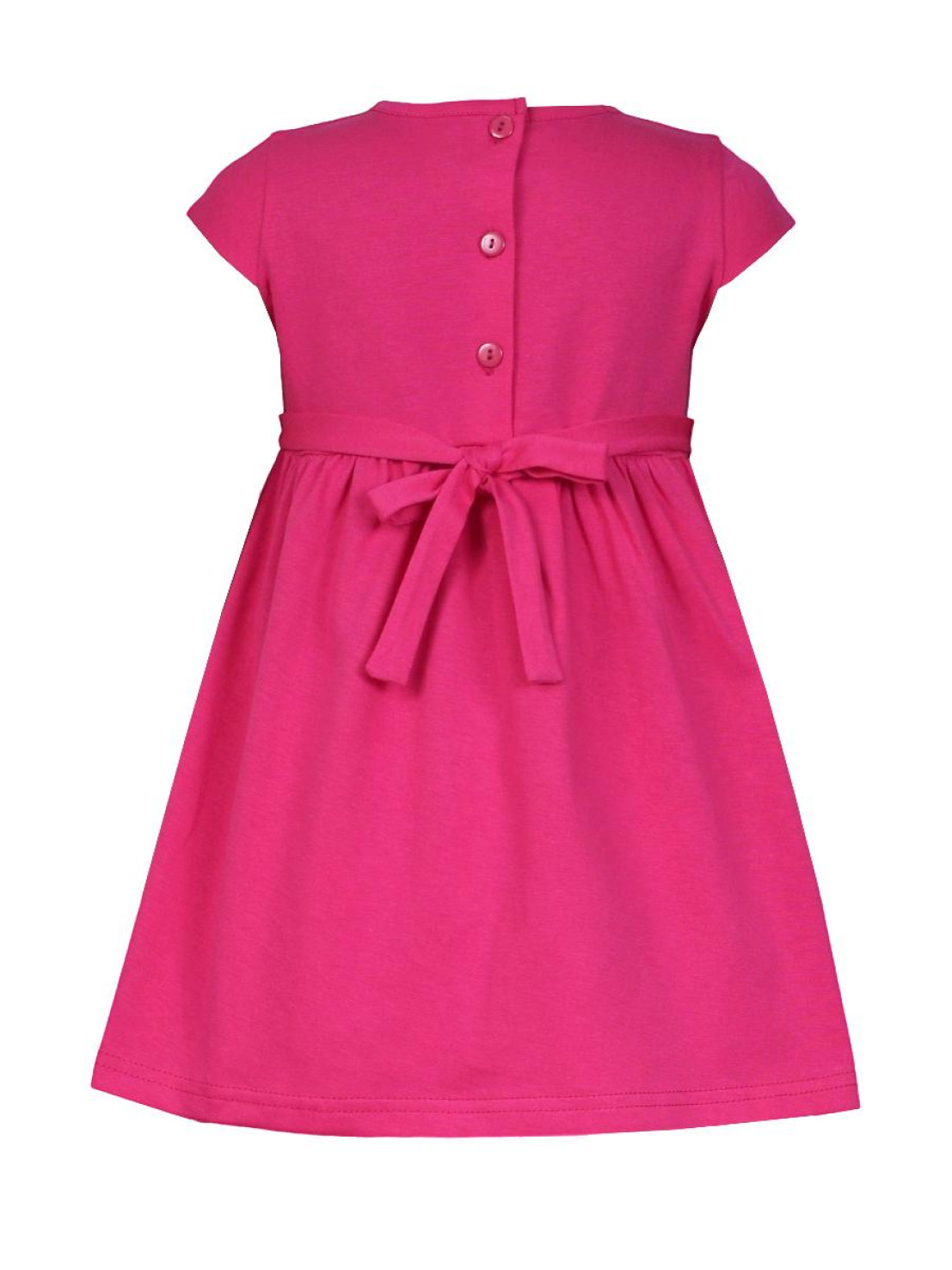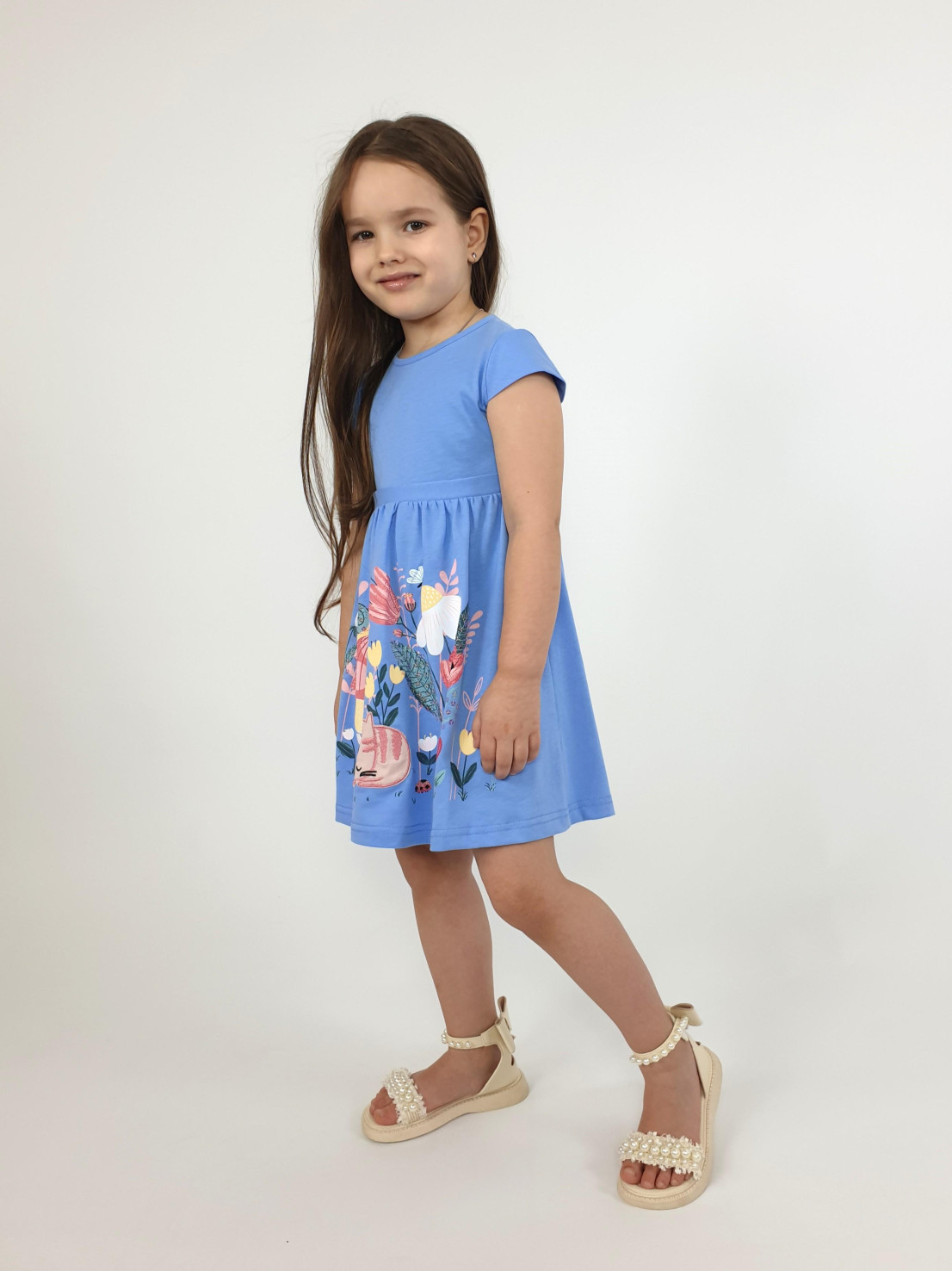 Кулирное полотно:100% х/б. Платье-силуэт трапеция с завышенной линией талии на кокетке.Застежка по кокетке спинки на пуговицы.Горловина окантована.Юбка со сборкой,переднее полотнище юбки с печатью и вышивкой.Между кокеткой и юбкой переда втачан декоративный пояс,переходящий на спинку в завязывающийся.Рукав короткий.