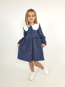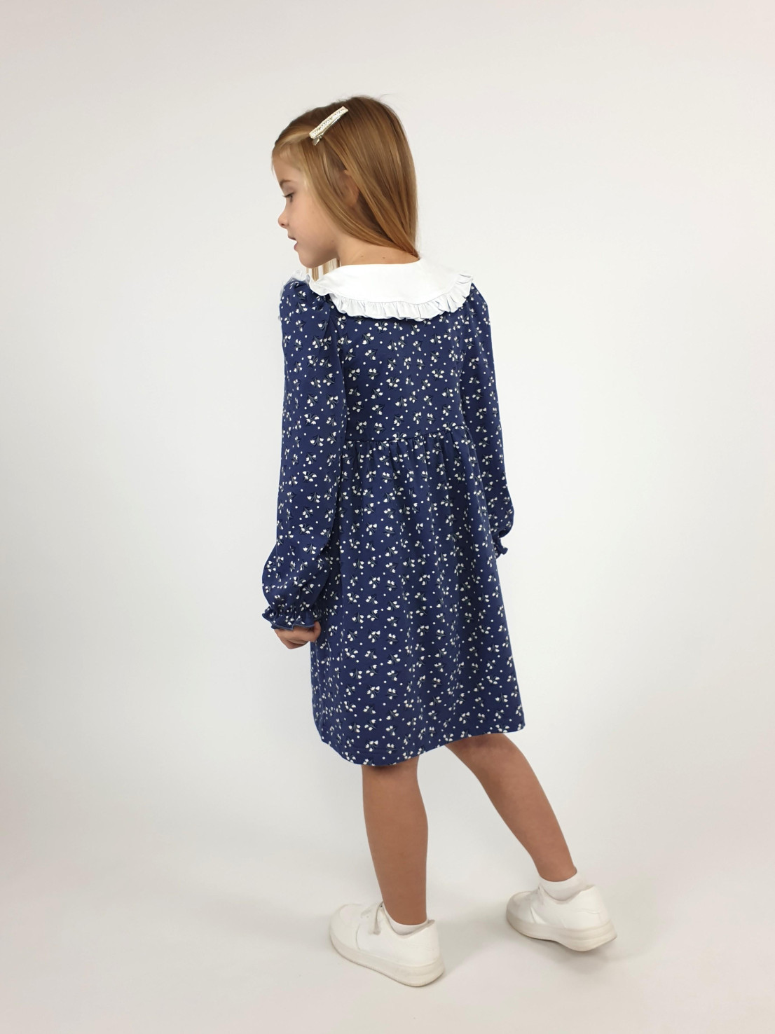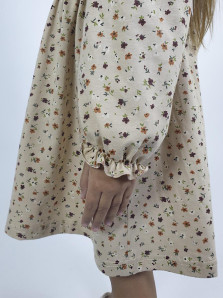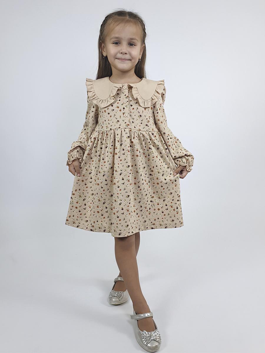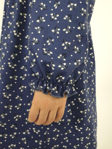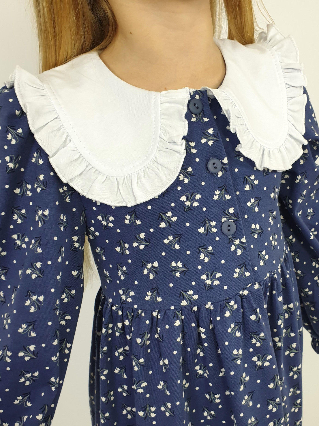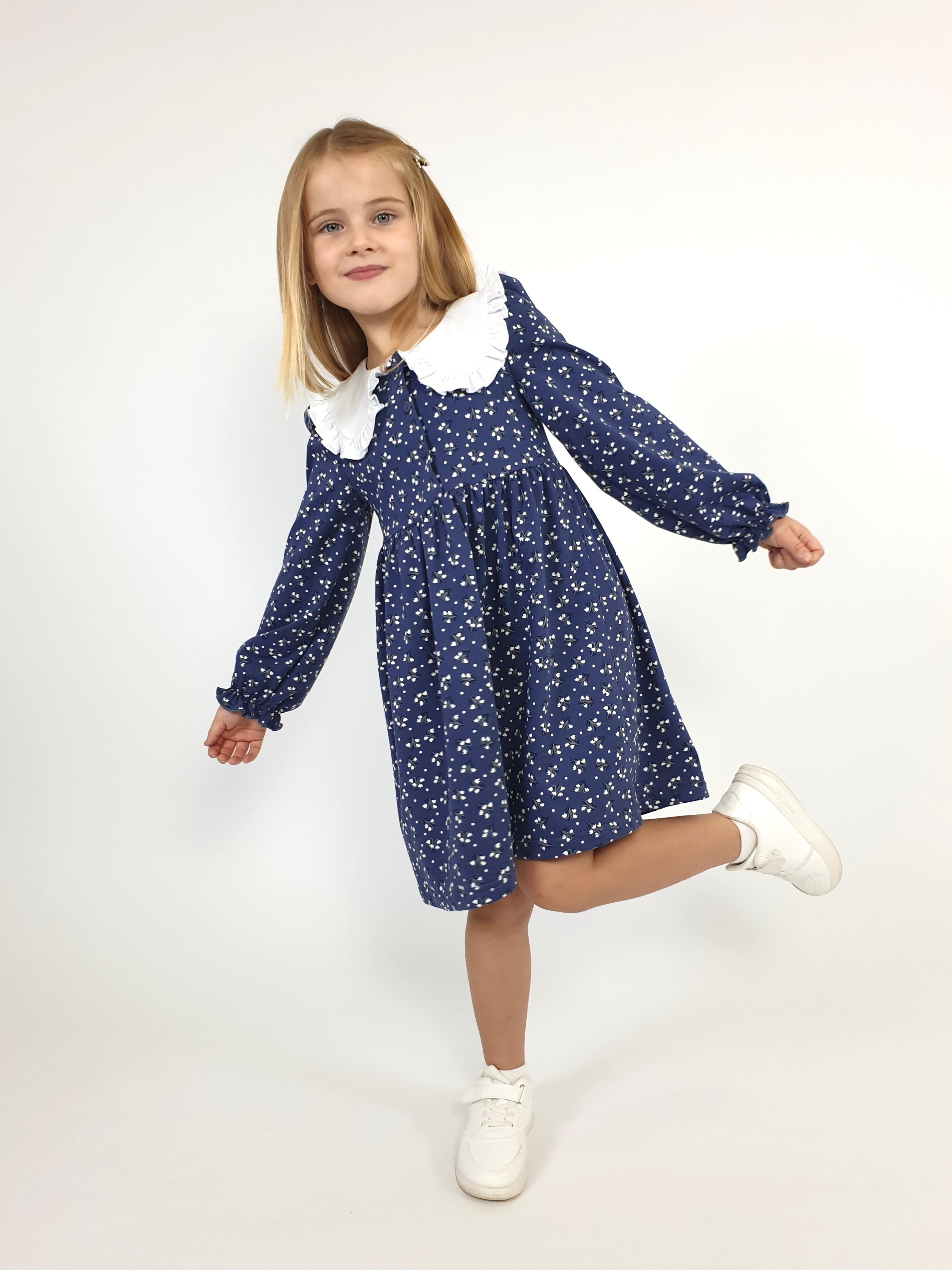 Кулирное полотно:100% х/б. Платье-полуприлегающий силуэт,длинный рукав с резинкой внизу,сборка по окату.Отрезная юбка в сборку.В горловине плосколежащий воротник с рюшей,застежка центральная на пуговицы.
