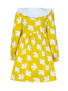 Кулирное полотно:100% х/б. Платье-полуприлегающий силуэт,длинный рукав с резинкой внизу,сборка по окату.Отрезная юбка в сборку.В горловине плосколежащий воротник с рюшей,застежка центральная на пуговицы.
