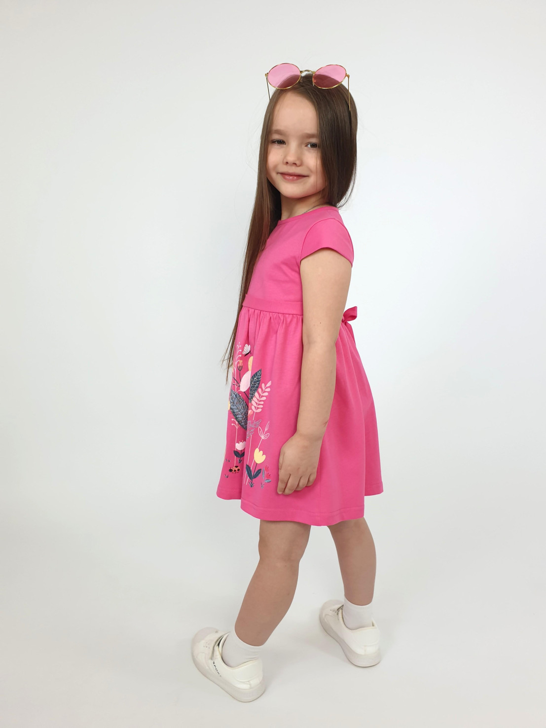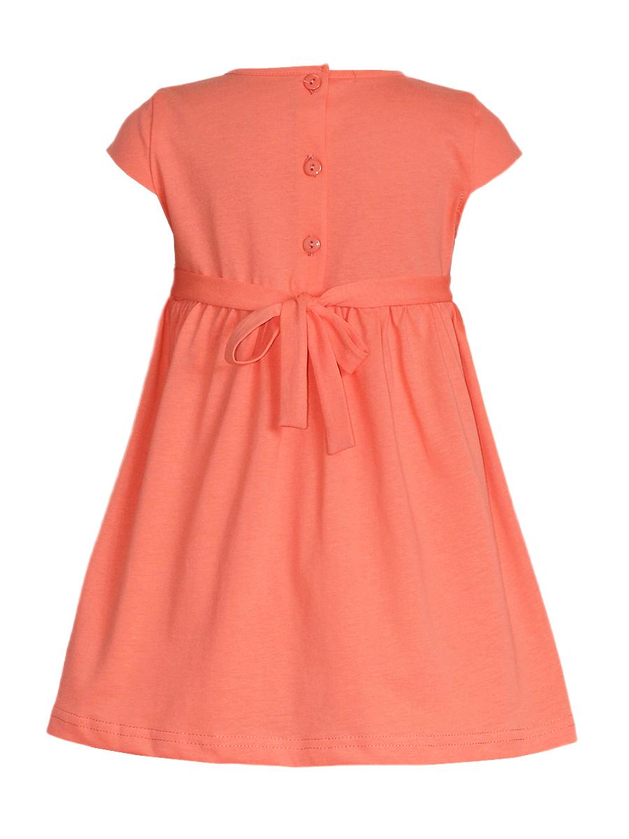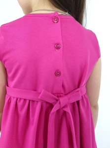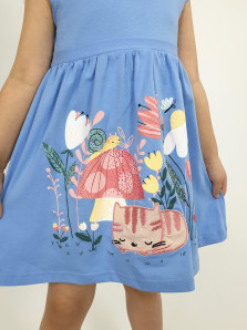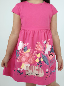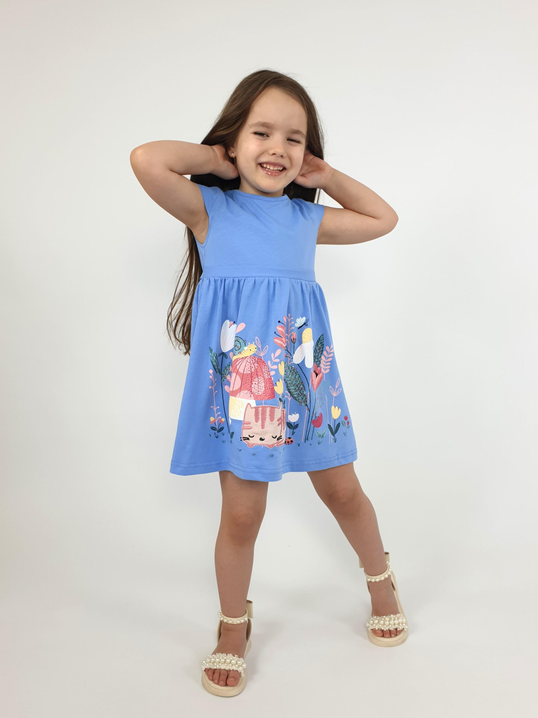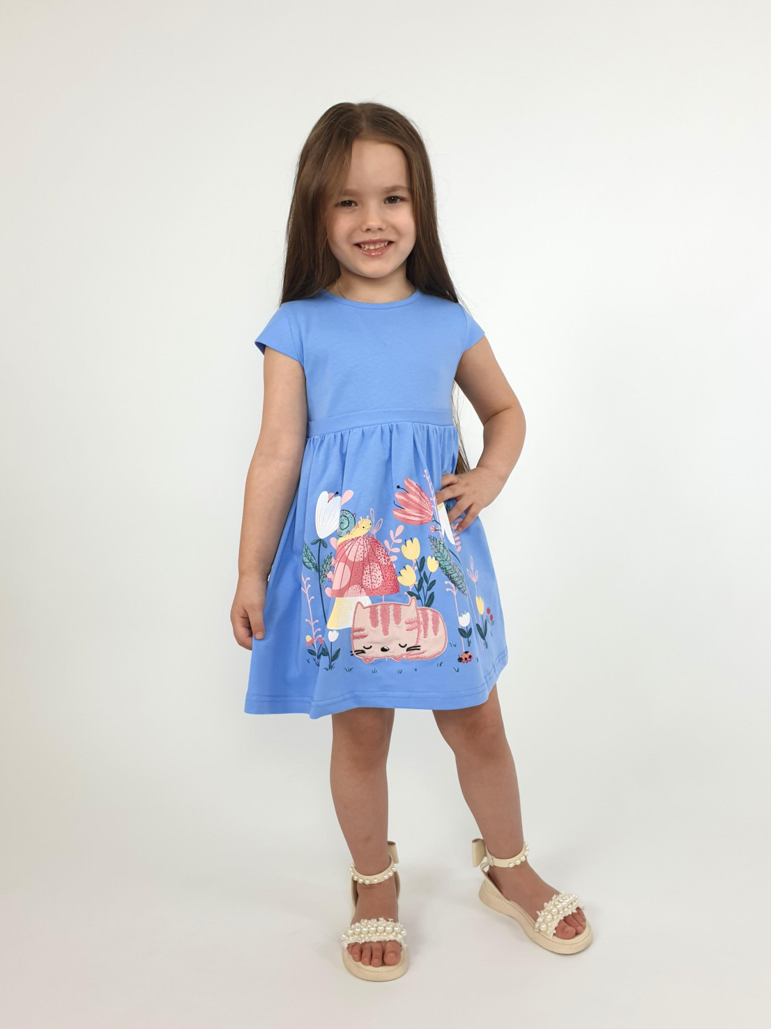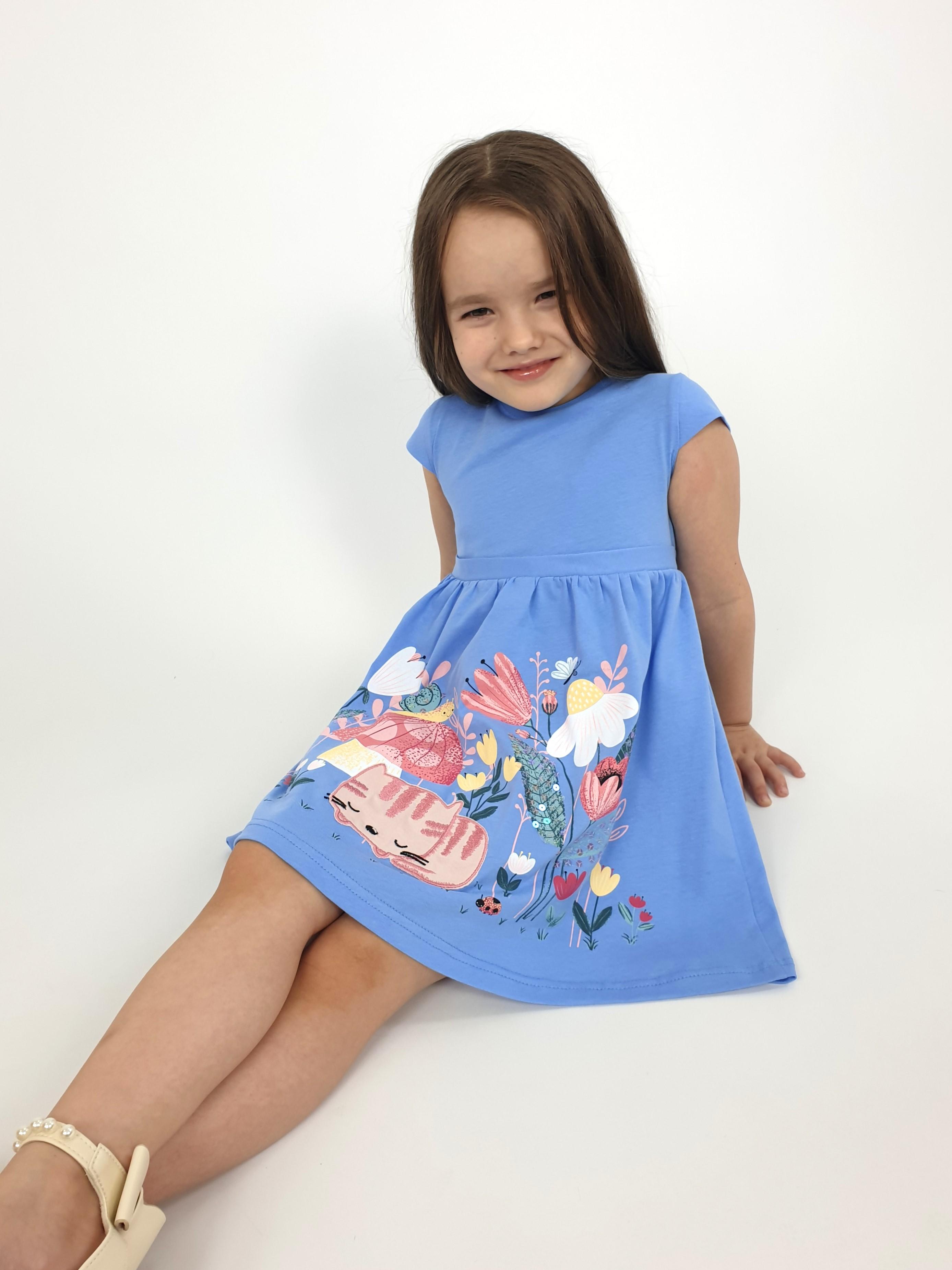 Кулирное полотно:100% х/б. Платье-силуэт трапеция с завышенной линией талии на кокетке.Застежка по кокетке спинки на пуговицы.Горловина окантована.Юбка со сборкой,переднее полотнище юбки с печатью и вышивкой.Между кокеткой и юбкой переда втачан декоративный пояс,переходящий на спинку в завязывающийся.Рукав короткий.