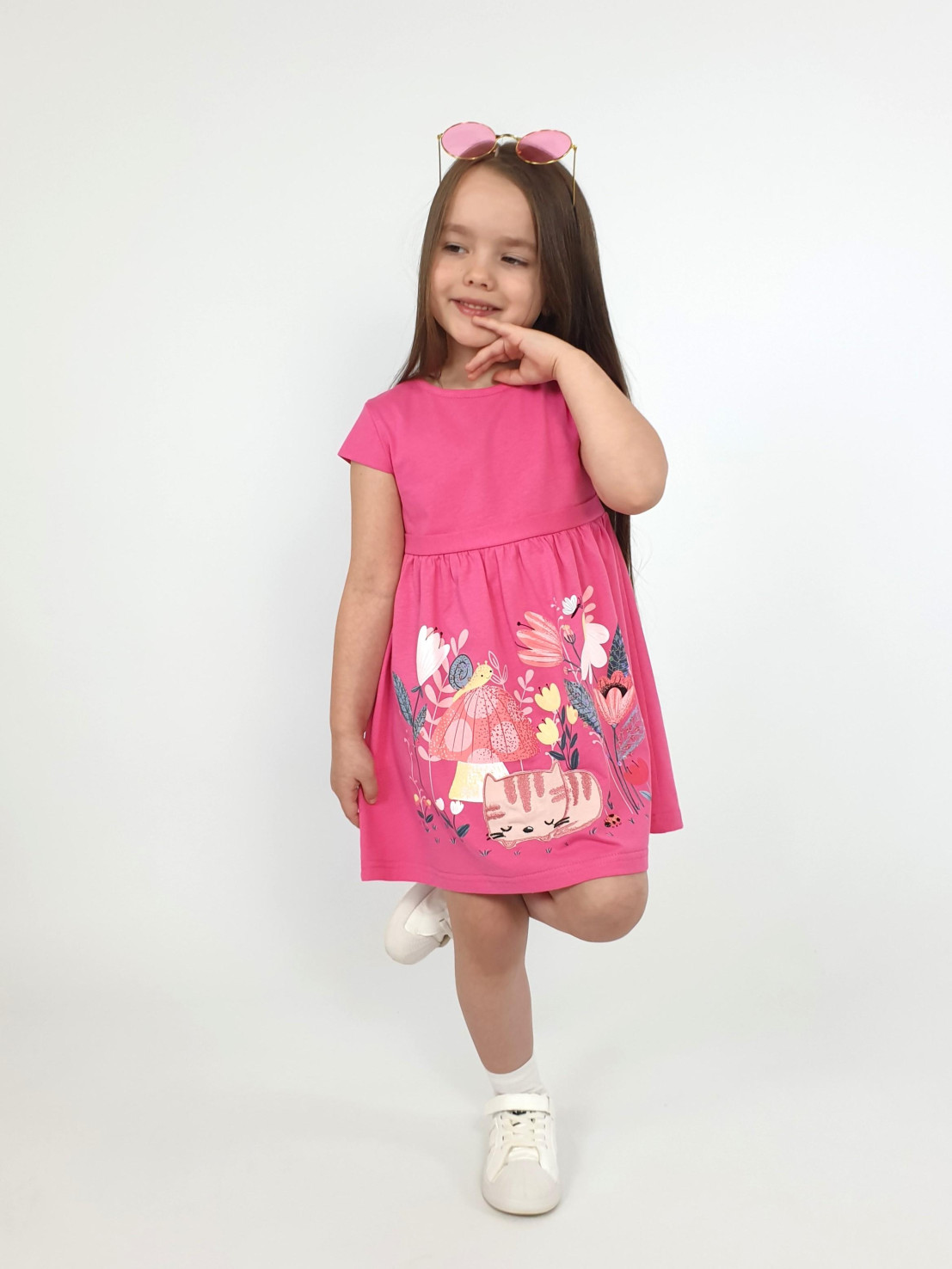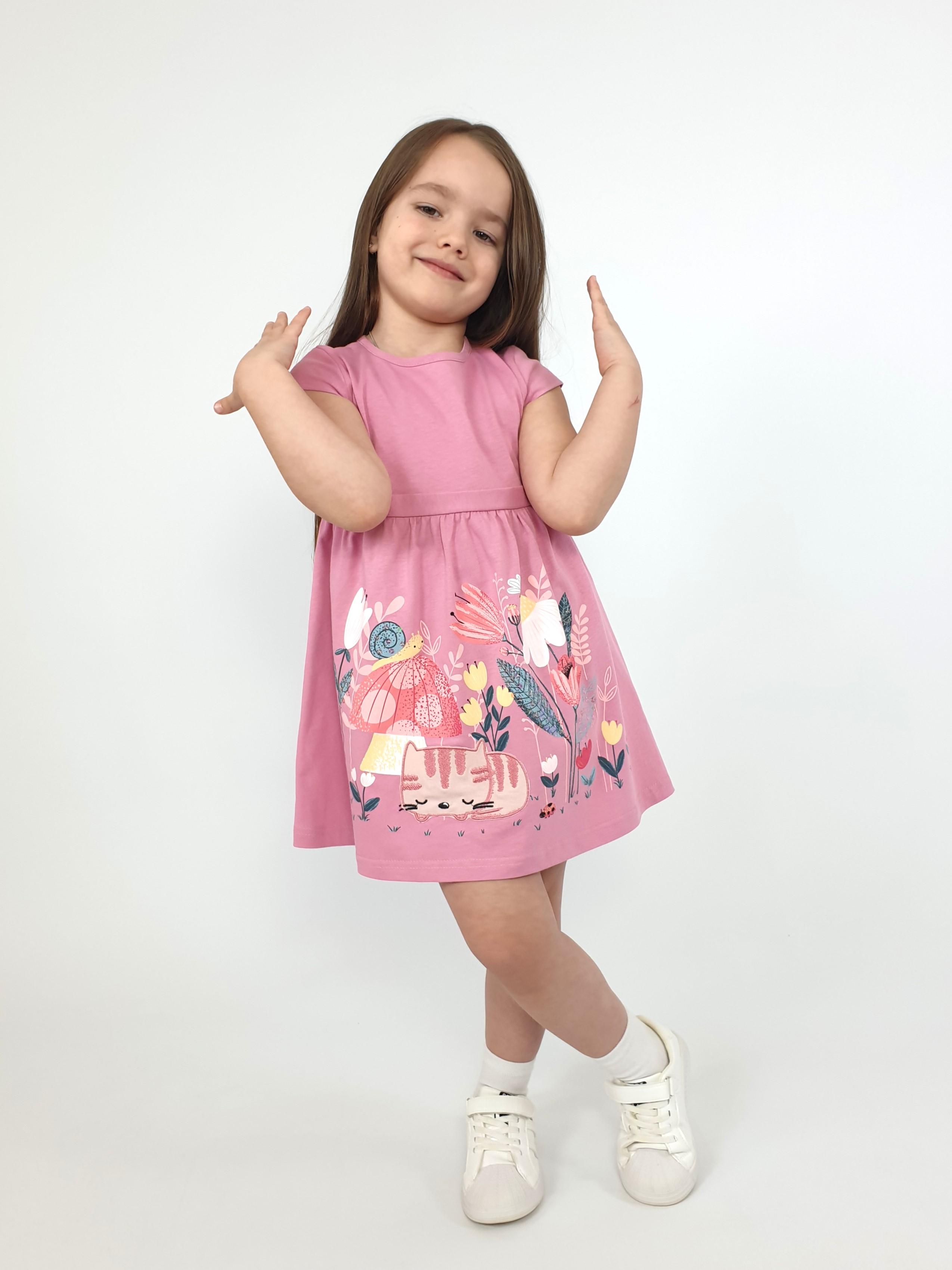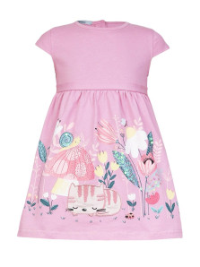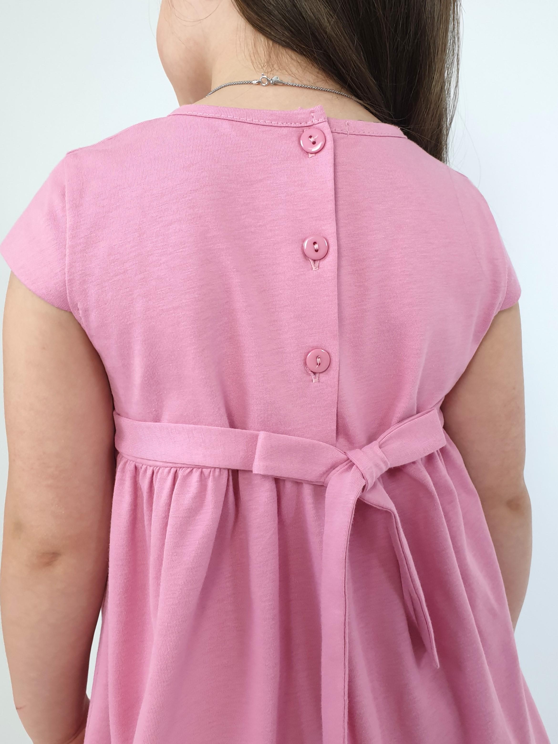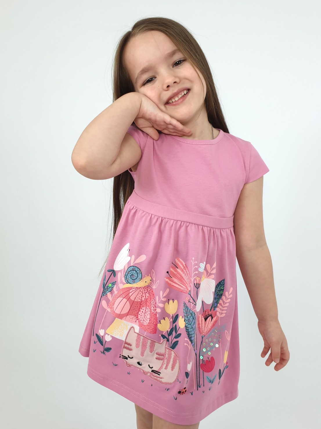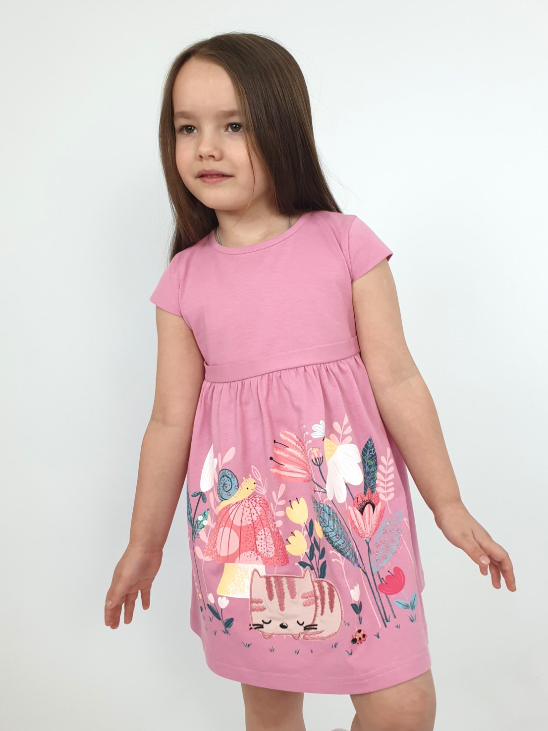Кулирное полотно:100% х/б. Платье-силуэт трапеция с завышенной линией талии на кокетке.Застежка по кокетке спинки на пуговицы.Горловина окантована.Юбка со сборкой,переднее полотнище юбки с печатью и вышивкой.Между кокеткой и юбкой переда втачан декоративный пояс,переходящий на спинку в завязывающийся.Рукав короткий.