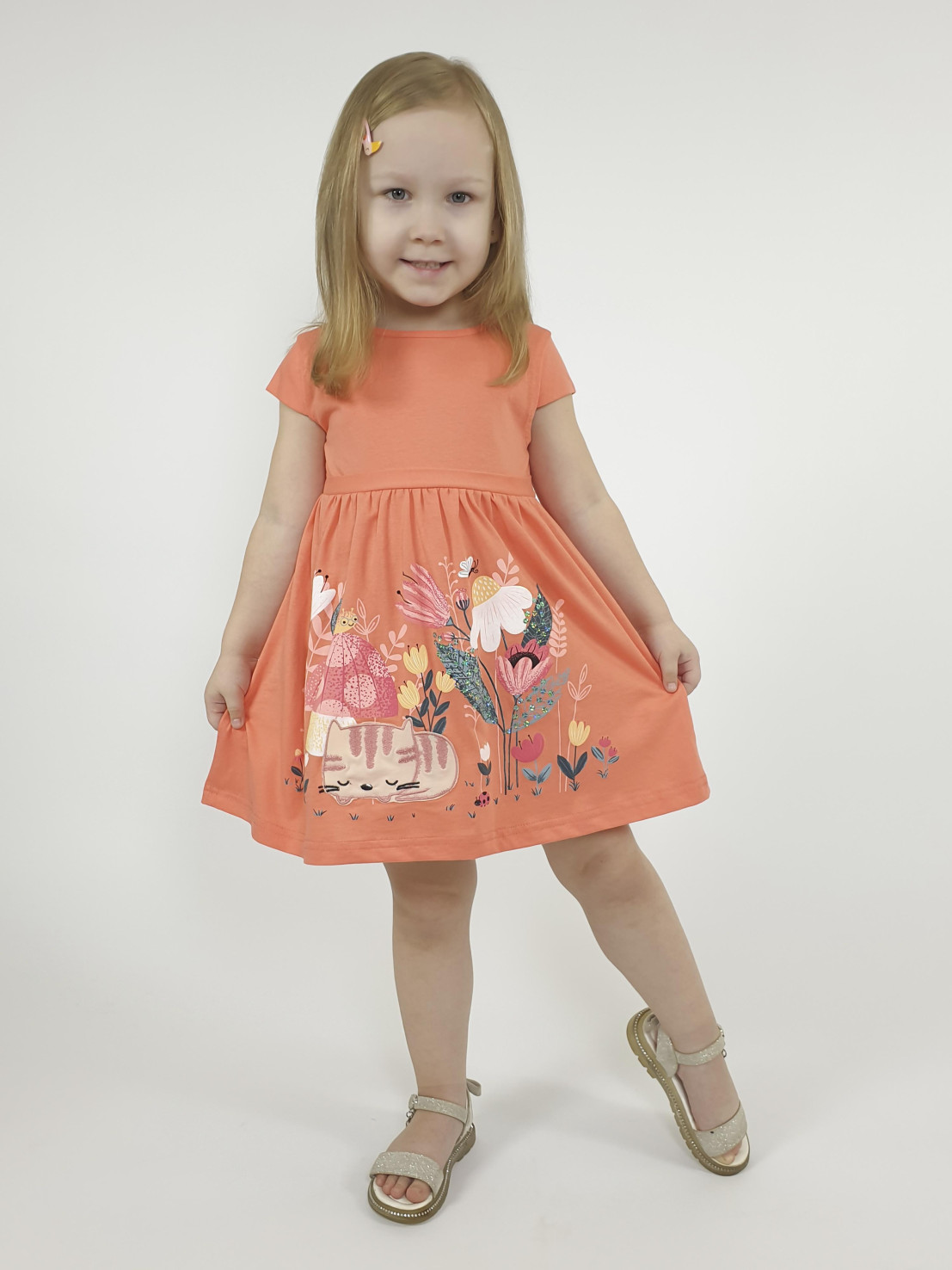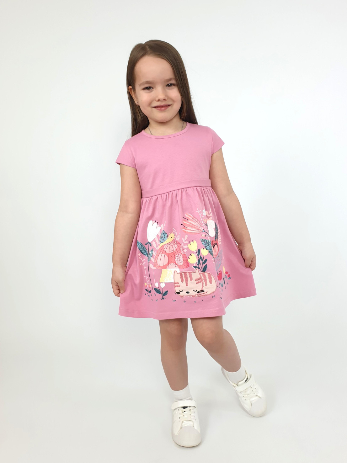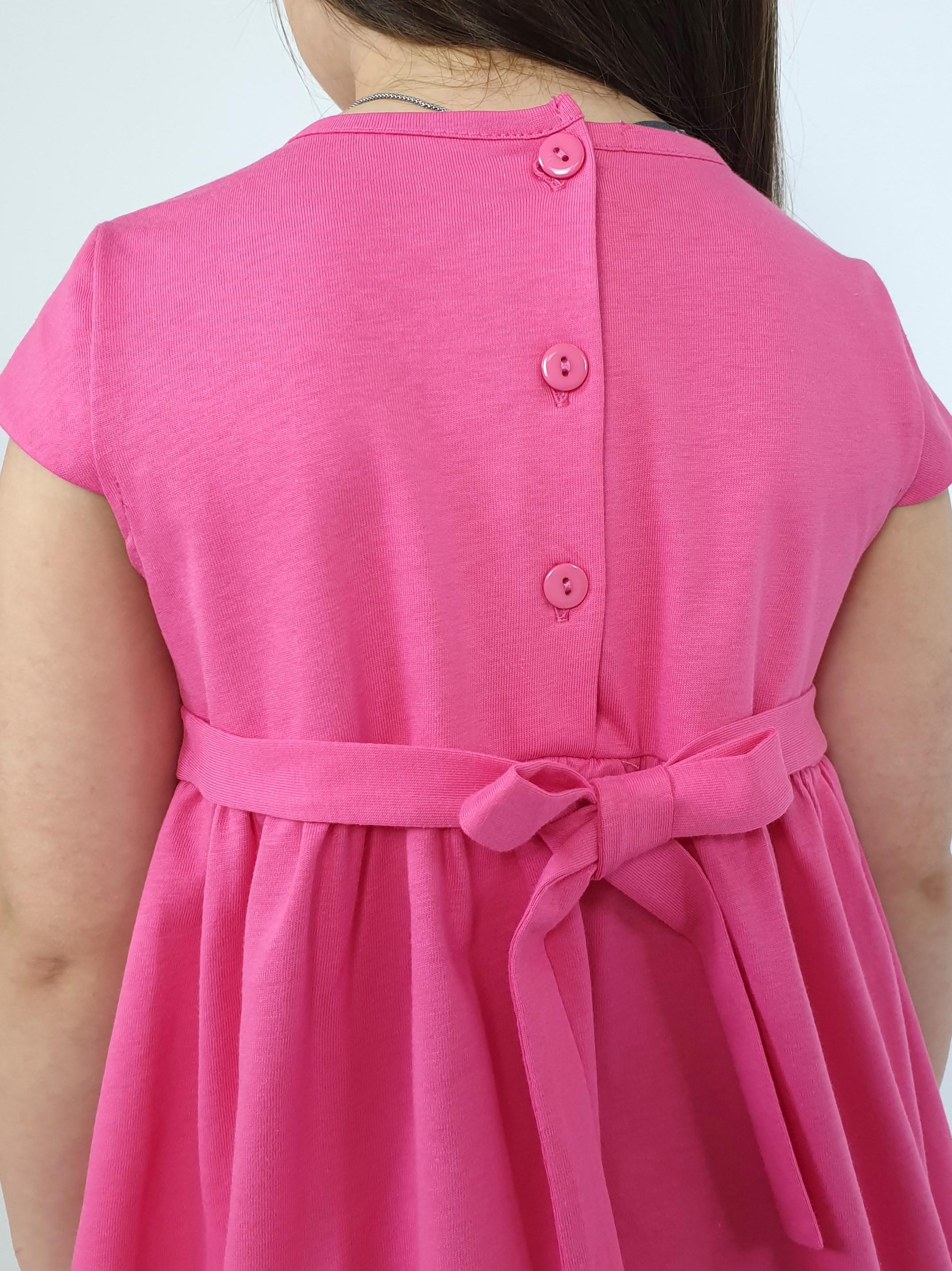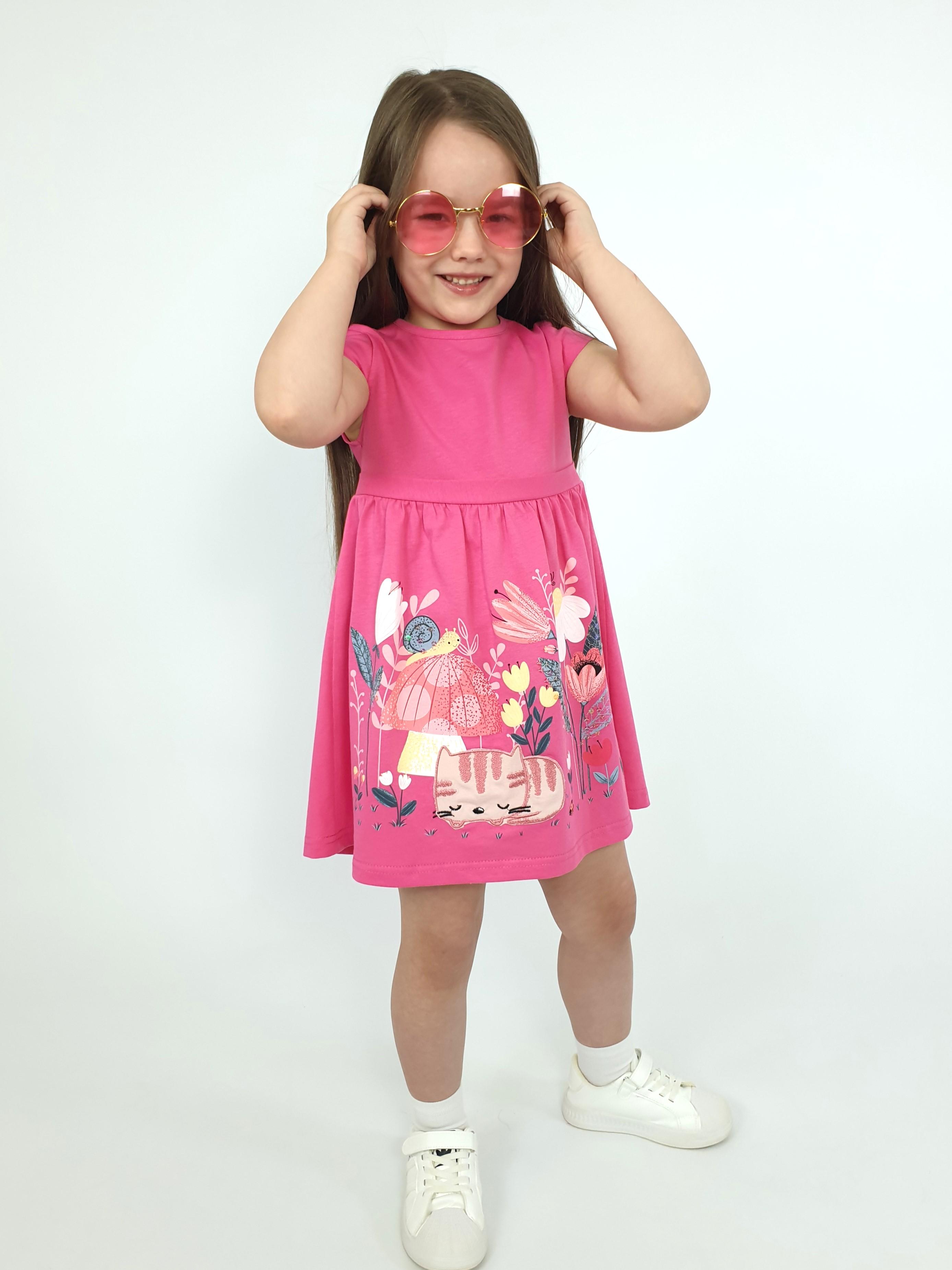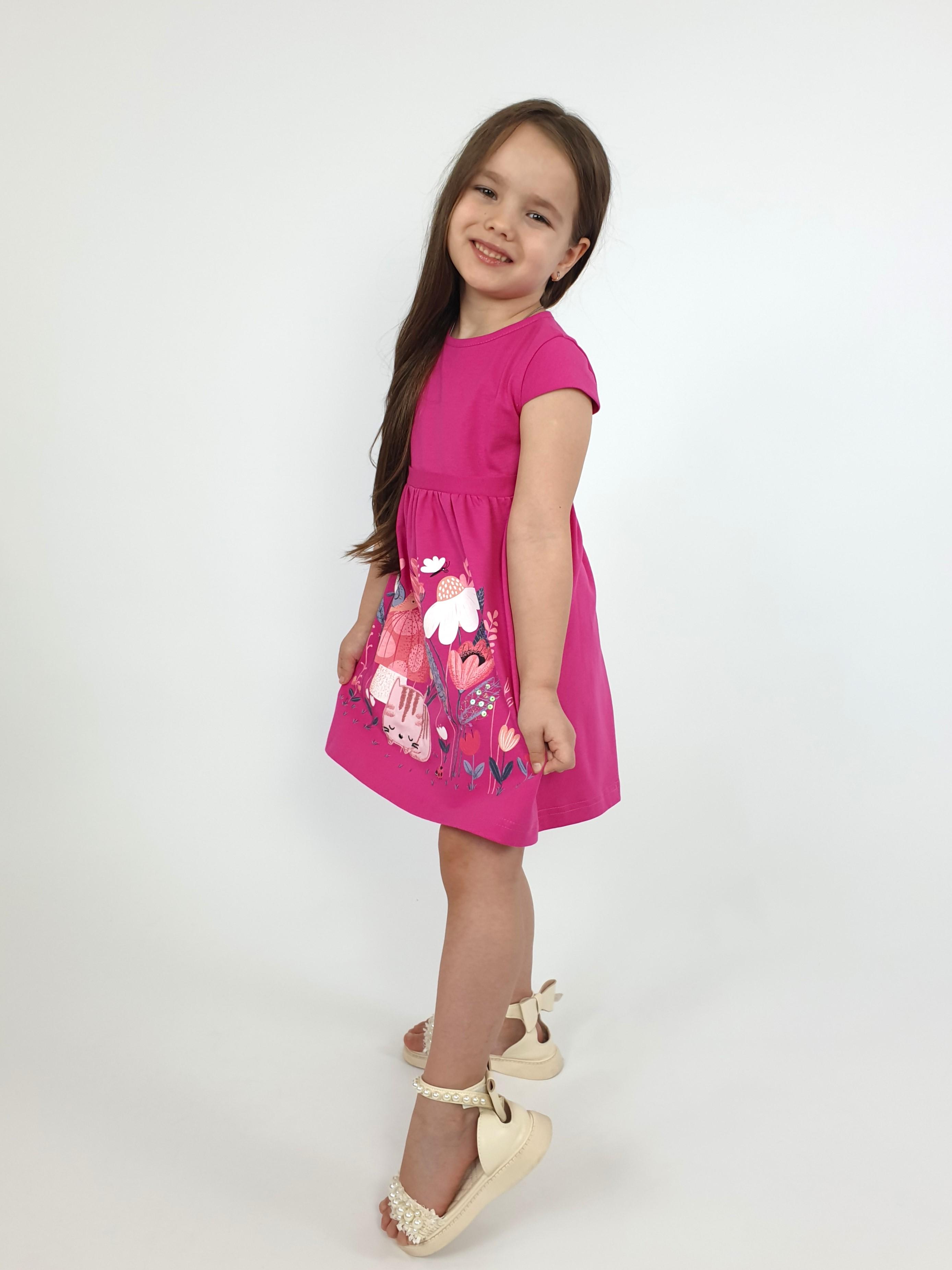 Кулирное полотно:100% х/б. Платье-силуэт трапеция с завышенной линией талии на кокетке.Застежка по кокетке спинки на пуговицы.Горловина окантована.Юбка со сборкой,переднее полотнище юбки с печатью и вышивкой.Между кокеткой и юбкой переда втачан декоративный пояс,переходящий на спинку в завязывающийся.Рукав короткий.