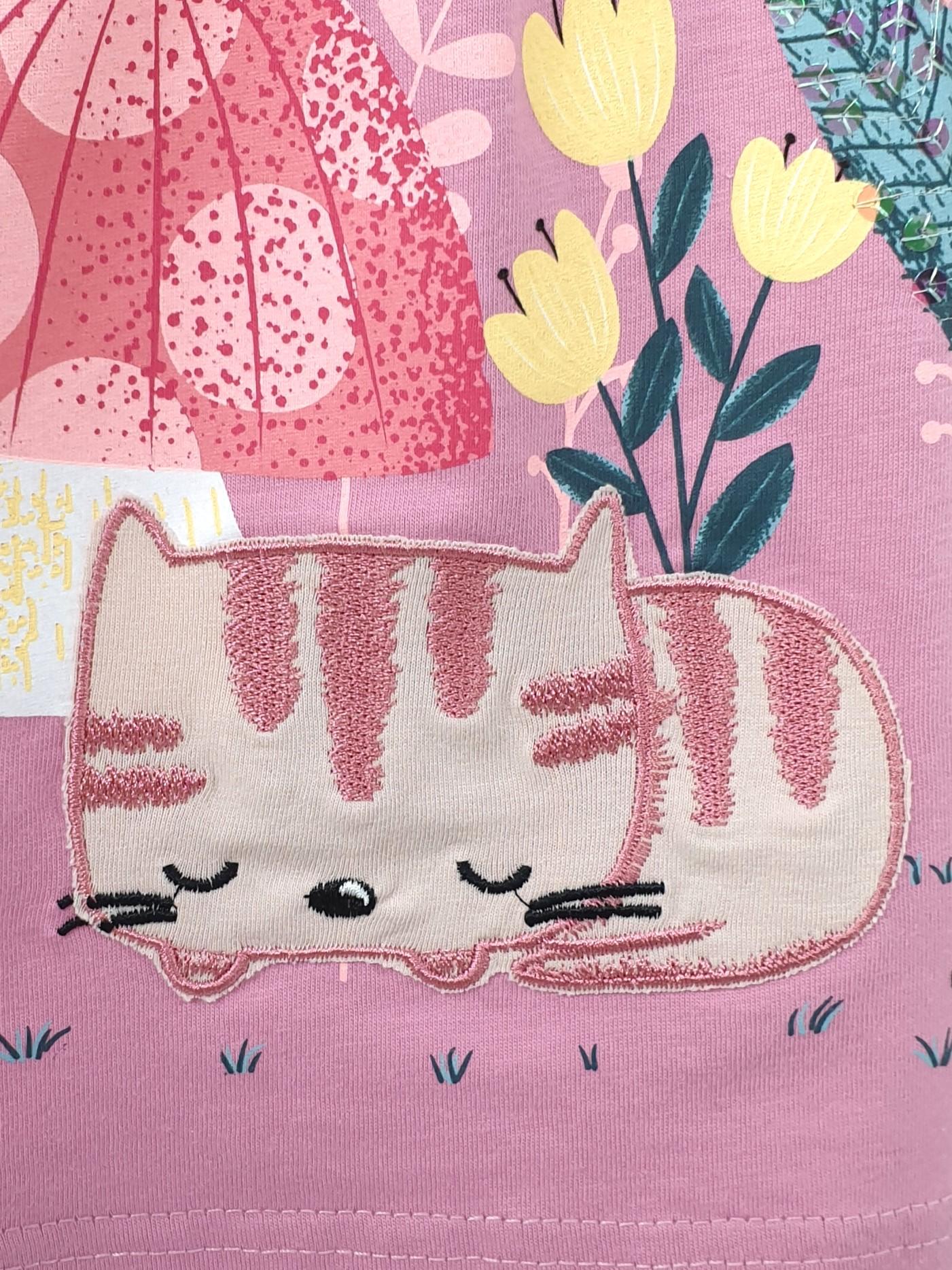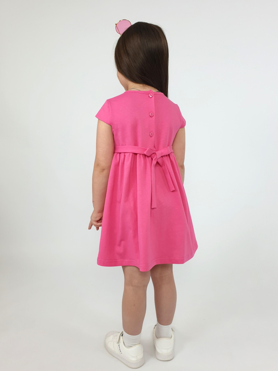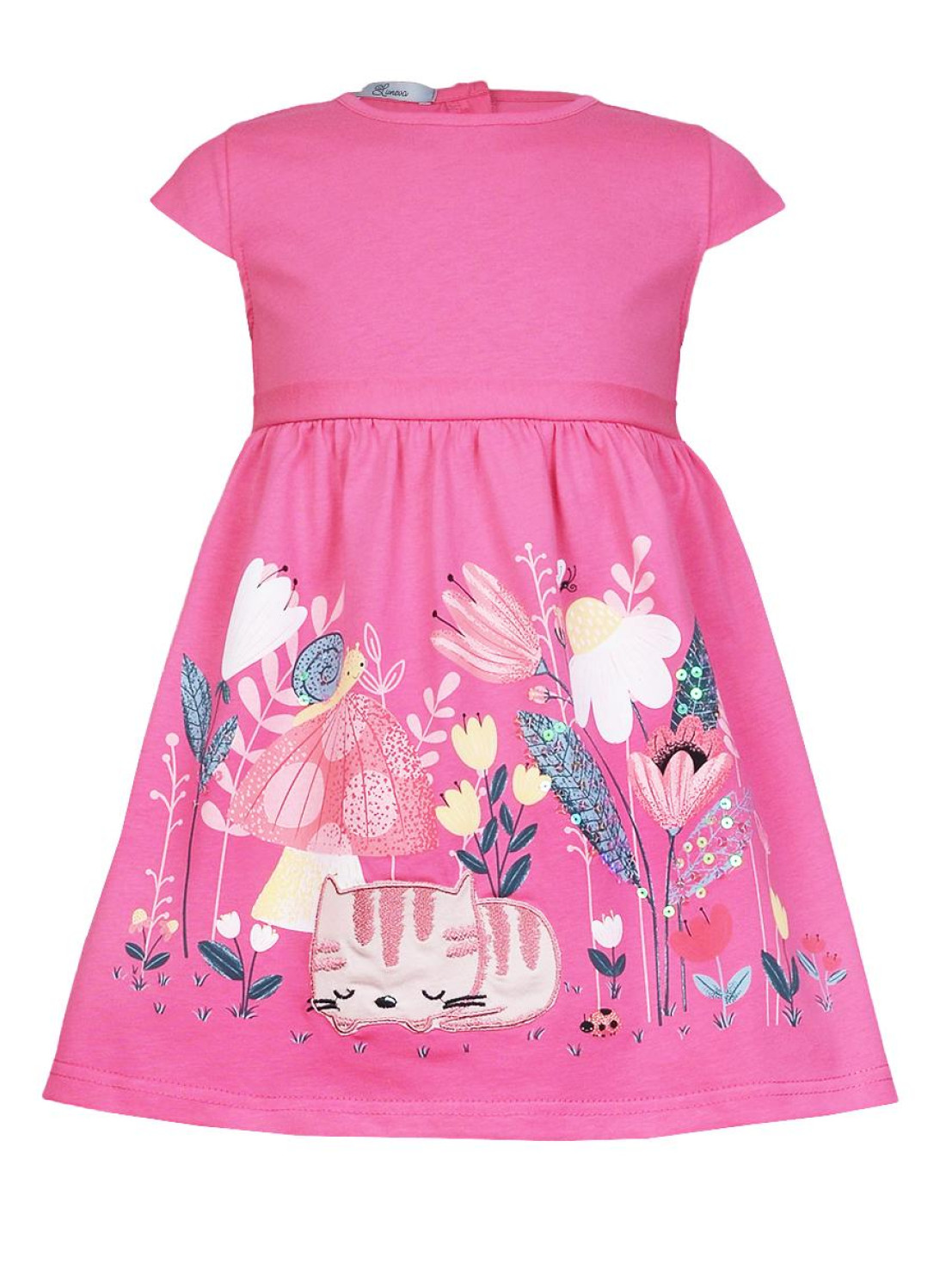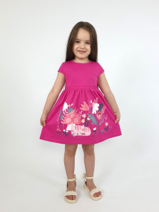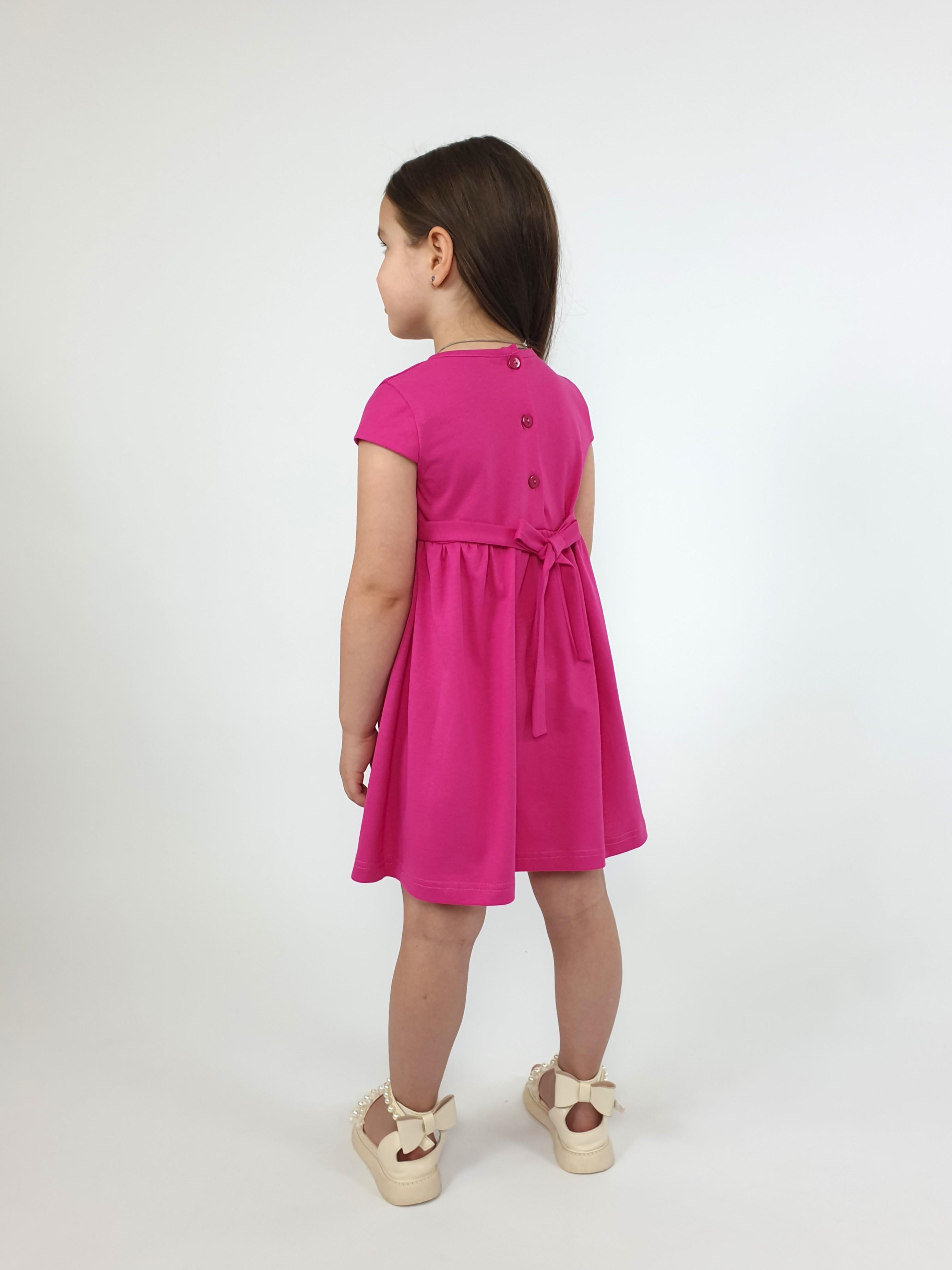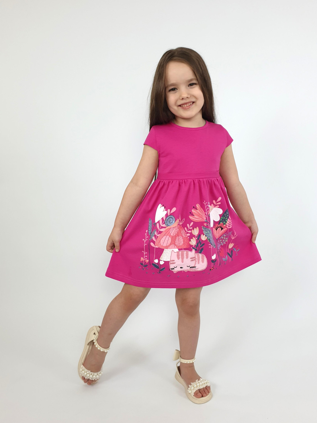 Кулирное полотно:100% х/б. Платье-силуэт трапеция с завышенной линией талии на кокетке.Застежка по кокетке спинки на пуговицы.Горловина окантована.Юбка со сборкой,переднее полотнище юбки с печатью и вышивкой.Между кокеткой и юбкой переда втачан декоративный пояс,переходящий на спинку в завязывающийся.Рукав короткий.