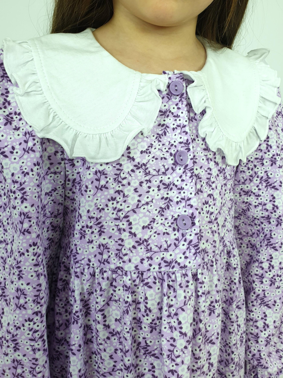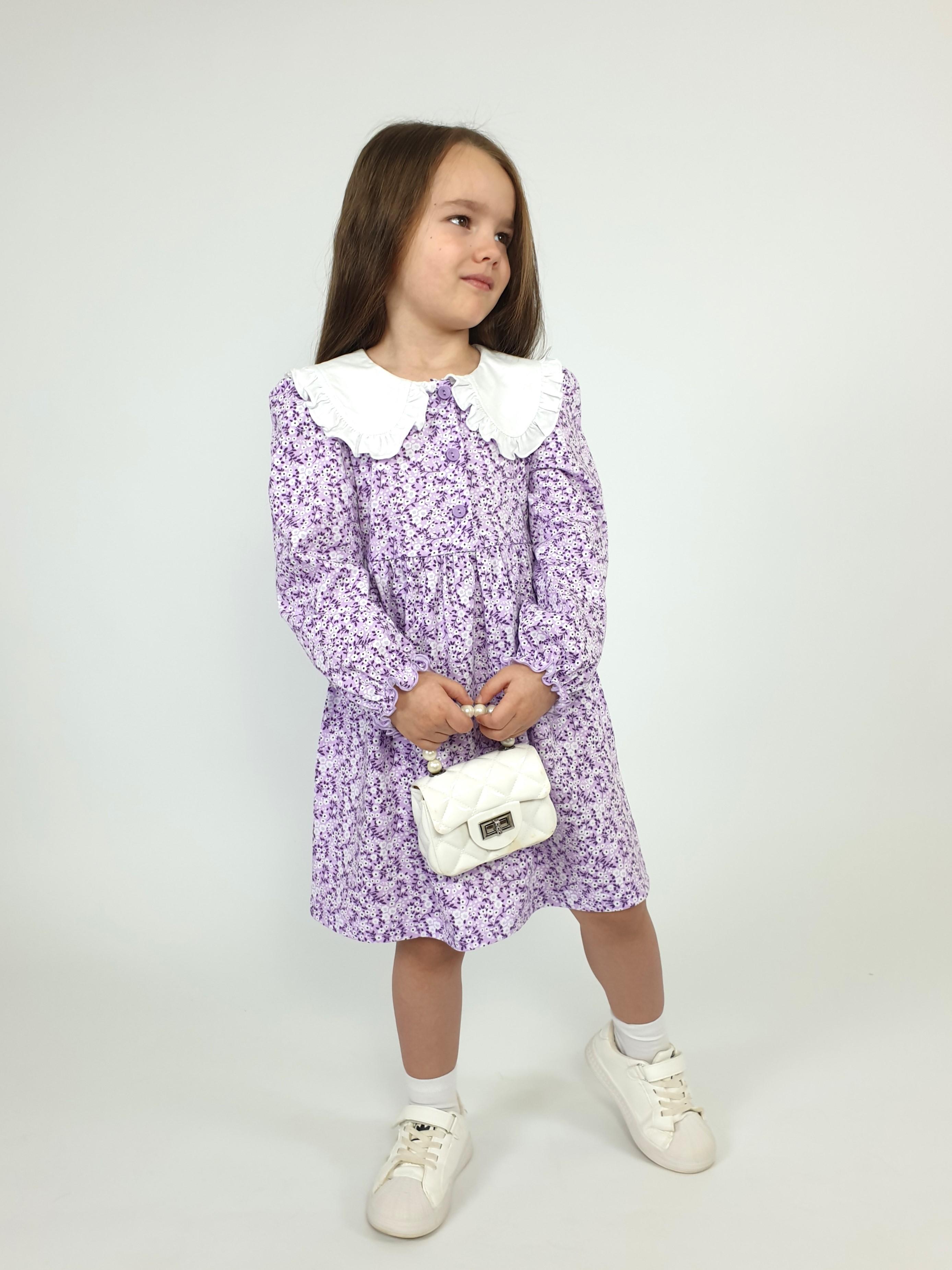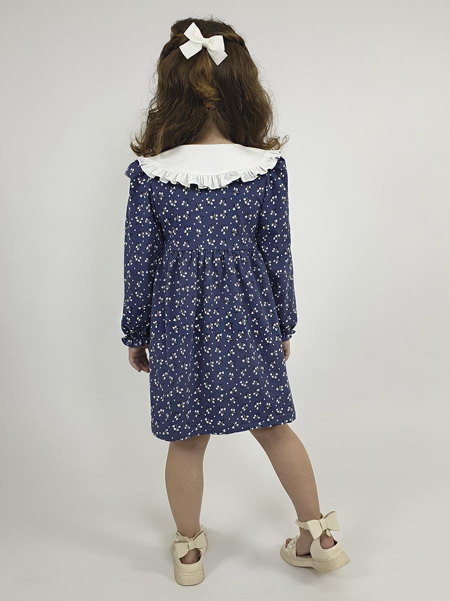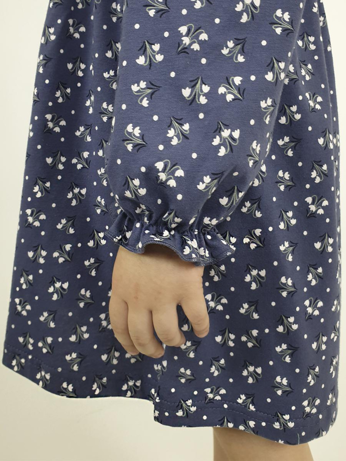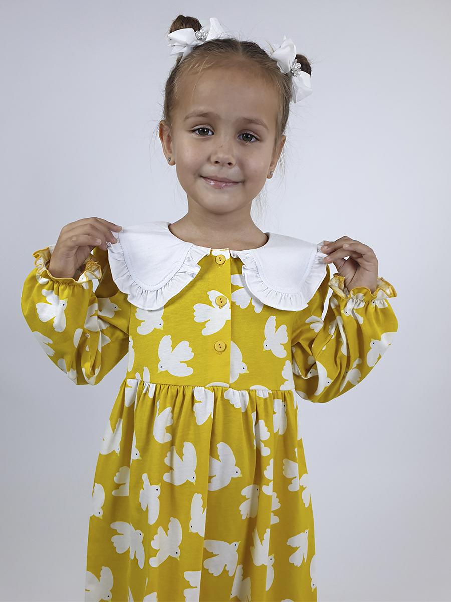 Кулирное полотно:100% х/б. Платье-полуприлегающий силуэт,длинный рукав с резинкой внизу,сборка по окату.Отрезная юбка в сборку.В горловине плосколежащий воротник с рюшей,застежка центральная на пуговицы.