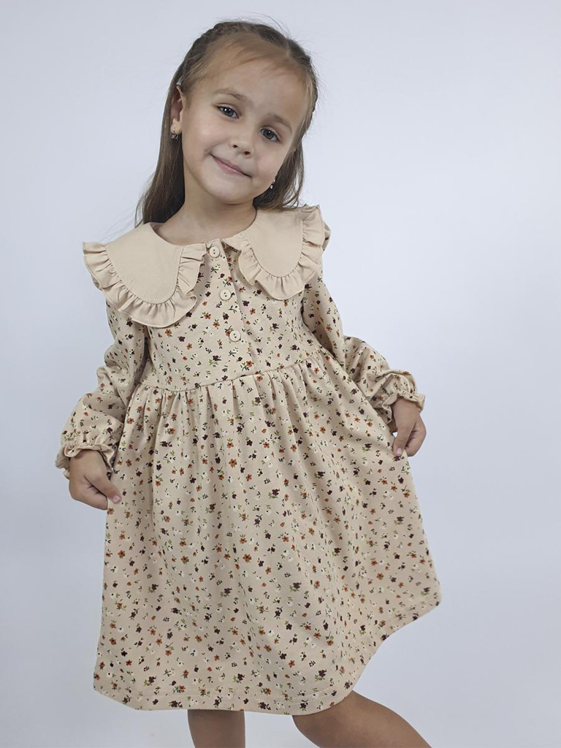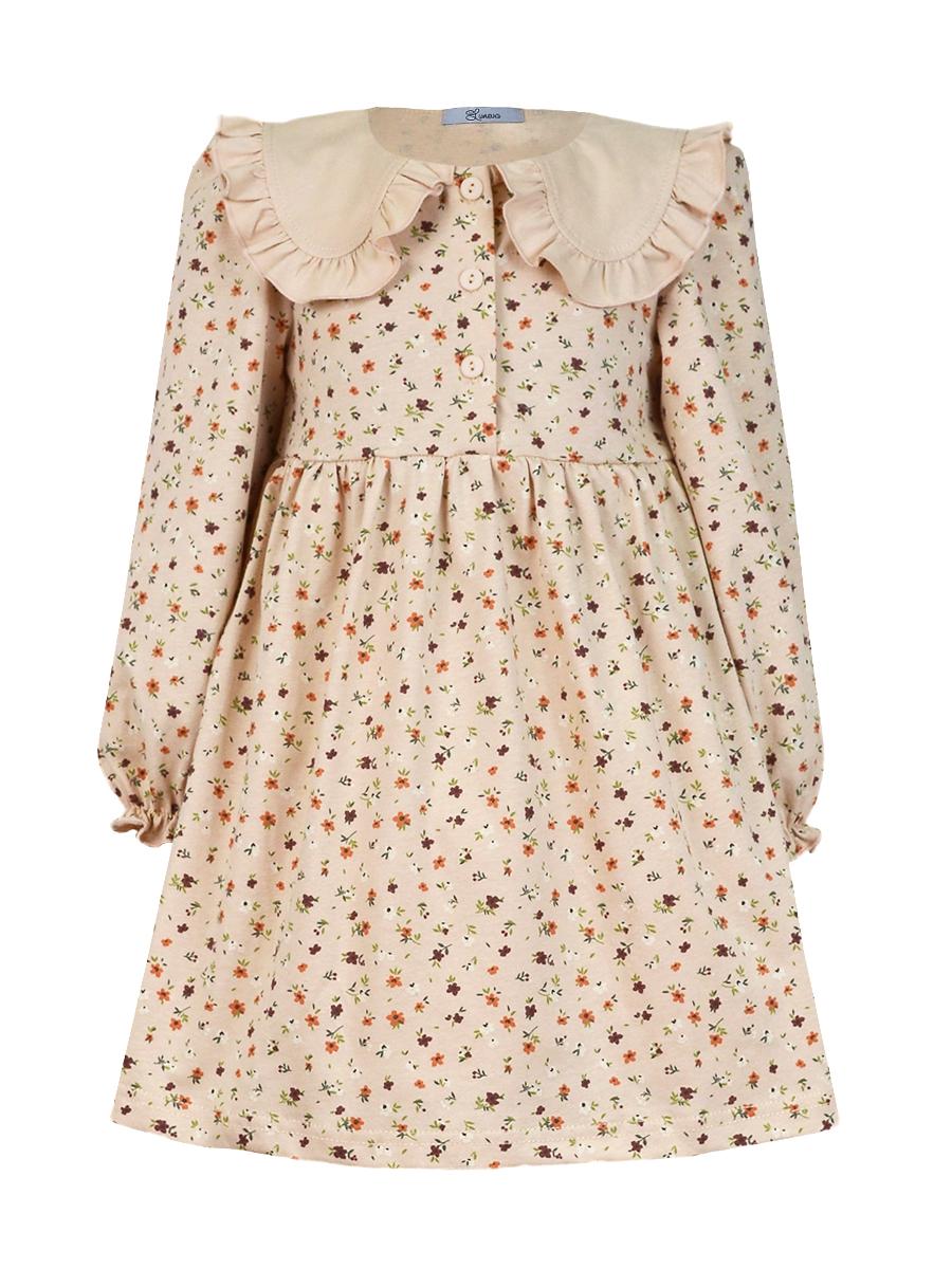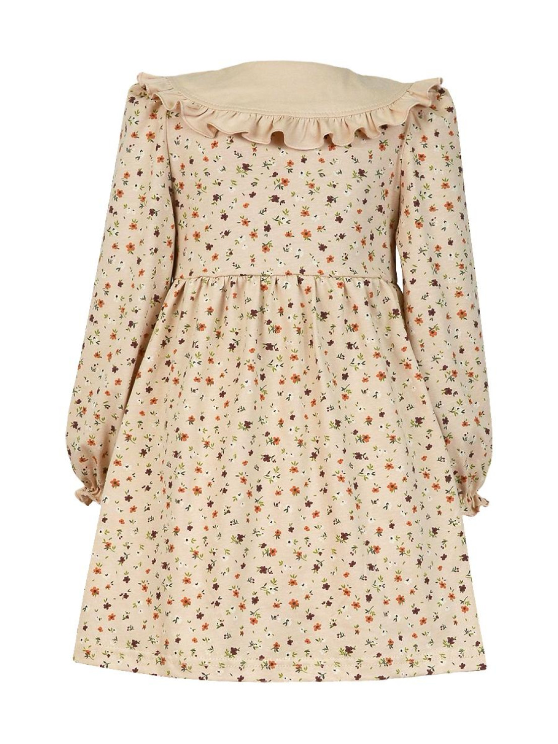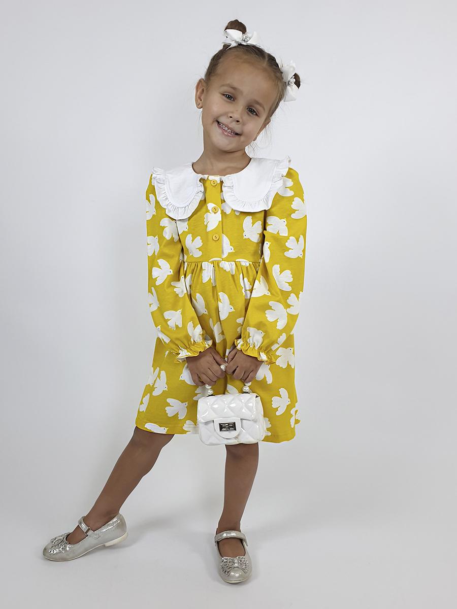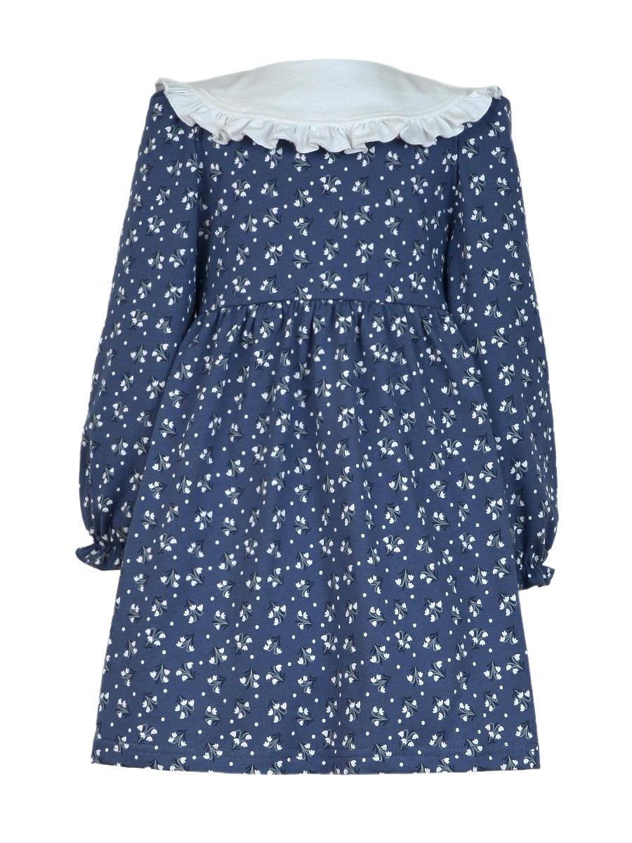 Кулирное полотно:100% х/б. Платье-полуприлегающий силуэт,длинный рукав с резинкой внизу,сборка по окату.Отрезная юбка в сборку.В горловине плосколежащий воротник с рюшей,застежка центральная на пуговицы.