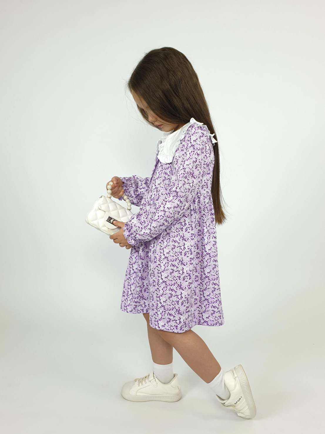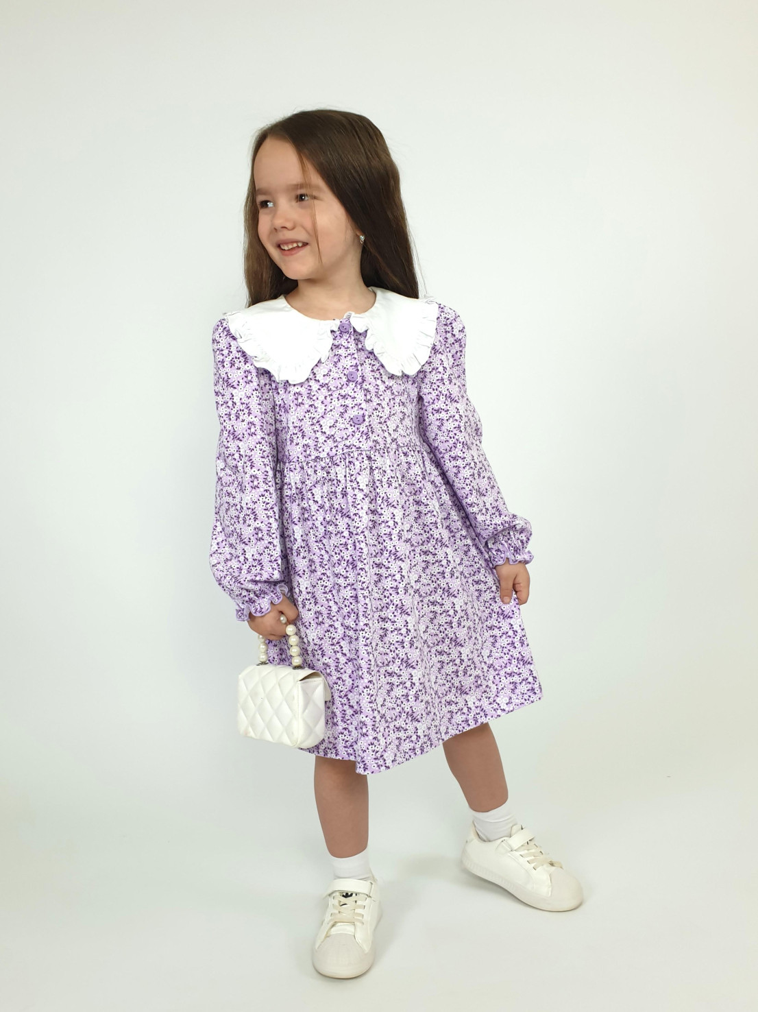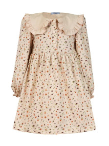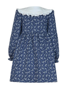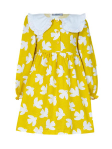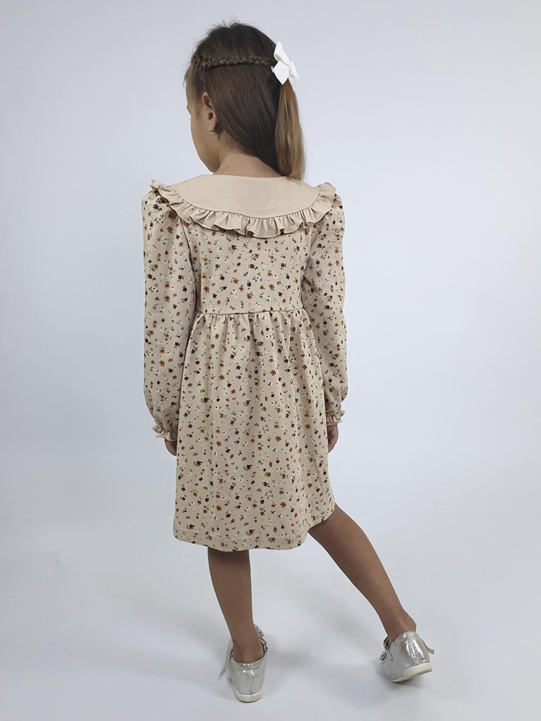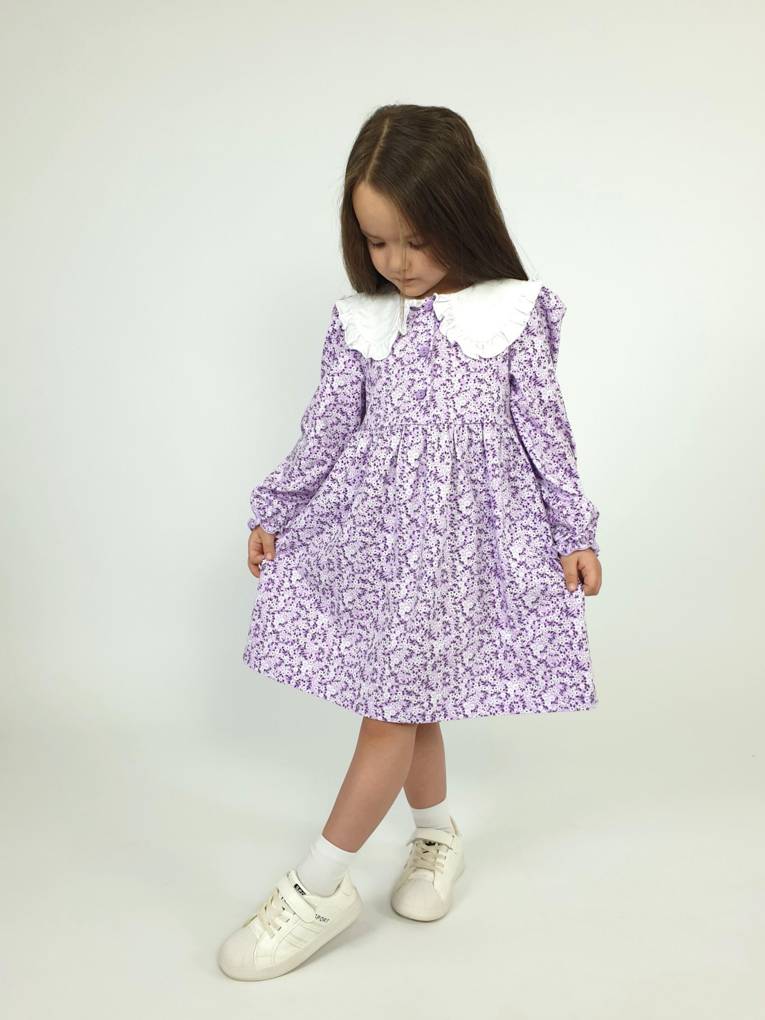 Кулирное полотно:100% х/б. Платье-полуприлегающий силуэт,длинный рукав с резинкой внизу,сборка по окату.Отрезная юбка в сборку.В горловине плосколежащий воротник с рюшей,застежка центральная на пуговицы.