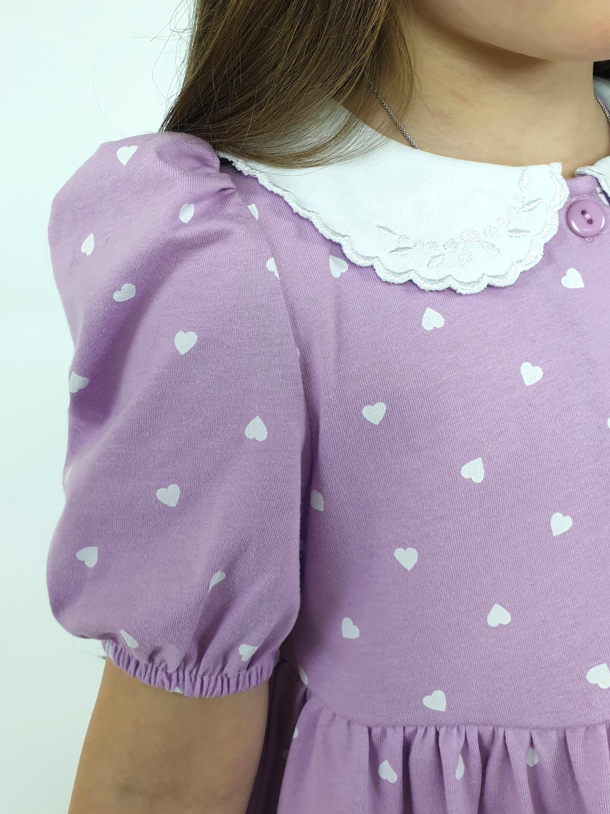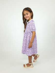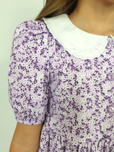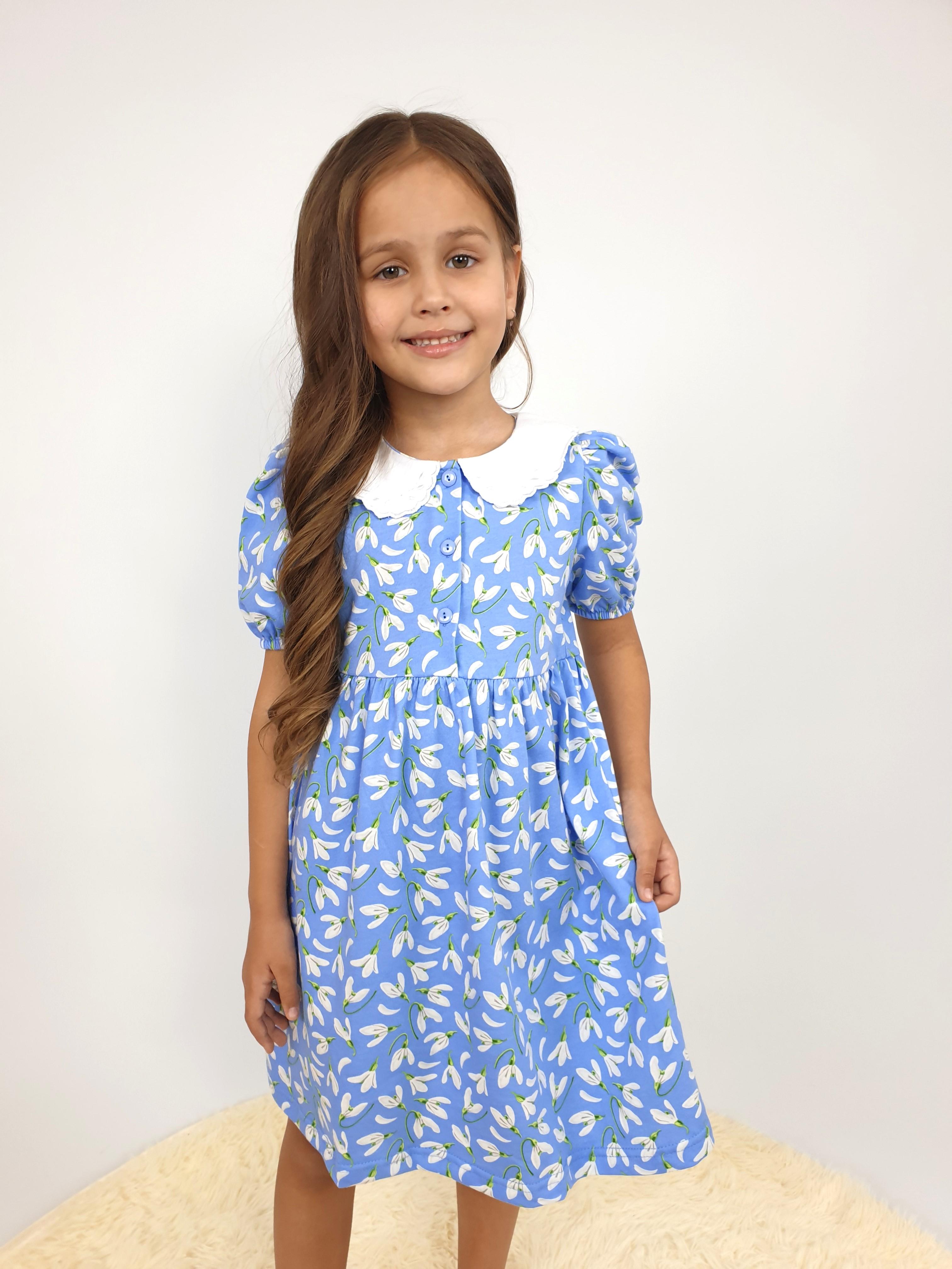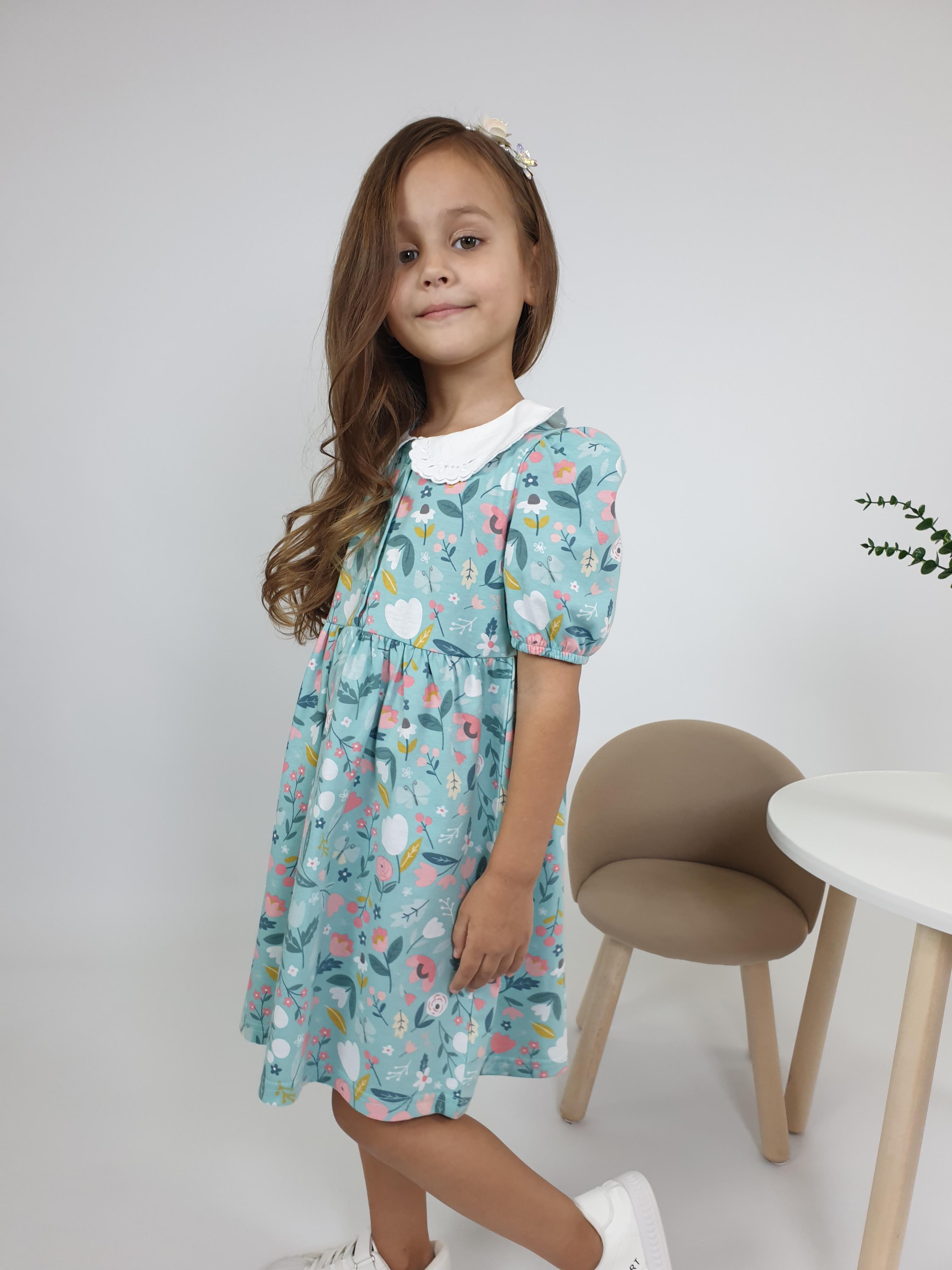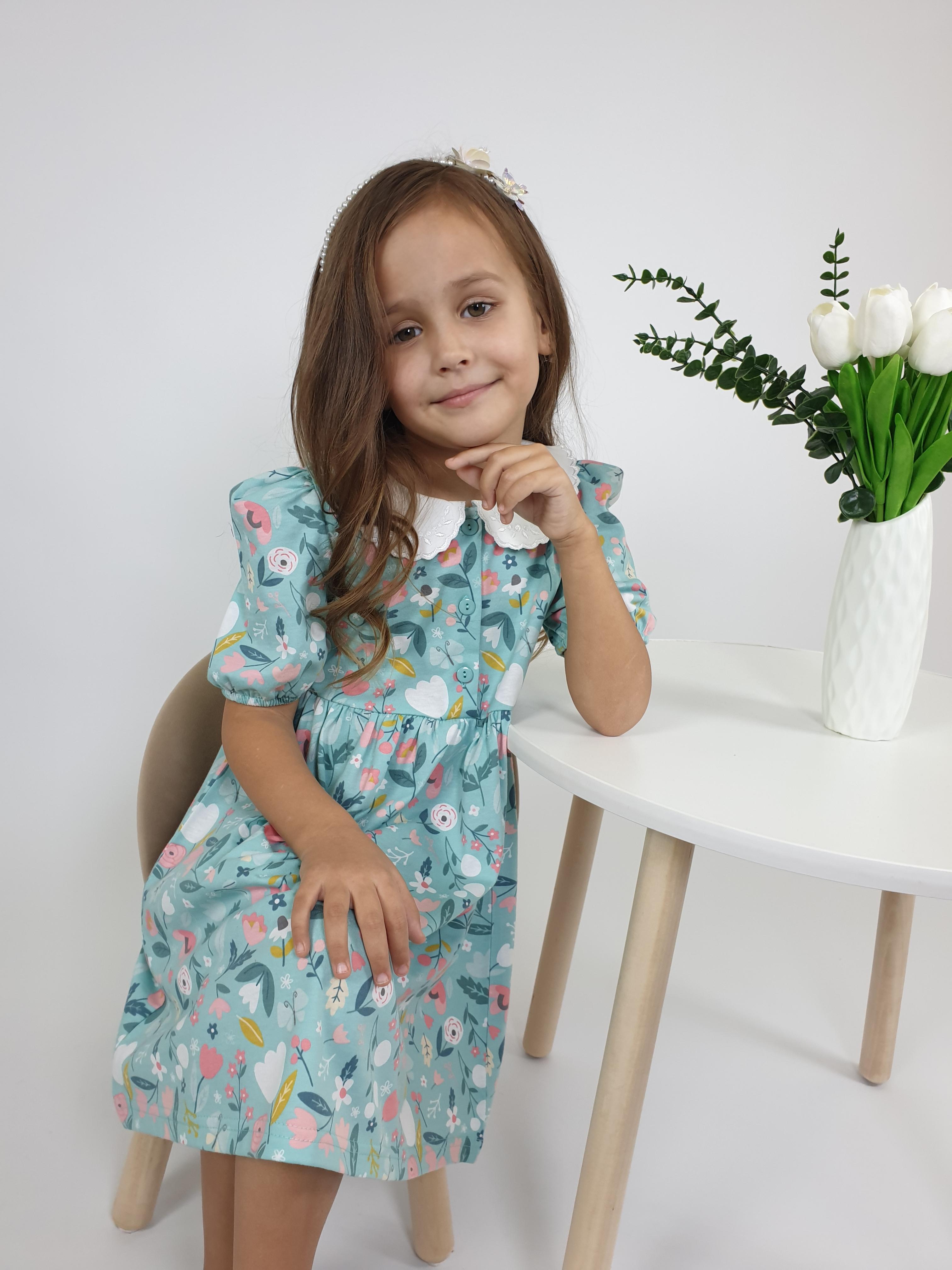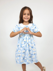 Кулирное полотно(набивка):100% х/б. Платье-с отрезной юбкой в сборку.Короткий рукав с резинкой внизу,сборка по окату.Горловина окантована и подшита.Вышитый отделочный воротник,настрочен на окантовку.Застежка центральная на пуговицы.