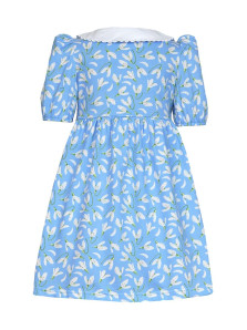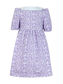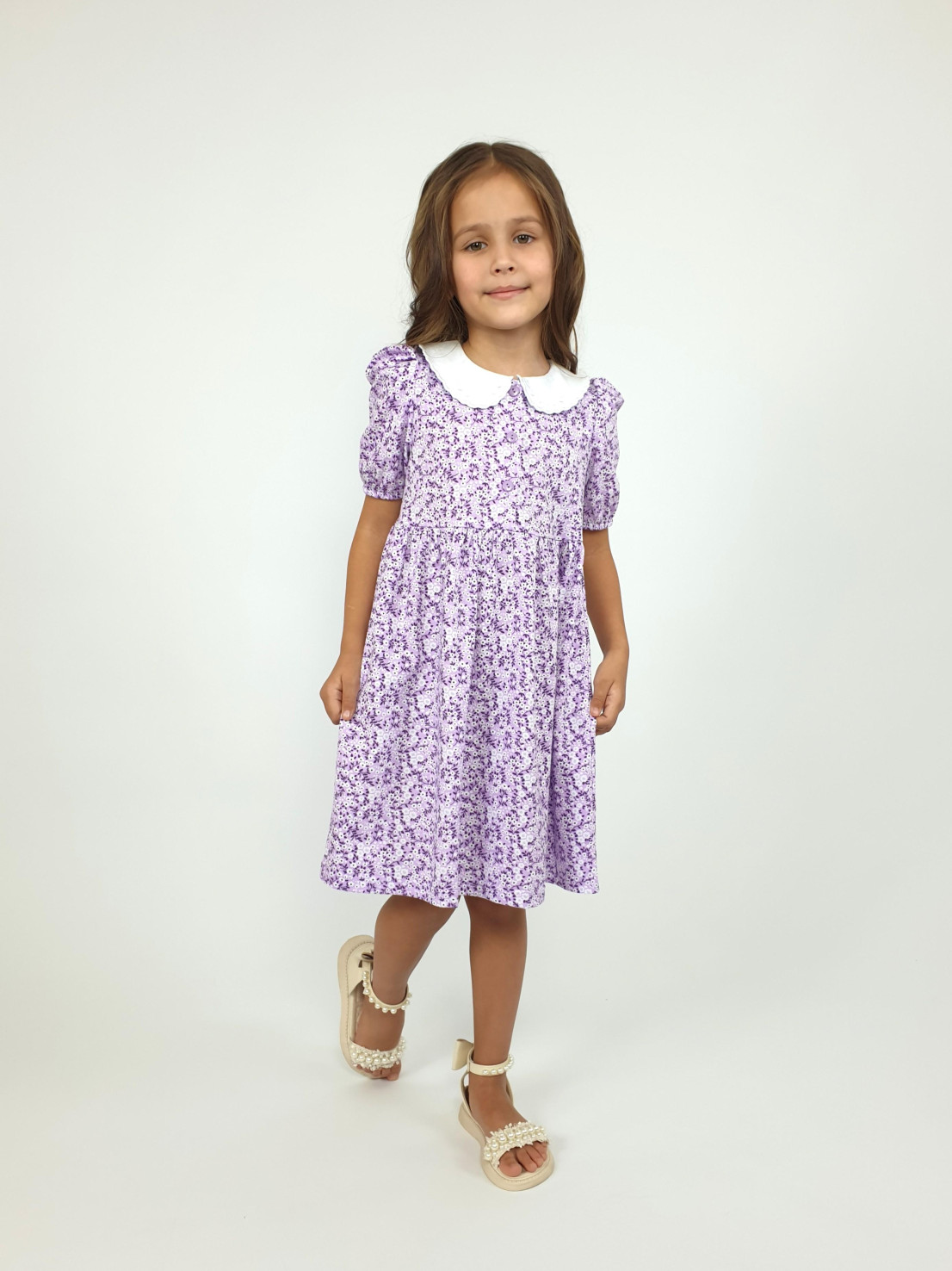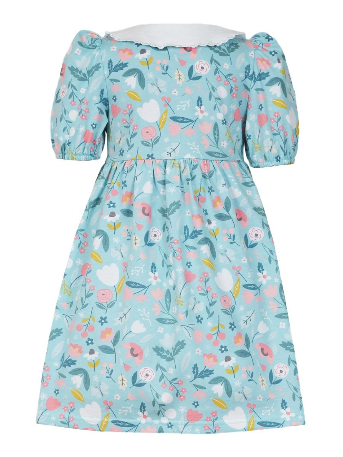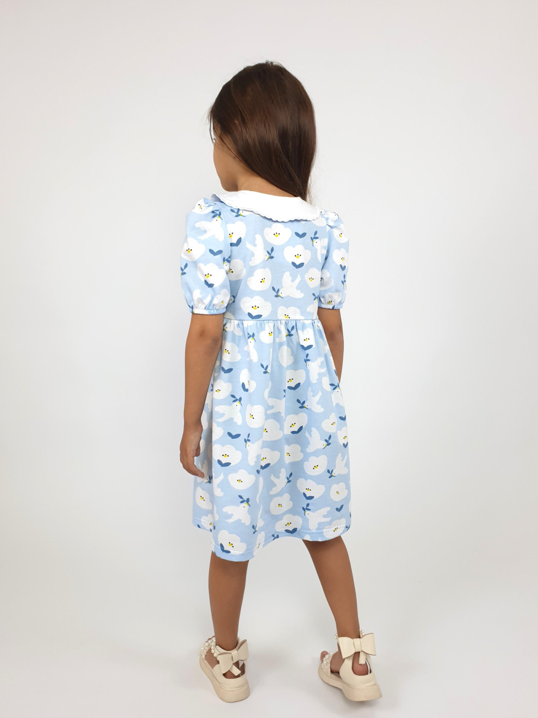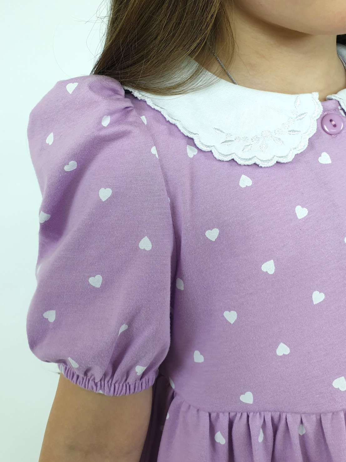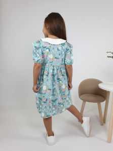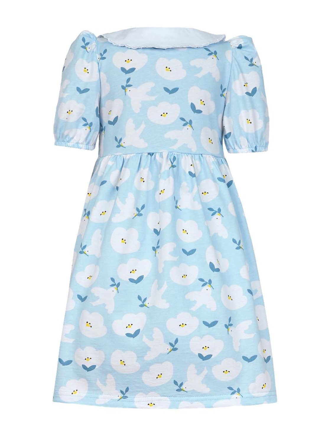 Кулирное полотно(набивка):100% х/б. Платье-с отрезной юбкой в сборку.Короткий рукав с резинкой внизу,сборка по окату.Горловина окантована и подшита.Вышитый отделочный воротник,настрочен на окантовку.Застежка центральная на пуговицы.