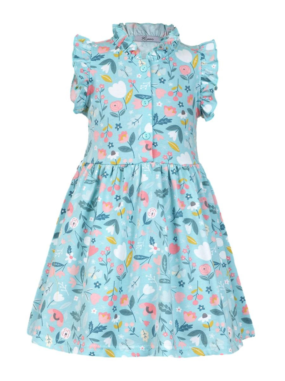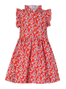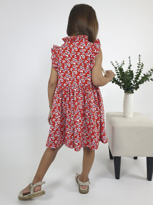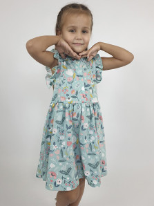 Кулирное полотно(набивка):100% х/б. Платье-полуприлегающего силуэта,без рукава,рюша в горловине и пройме.Отрезная юбка со сборкой.Горловина окантована и подшита,застежка центральная на пуговицы.