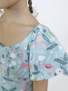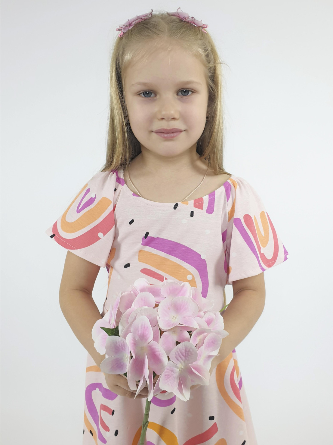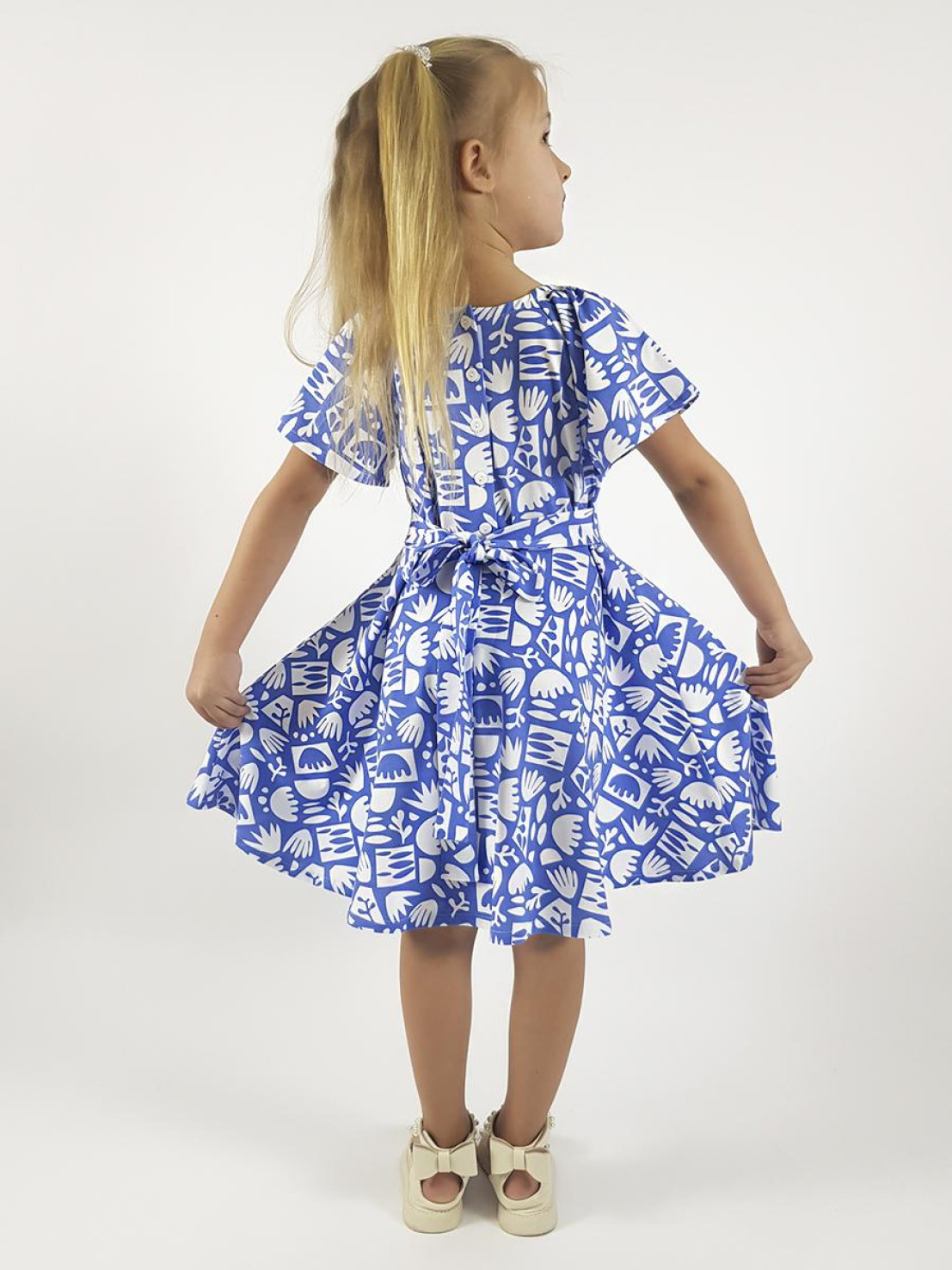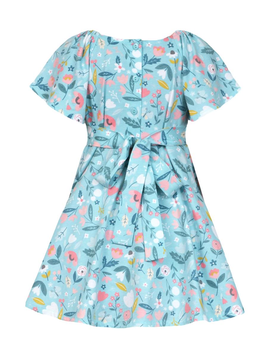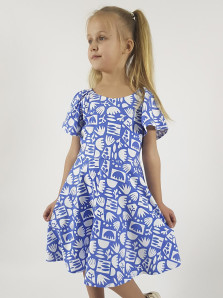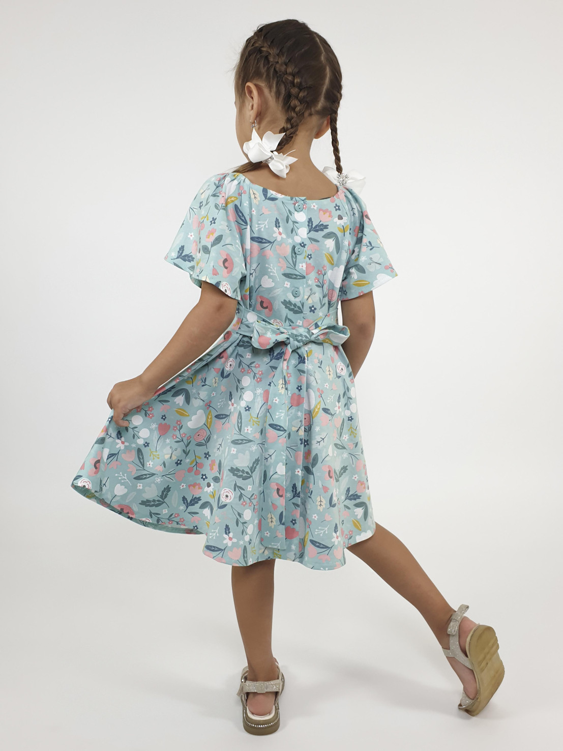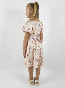 Кулирное полотно(набивка): 100% х/б. Платье-с отрезной юбкой"клеш".Рукав реглан,короткий в горловине собран на резинку.Вырез горловины переда и спинки подшит.Застежка на пуговицы,завязывающийся пояс на спинке.
