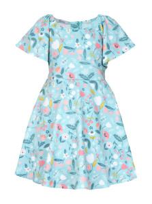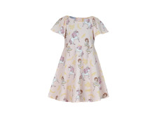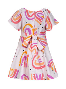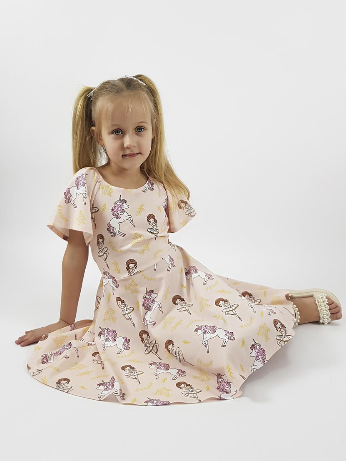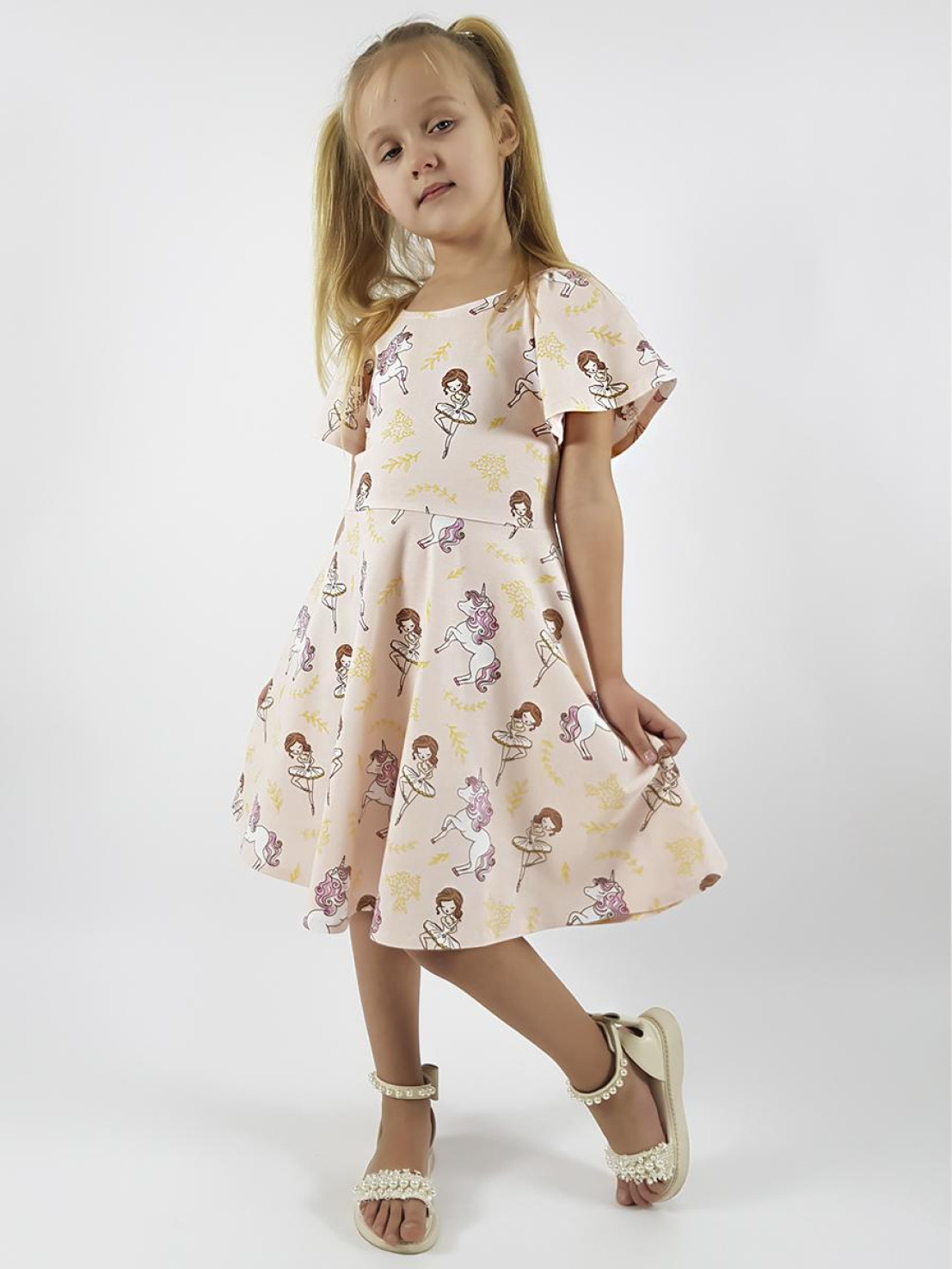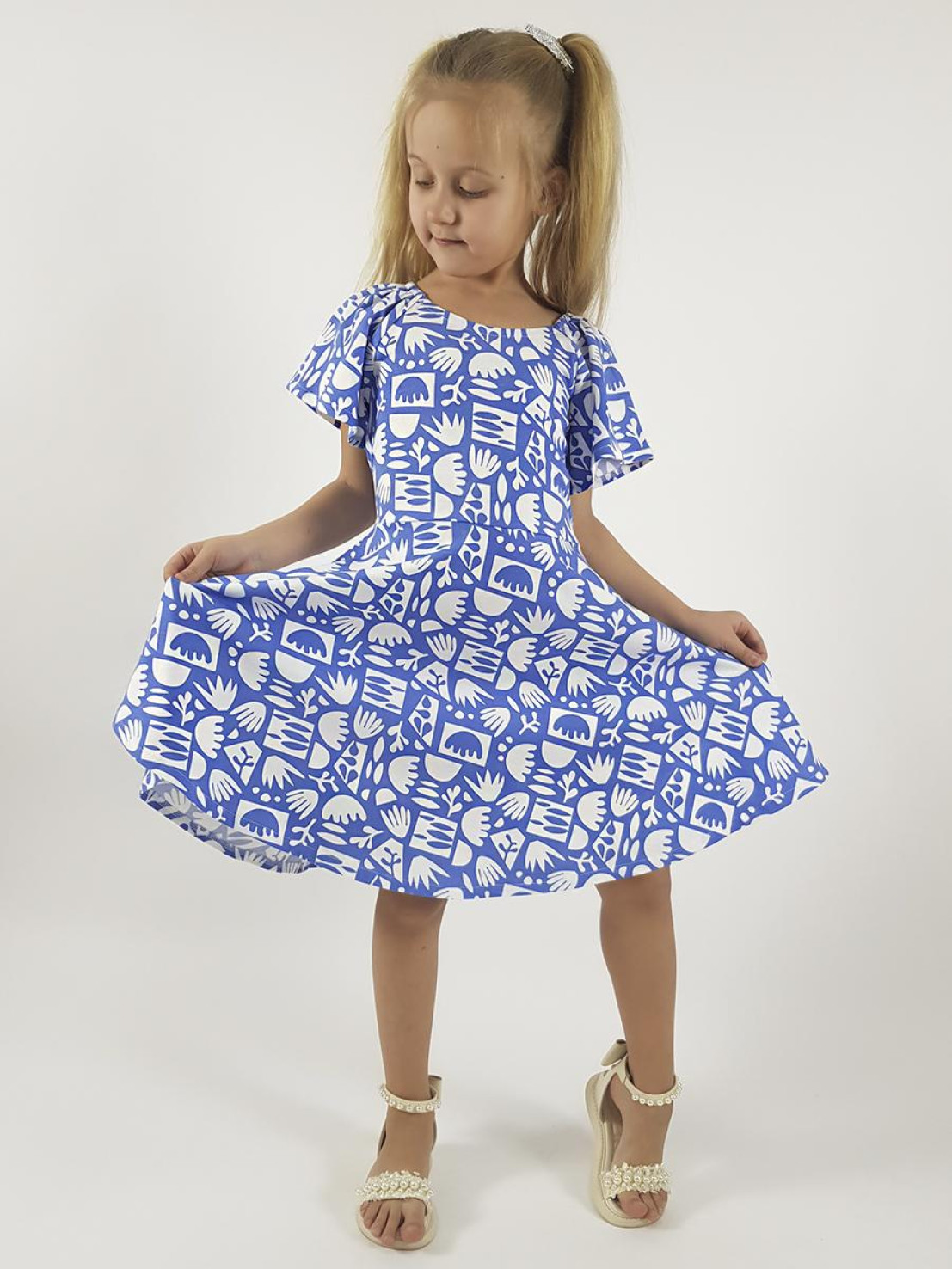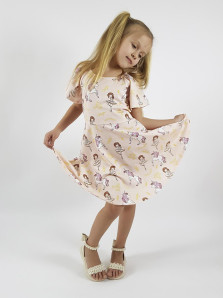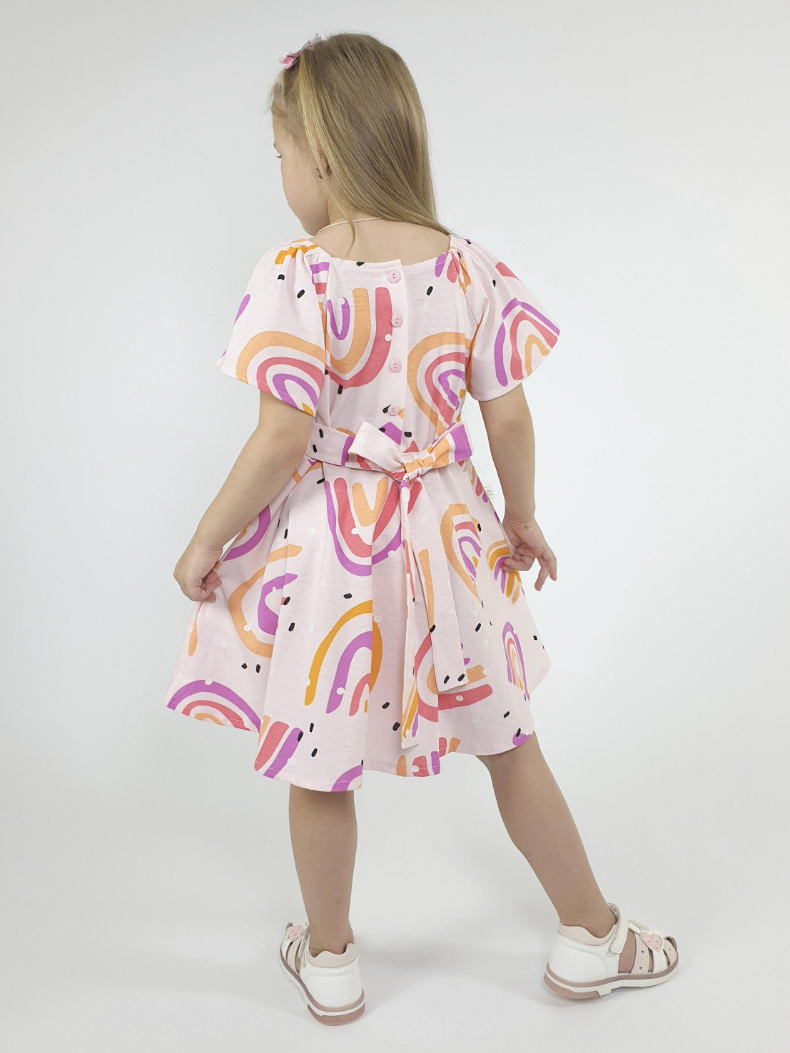 Кулирное полотно(набивка): 100% х/б. Платье-с отрезной юбкой"клеш".Рукав реглан,короткий в горловине собран на резинку.Вырез горловины переда и спинки подшит.Застежка на пуговицы,завязывающийся пояс на спинке.