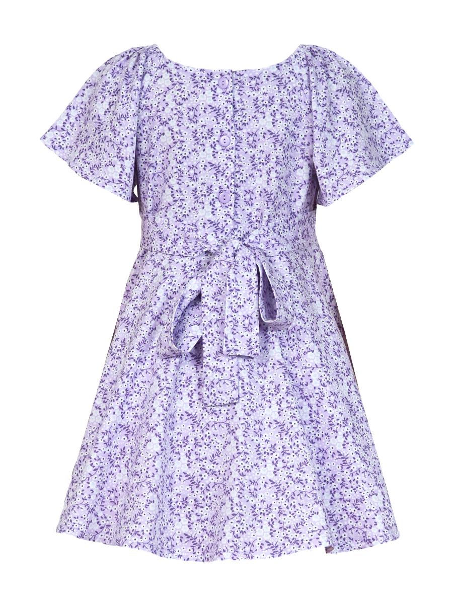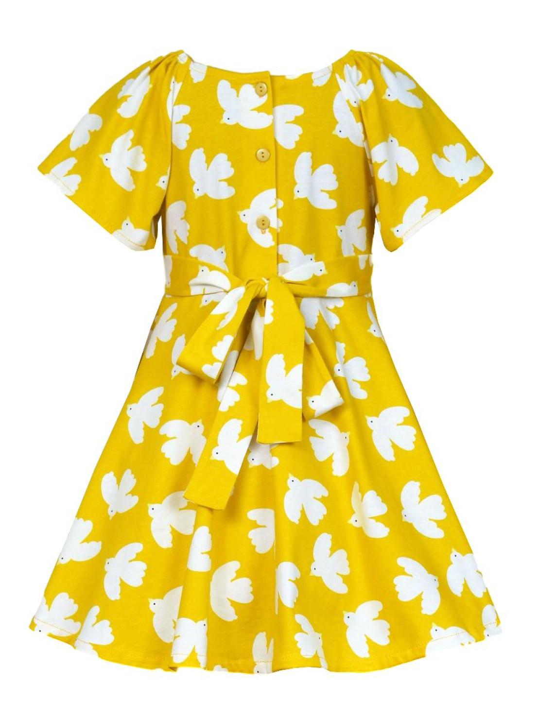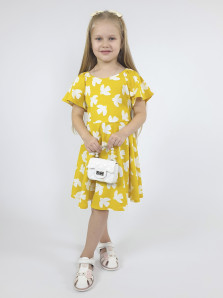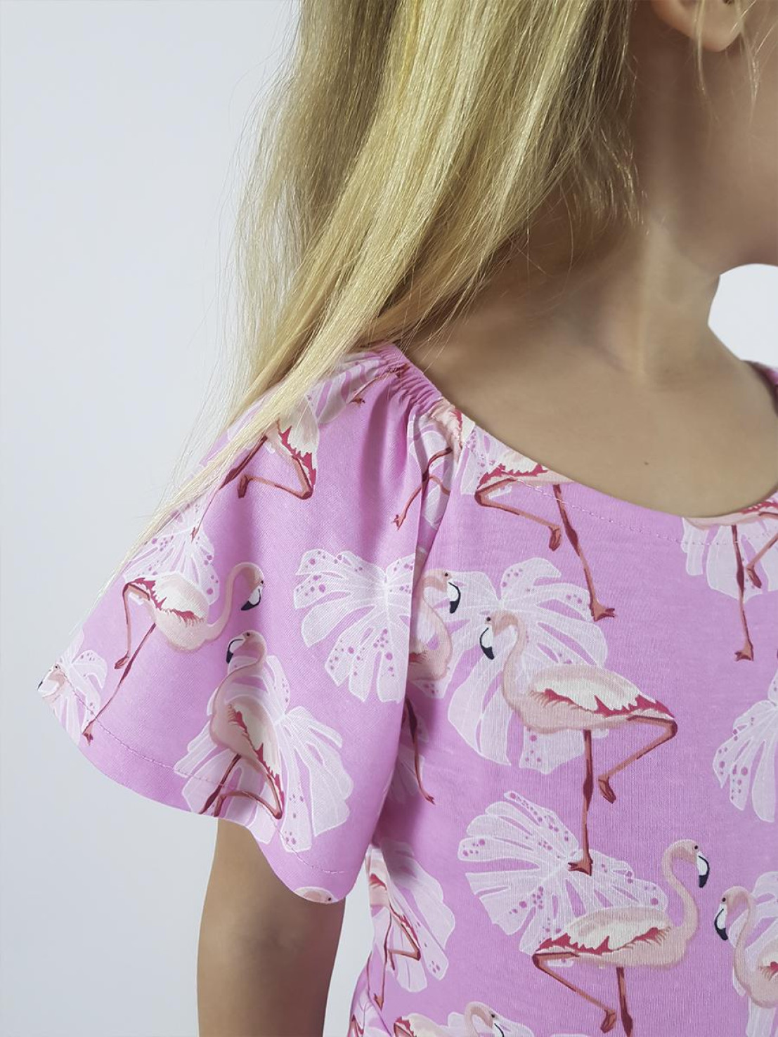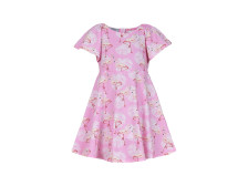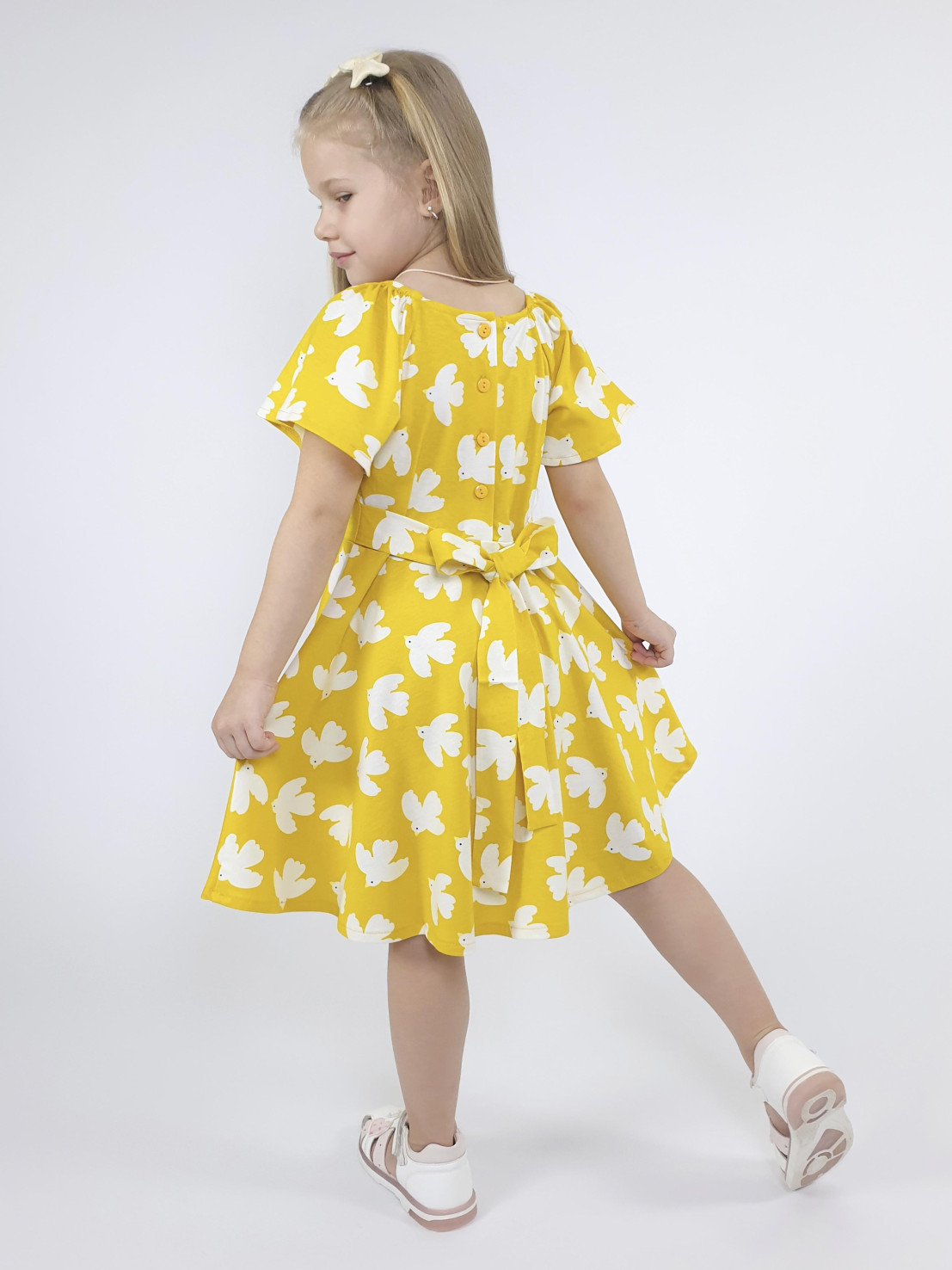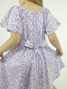 Кулирное полотно(набивка): 100% х/б. Платье-с отрезной юбкой"клеш".Рукав реглан,короткий в горловине собран на резинку.Вырез горловины переда и спинки подшит.Застежка на пуговицы,завязывающийся пояс на спинке.