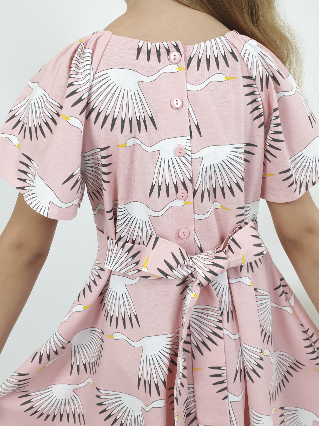 Кулирное полотно(набивка): 100% х/б. Платье-с отрезной юбкой"клеш".Рукав реглан,короткий в горловине собран на резинку.Вырез горловины переда и спинки подшит.Застежка на пуговицы,завязывающийся пояс на спинке.