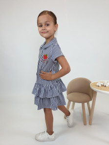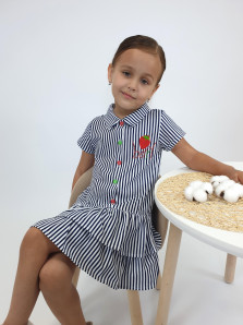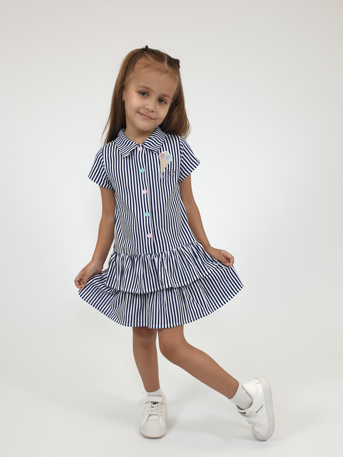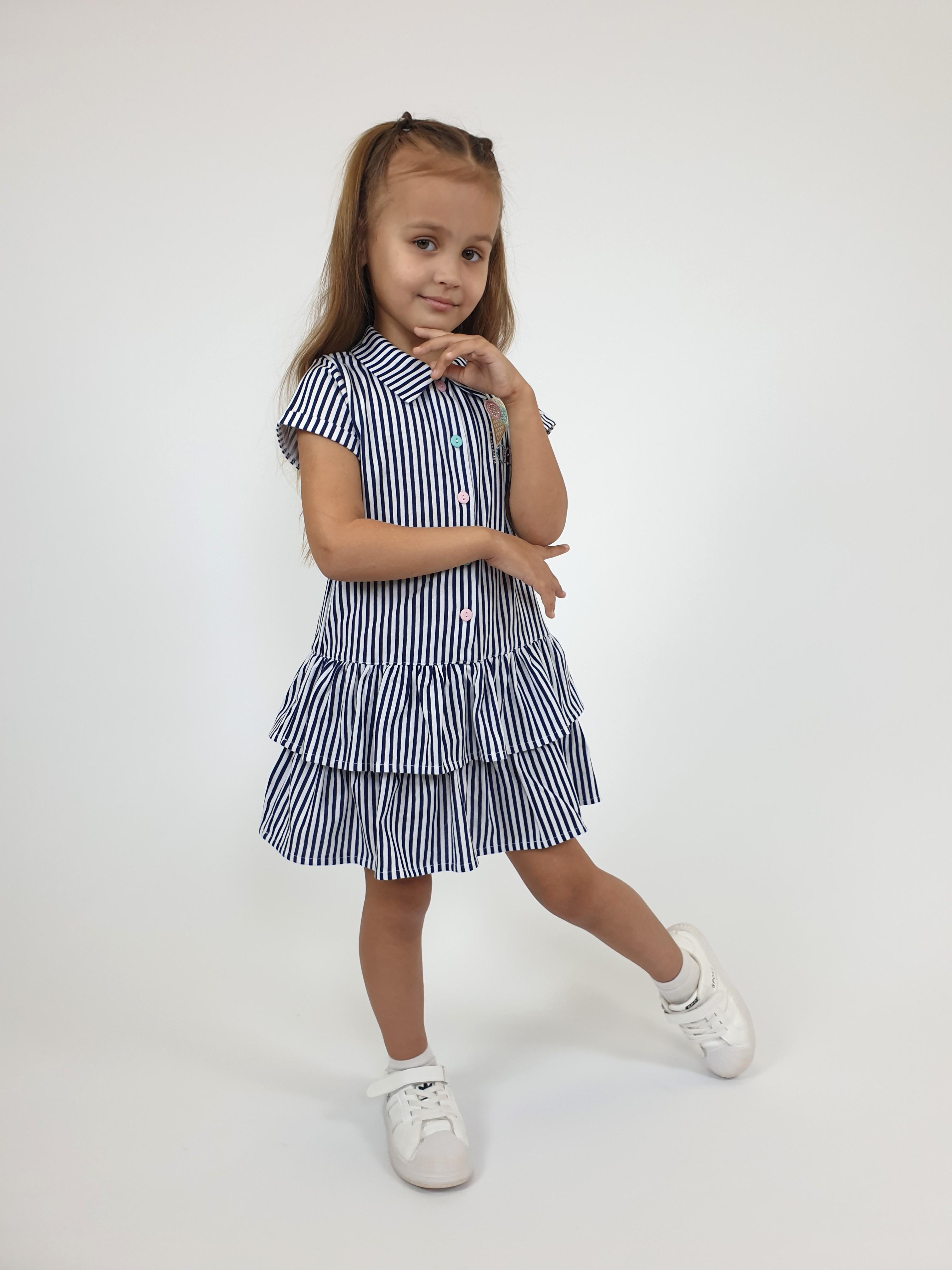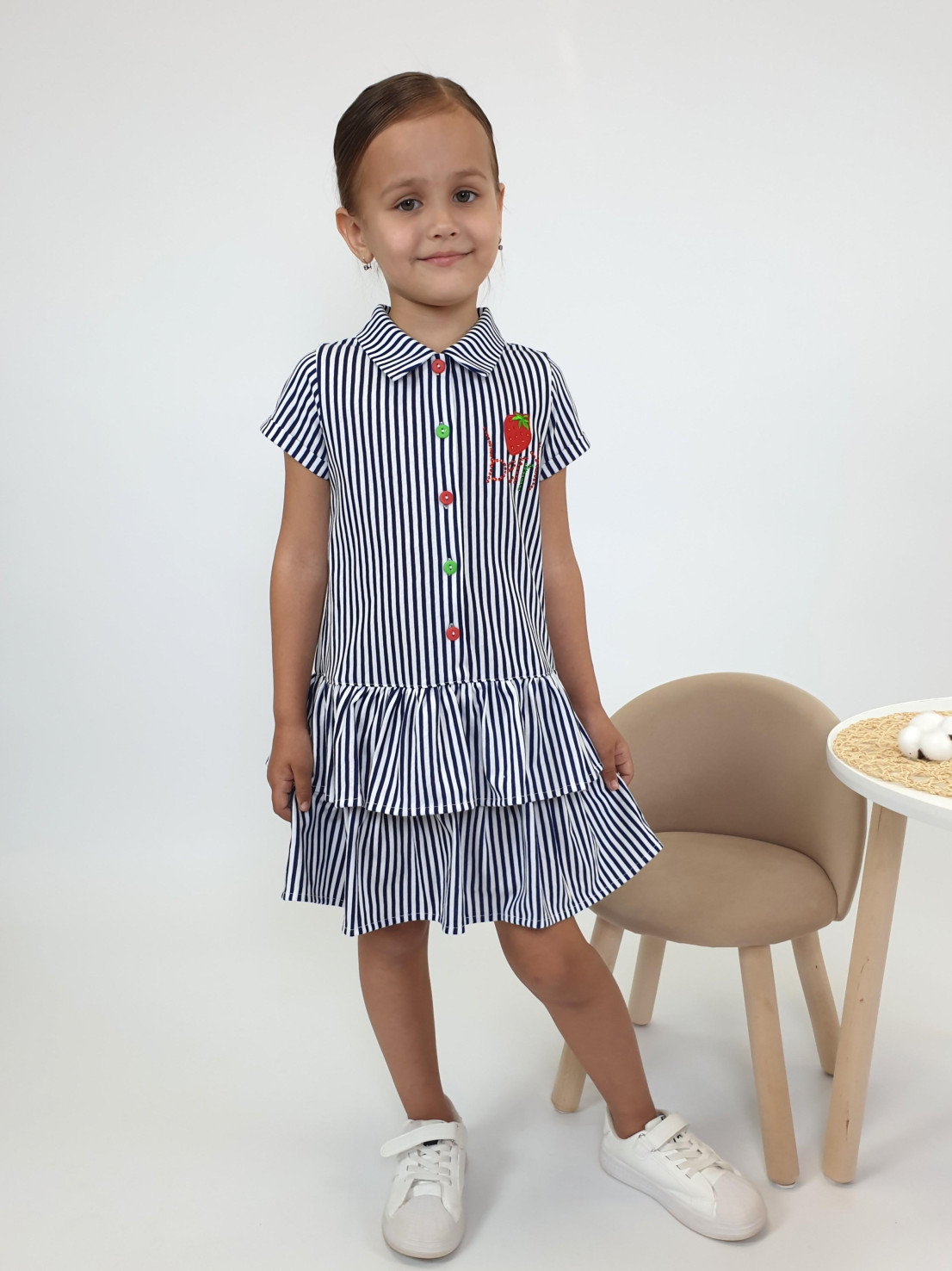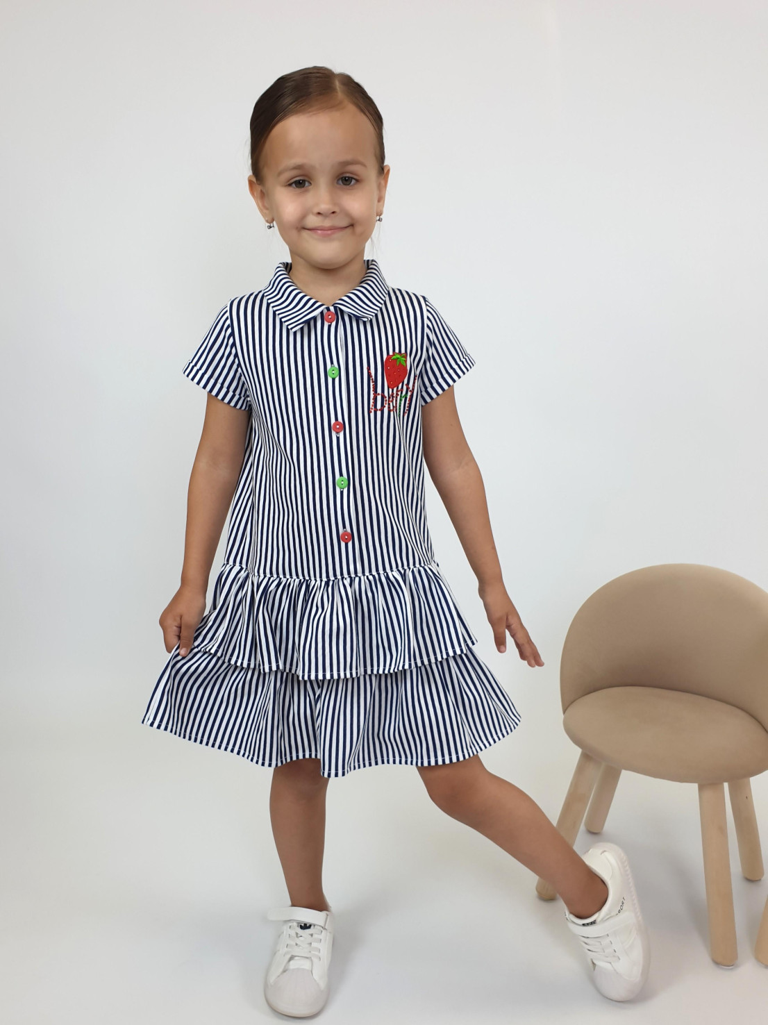 Летнее платье для девочки выполнено из качественного кулирного полотна (100% хлопок).Платье – силуэт трапеция с воланами, декорировано оригинальным принтом с вышивкой и контрастными пуговицами. Модель с коротким рукавом . Такое платье идеально подойдёт для прогулки в тёплый день, а также для садика, похода в гости.