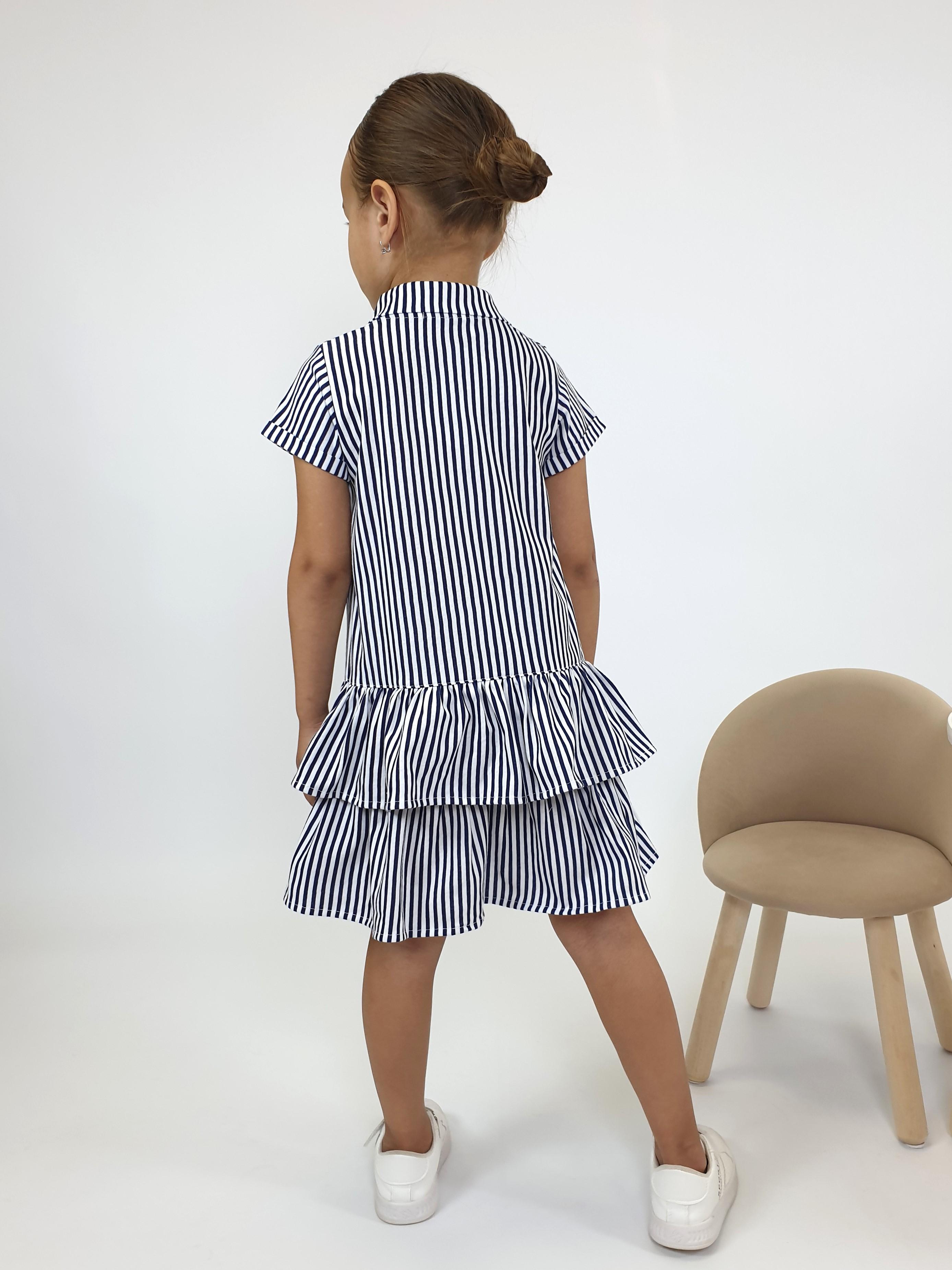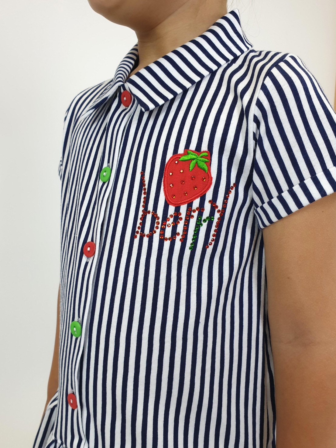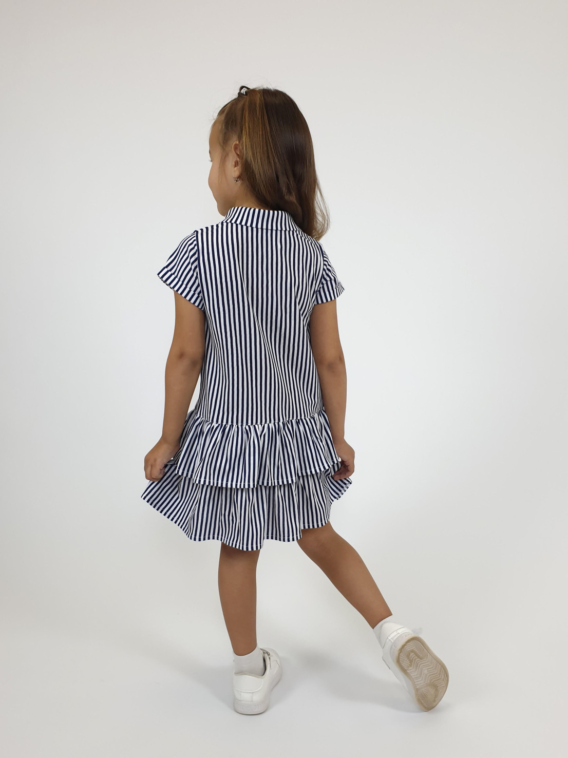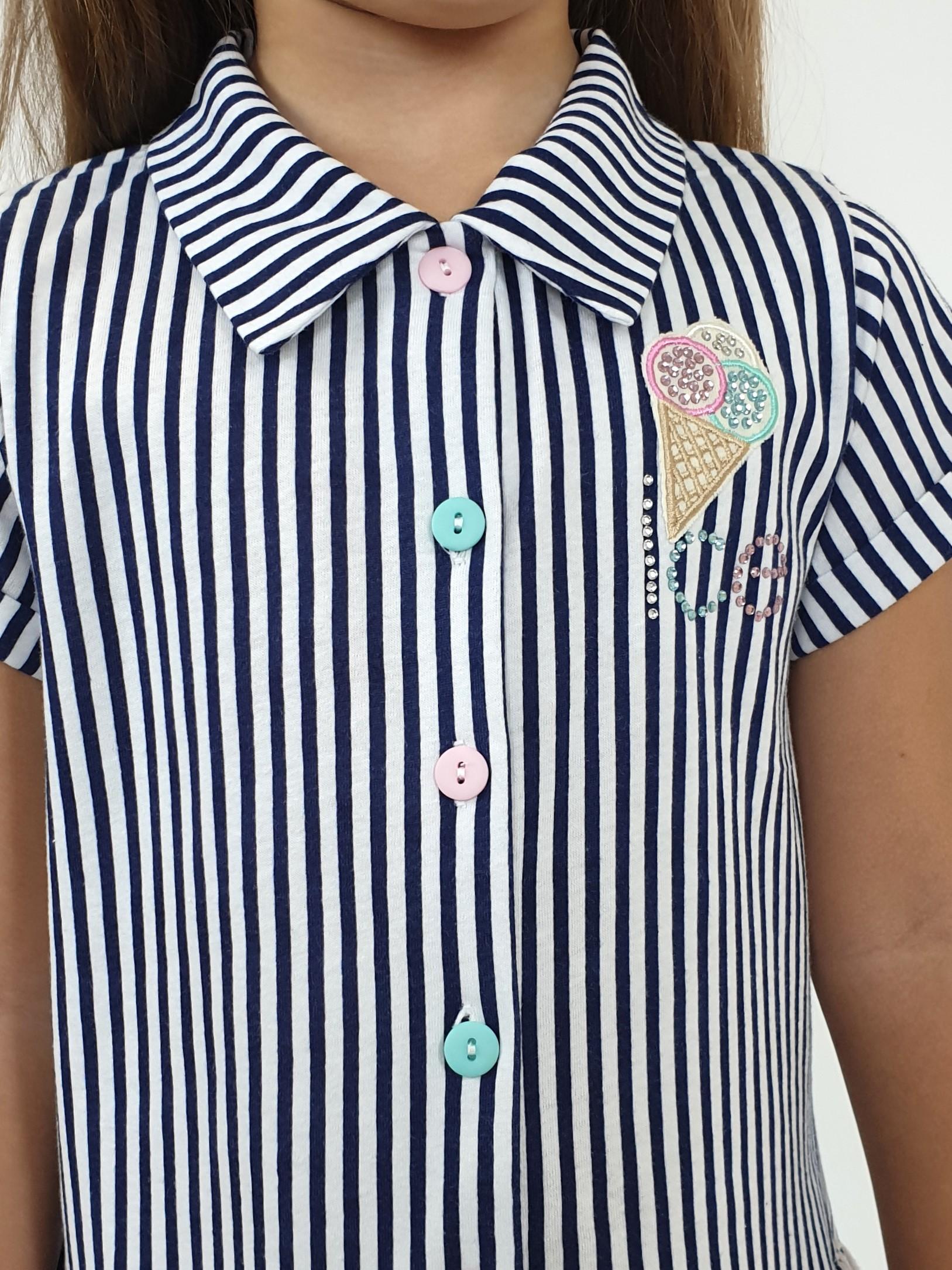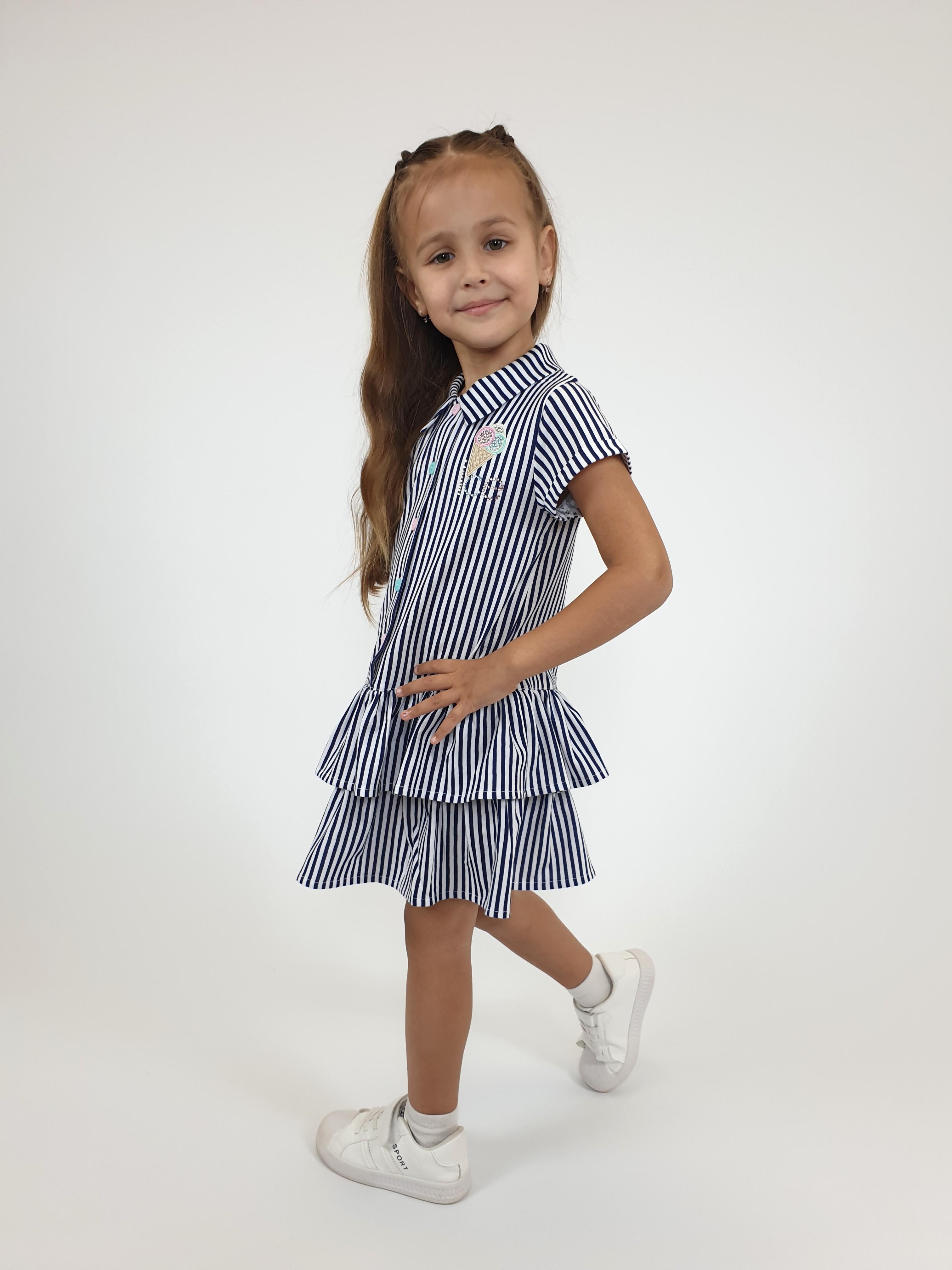 Летнее платье для девочки выполнено из качественного кулирного полотна (100% хлопок).Платье – силуэт трапеция с воланами, декорировано оригинальным принтом с вышивкой и контрастными пуговицами. Модель с коротким рукавом . Такое платье идеально подойдёт для прогулки в тёплый день, а также для садика, похода в гости.