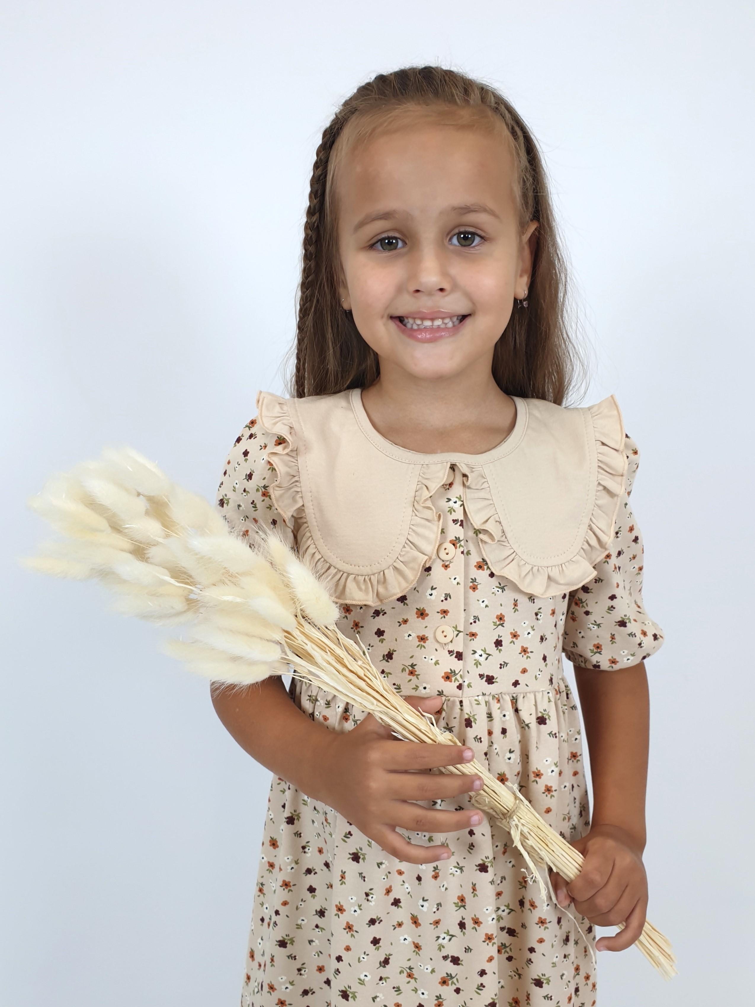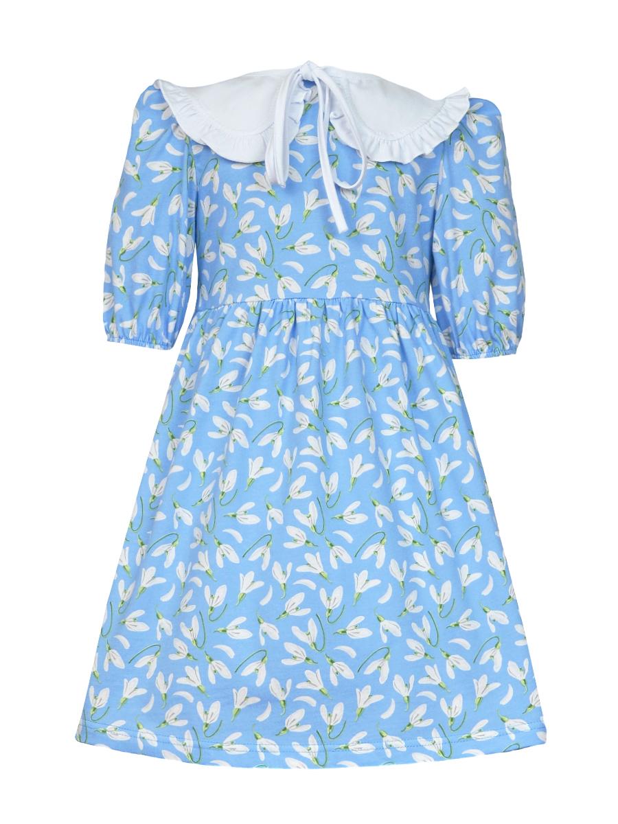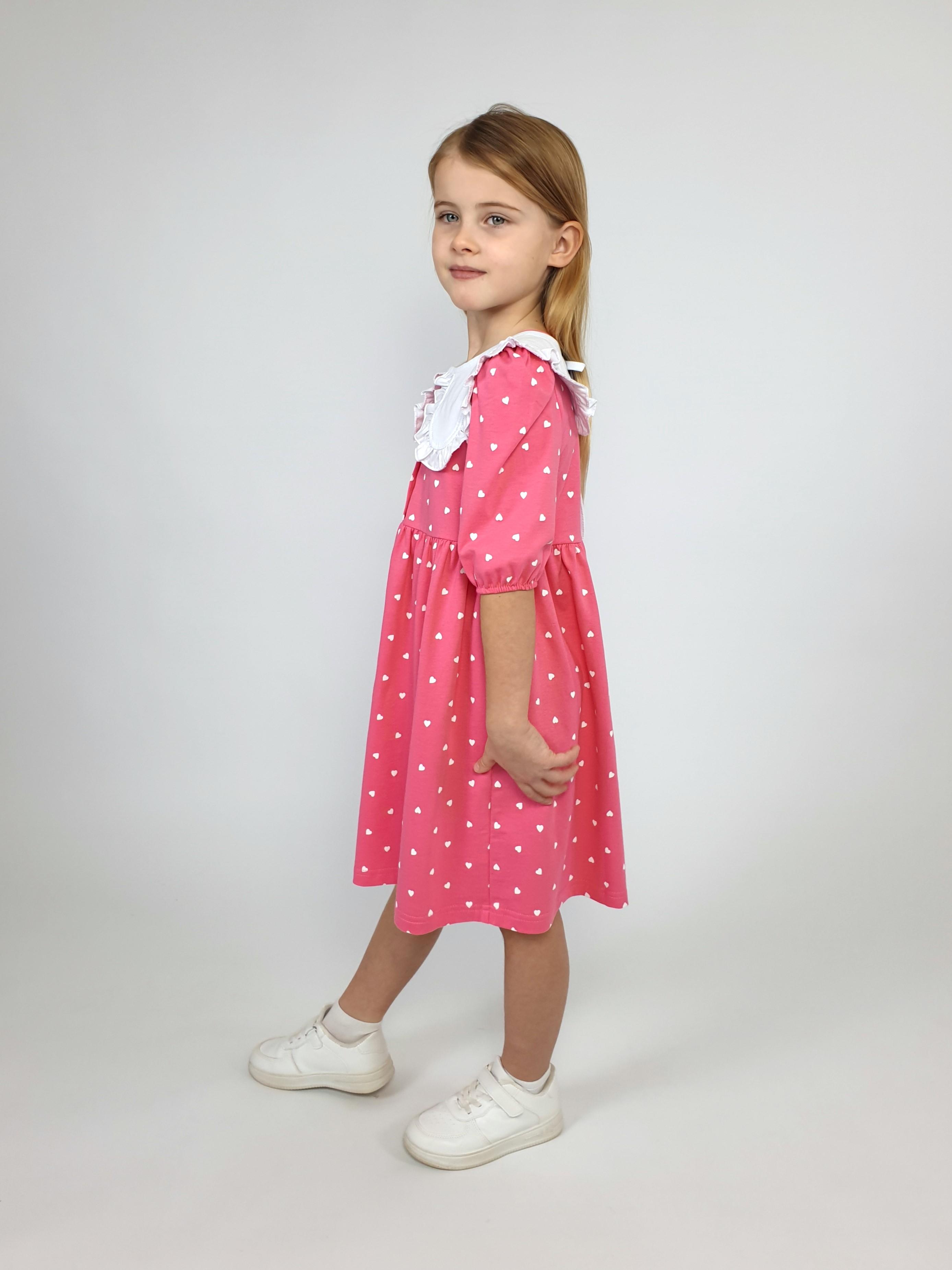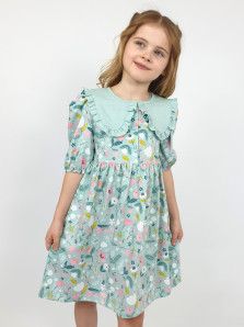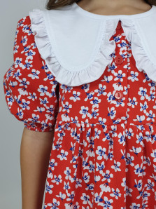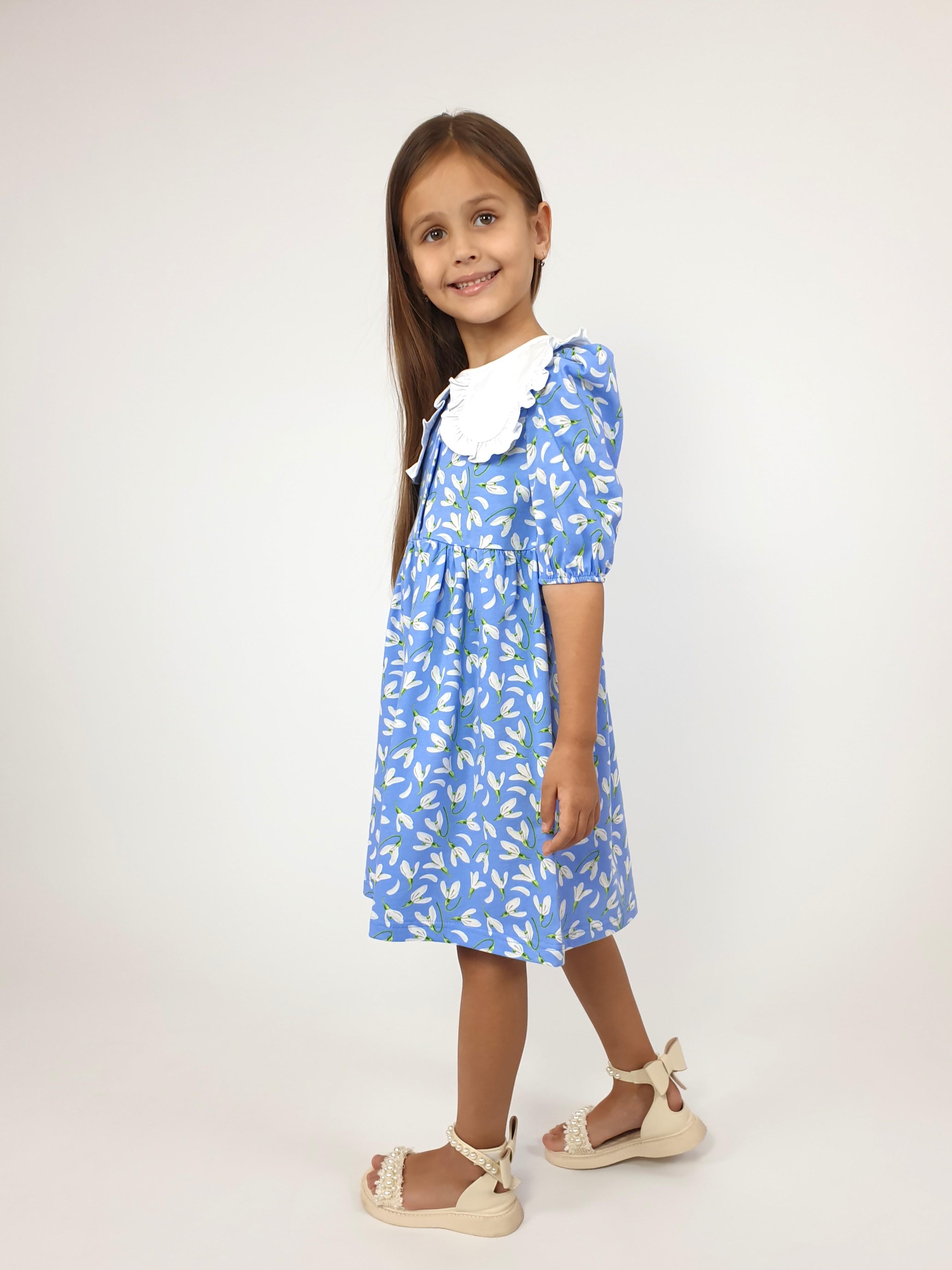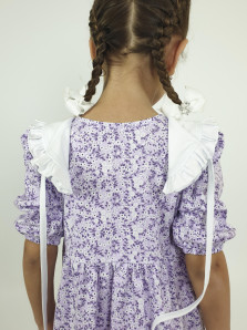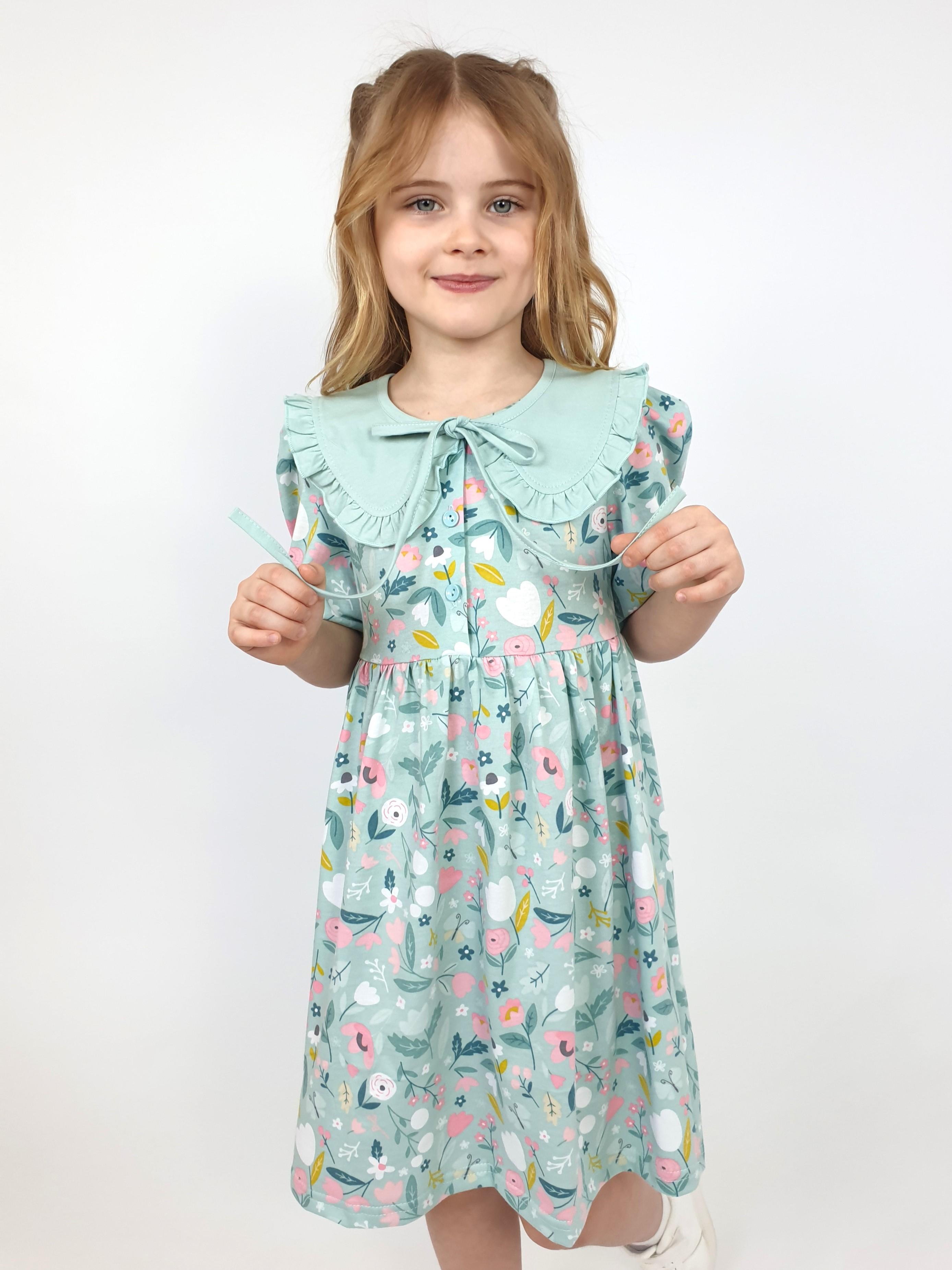 Кулирное полотно:100% х/б. Платье-с отрезной юбкой в сборку.Короткий рукав с резинкой внизу,сборка по окату.Горловина окантована и подшита,застежка центральная на пуговицы.Отделочный съемный воротник с рюшей,завязывающийся на бант.