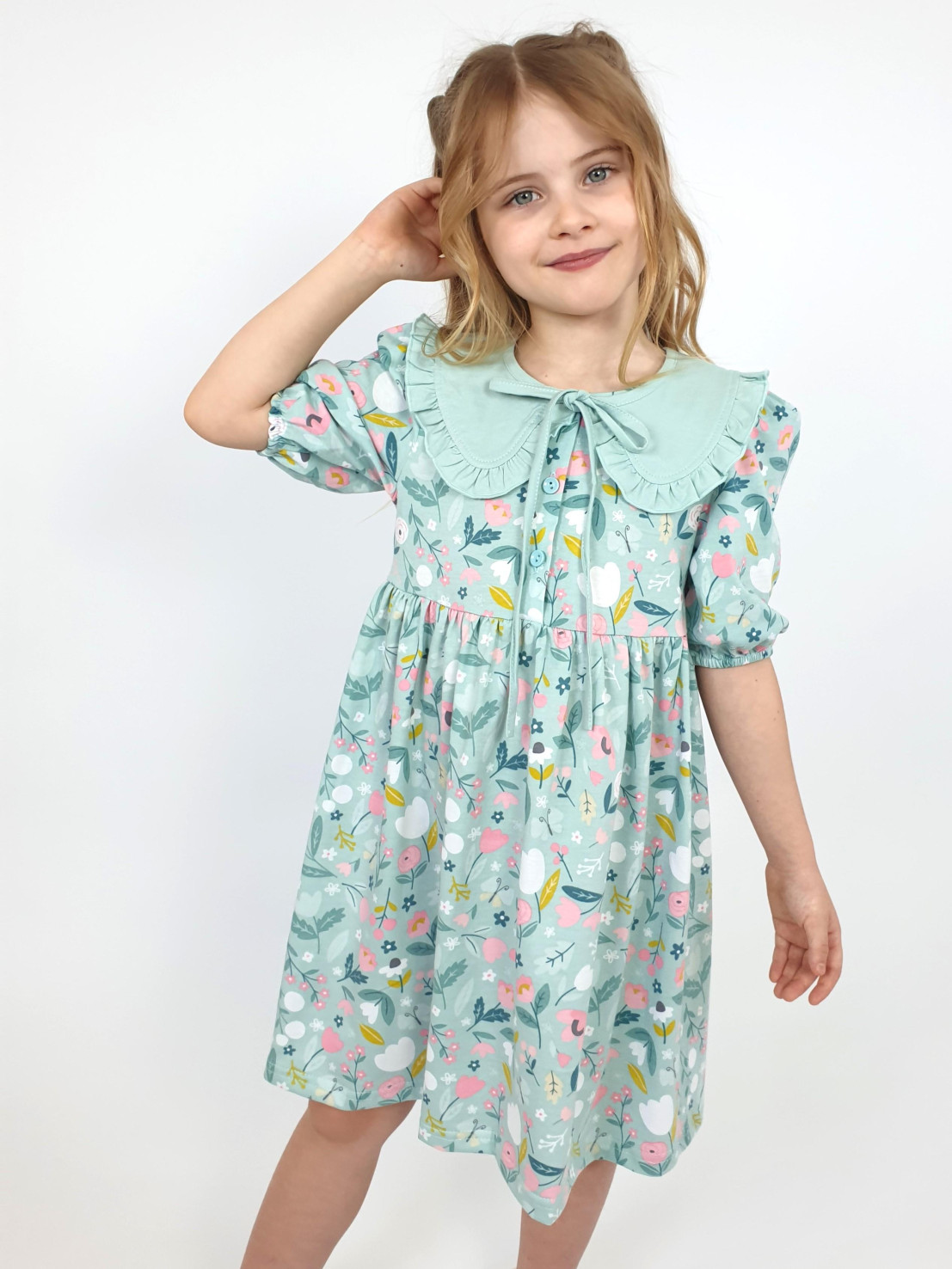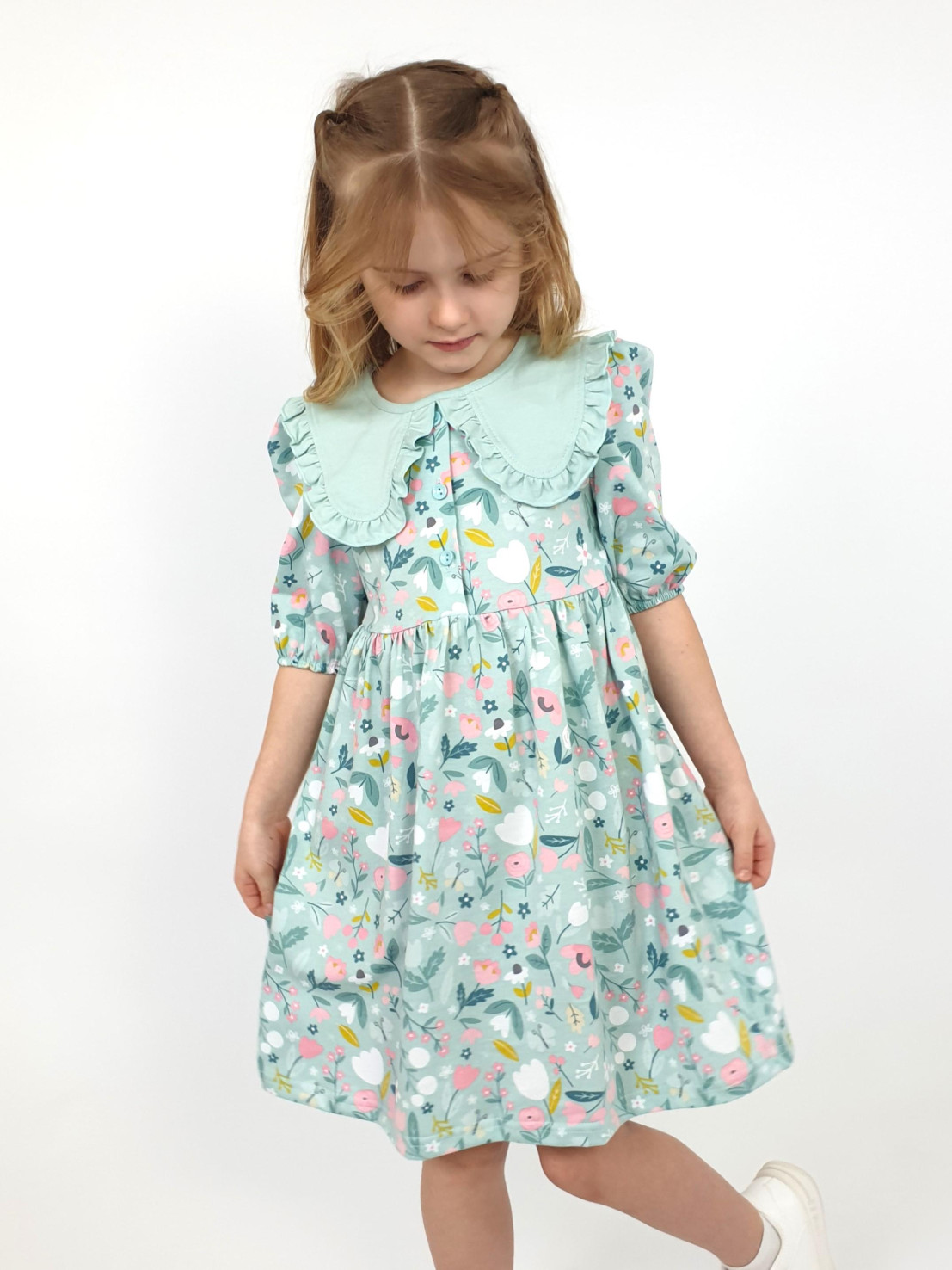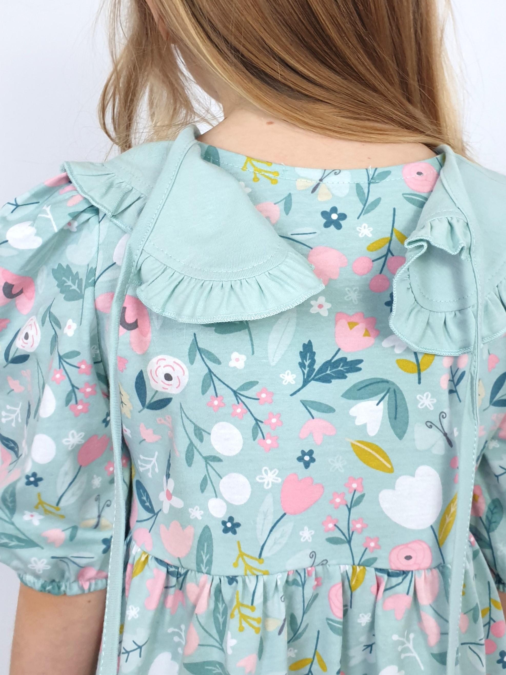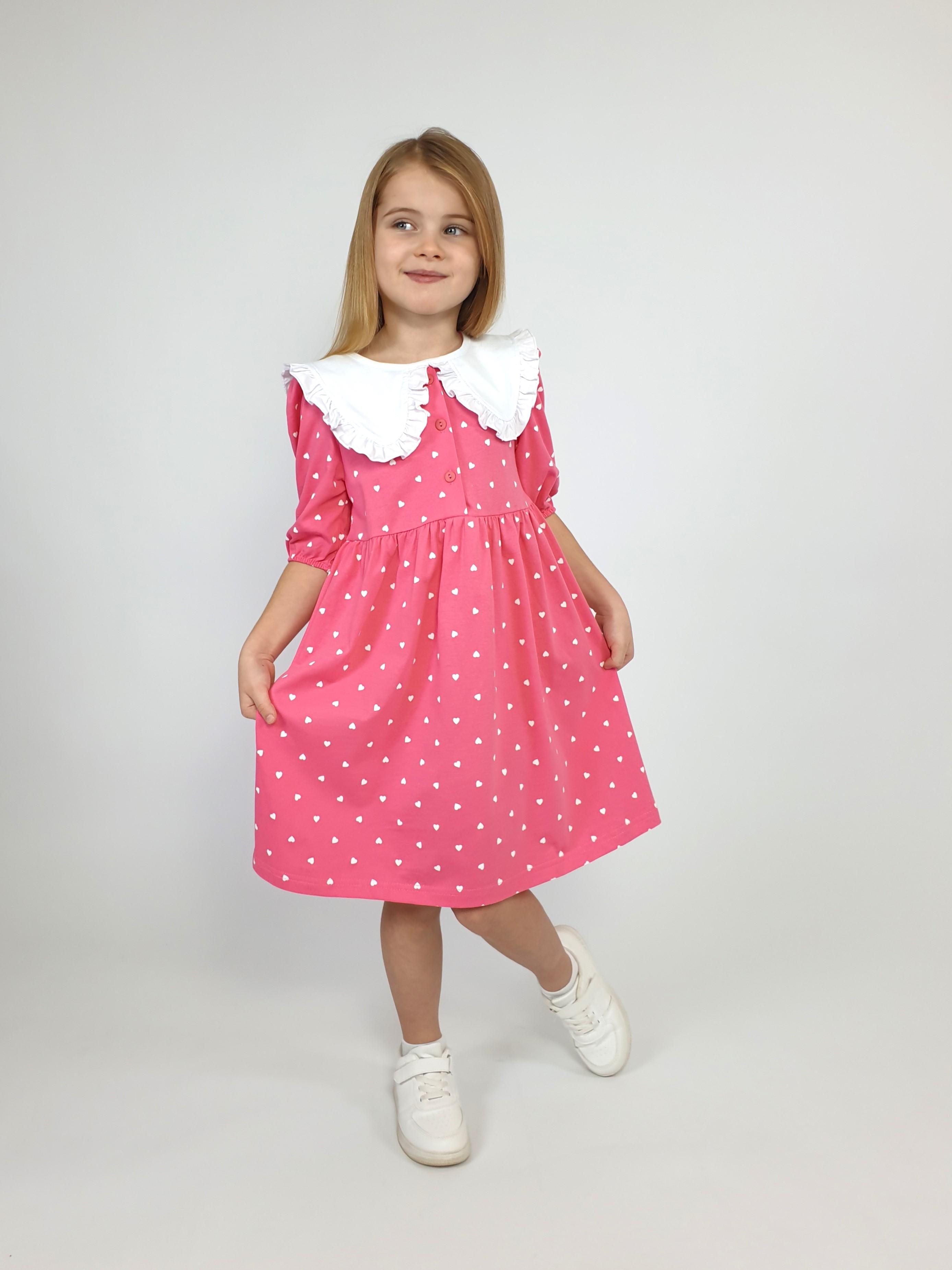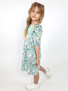 Кулирное полотно:100% х/б. Платье-с отрезной юбкой в сборку.Короткий рукав с резинкой внизу,сборка по окату.Горловина окантована и подшита,застежка центральная на пуговицы.Отделочный съемный воротник с рюшей,завязывающийся на бант.