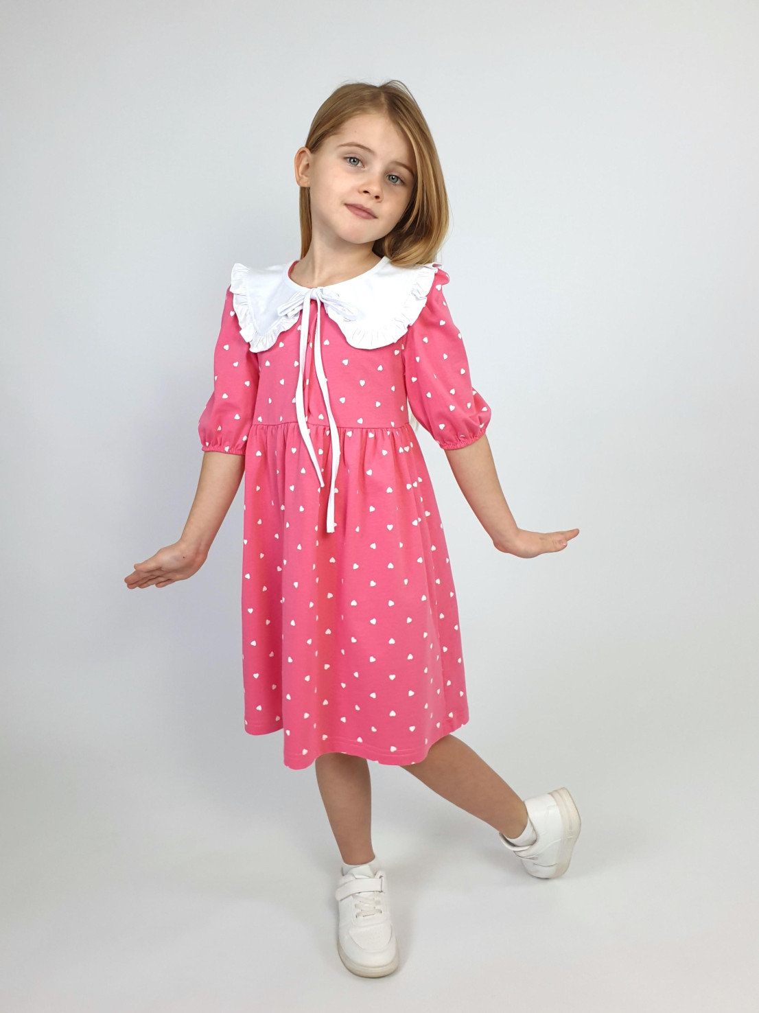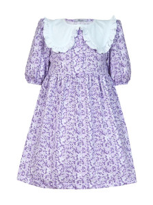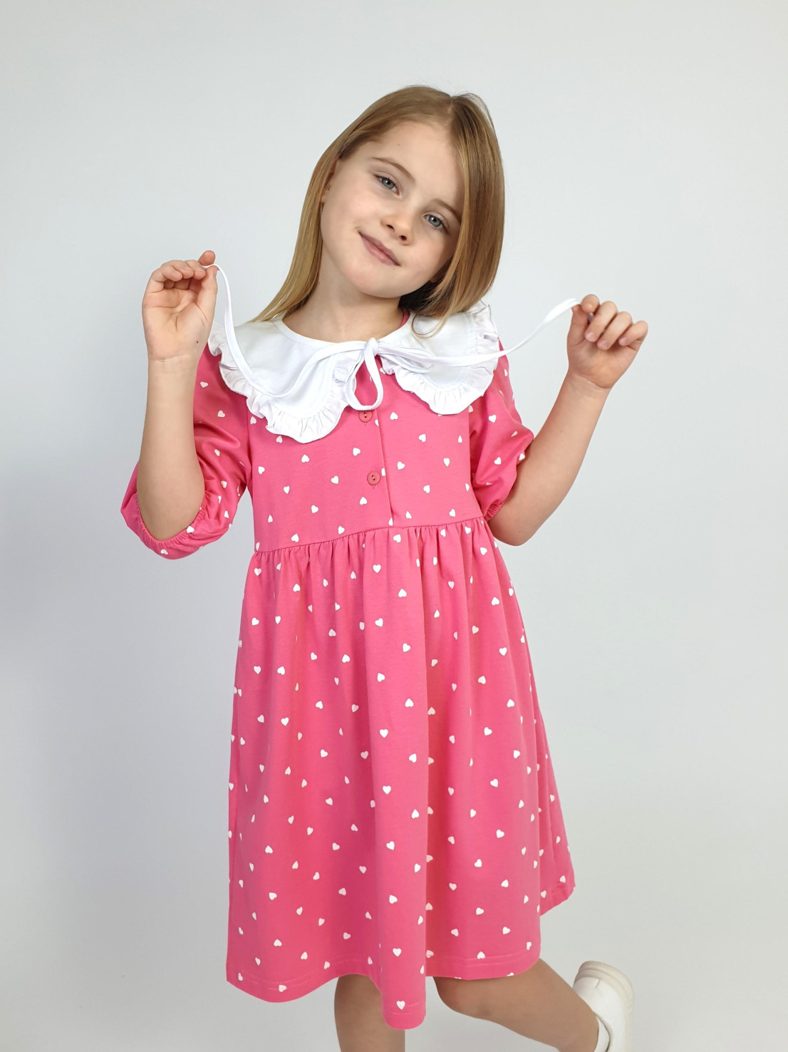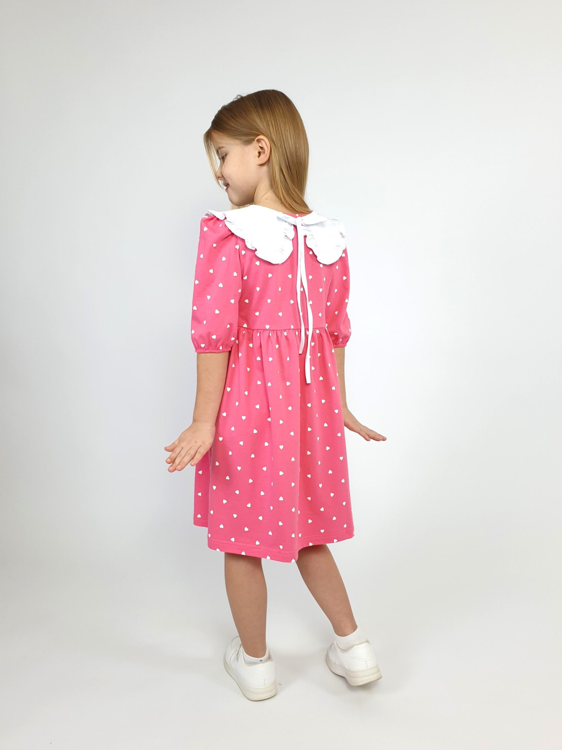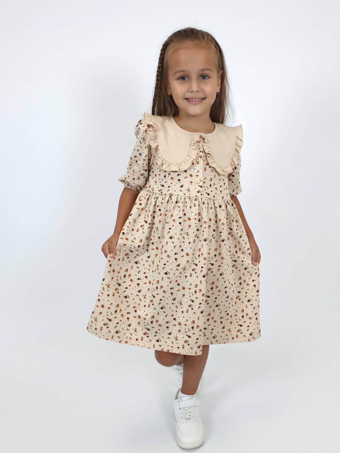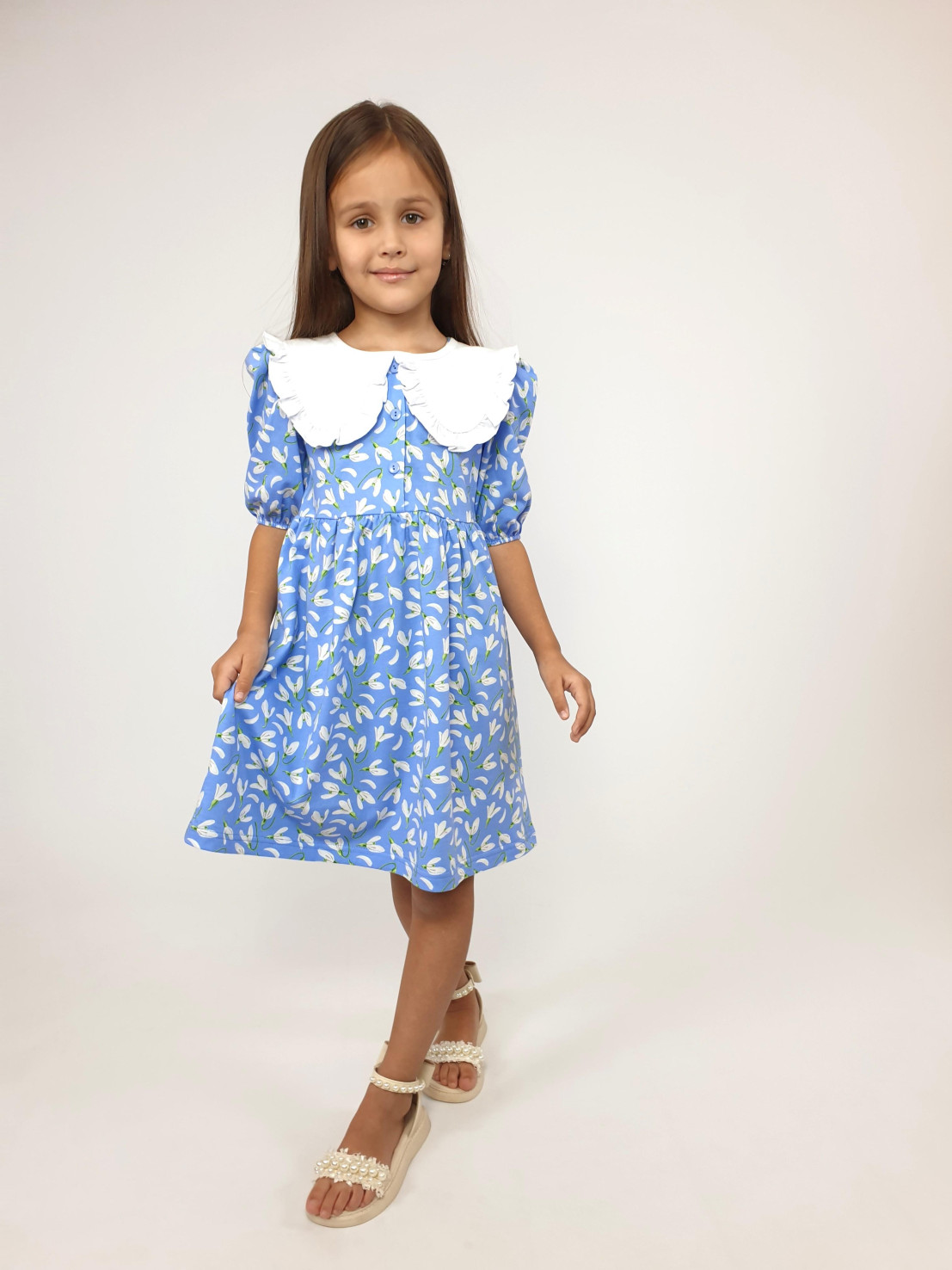 Кулирное полотно:100% х/б. Платье-с отрезной юбкой в сборку.Короткий рукав с резинкой внизу,сборка по окату.Горловина окантована и подшита,застежка центральная на пуговицы.Отделочный съемный воротник с рюшей,завязывающийся на бант.