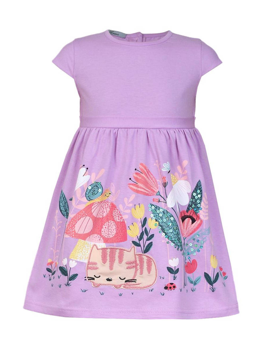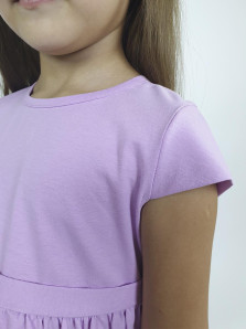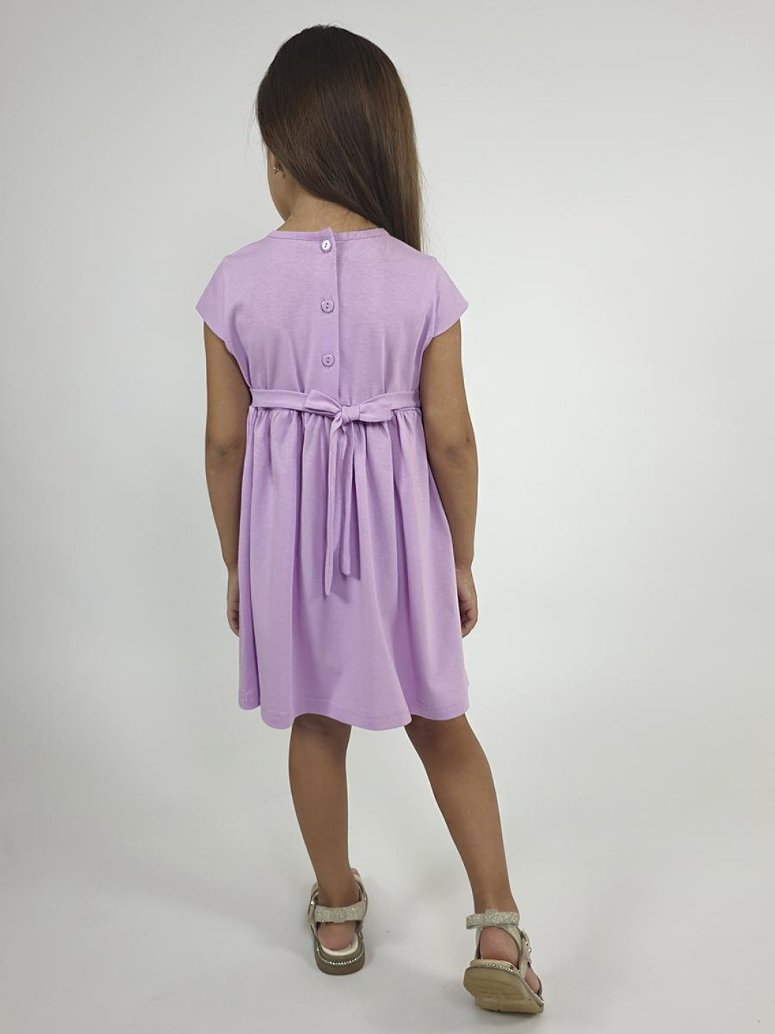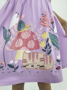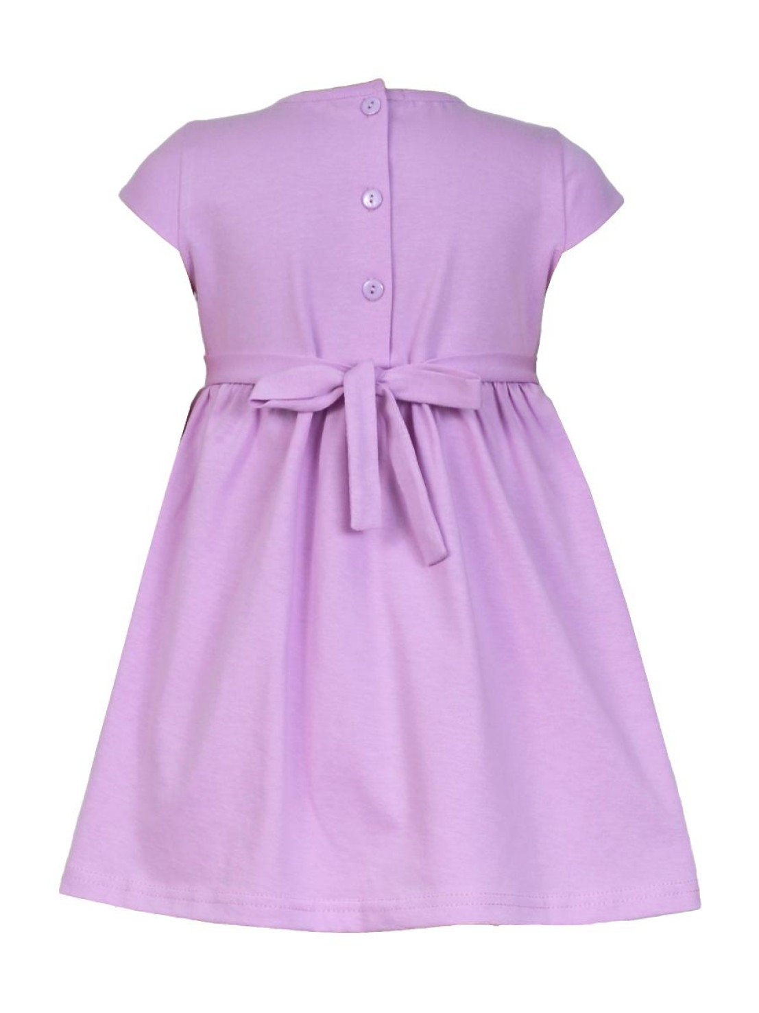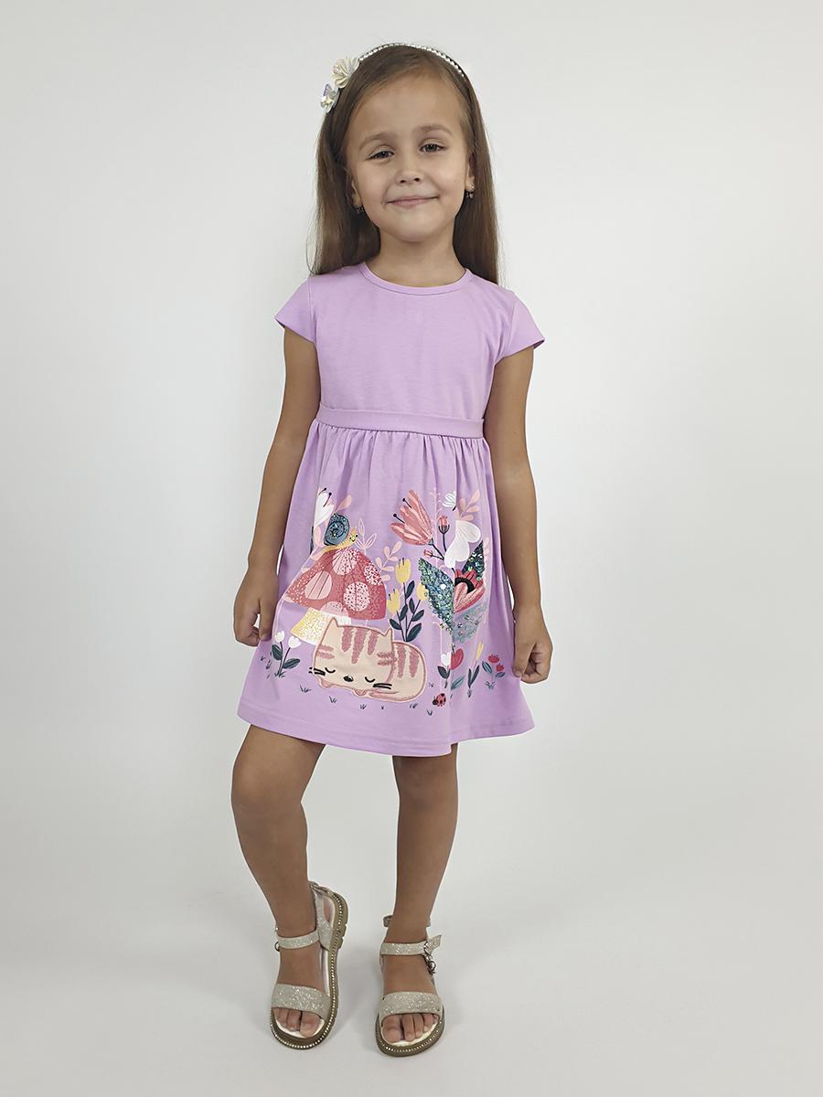 Кулирное полотно:100% х/б. Платье-силуэт трапеция с завышенной линией талии на кокетке.Застежка по кокетке спинки на пуговицы.Горловина окантована.Юбка со сборкой,переднее полотнище юбки с печатью и вышивкой.Между кокеткой и юбкой переда втачан декоративный пояс,переходящий на спинку в завязывающийся.Рукав короткий.