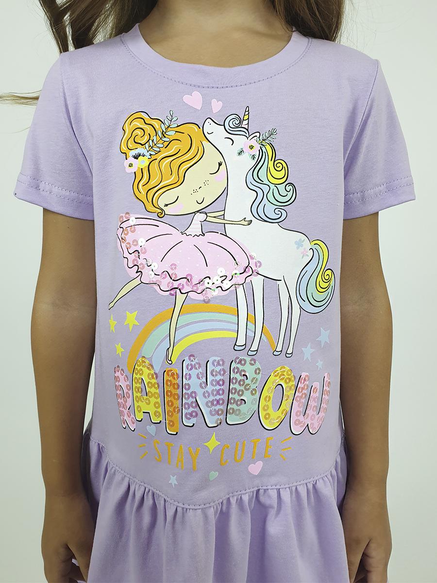 Кулирное полотно:100% х/б. Платье-силуэт трапеция,короткий рукав,юбка отрезная со сборкой.Горловина обработана планкой.Печать и вышивка(пайетки) на переде.