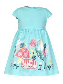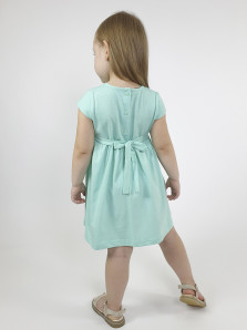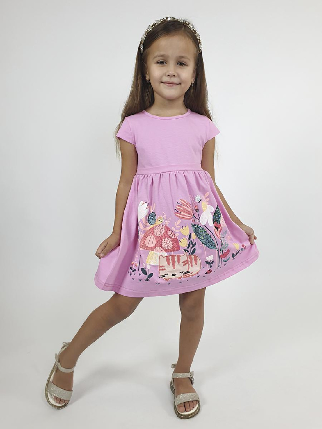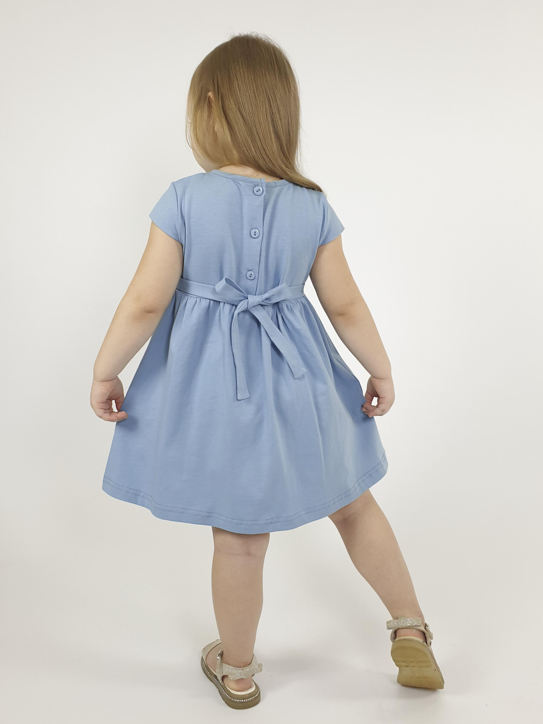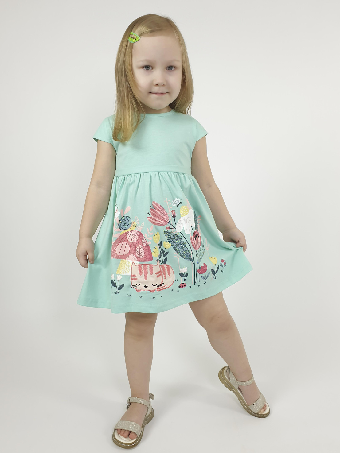 Кулирное полотно:100% х/б. Платье-силуэт трапеция с завышенной линией талии на кокетке.Застежка по кокетке спинки на пуговицы.Горловина окантована.Юбка со сборкой,переднее полотнище юбки с печатью и вышивкой.Между кокеткой и юбкой переда втачан декоративный пояс,переходящий на спинку в завязывающийся.Рукав короткий.