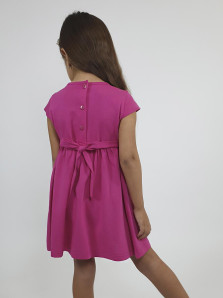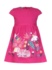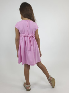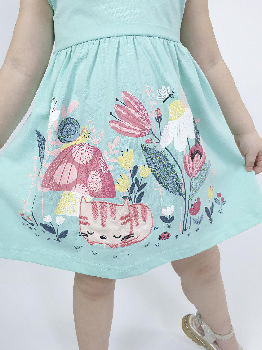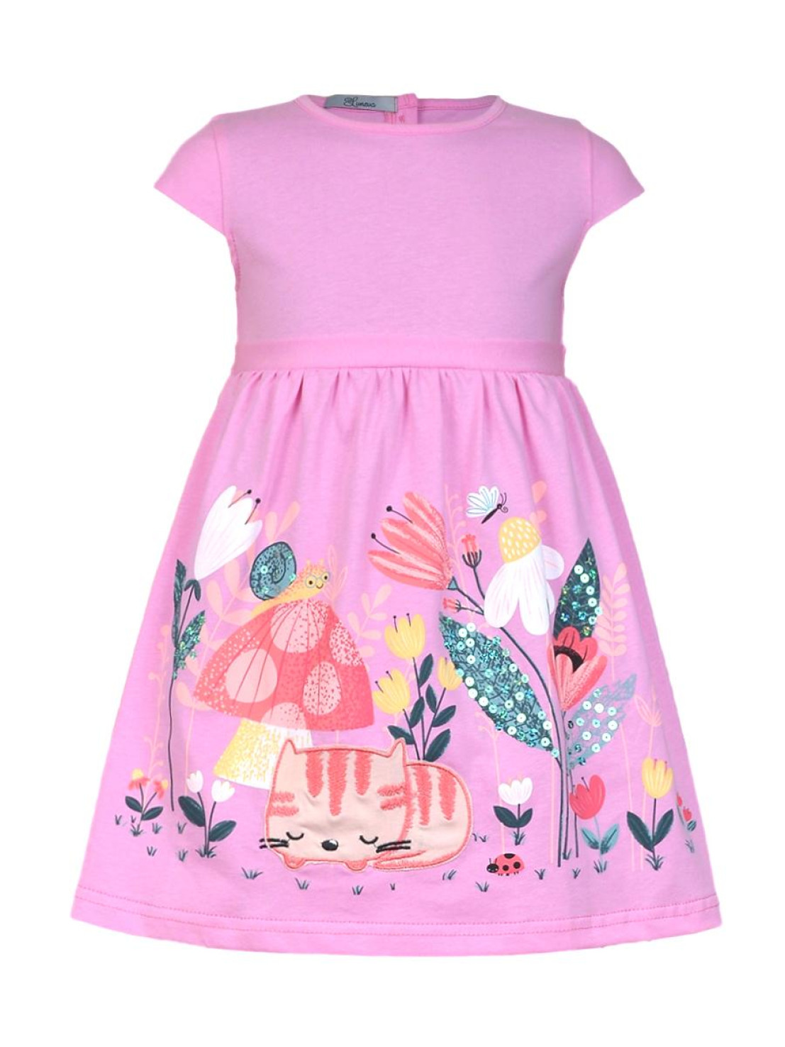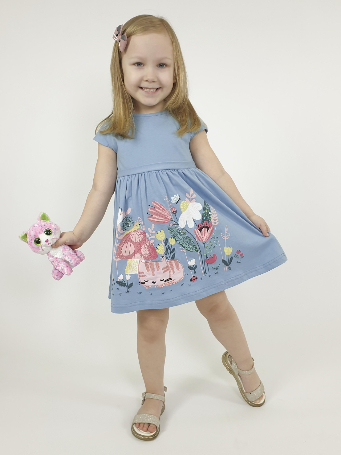 Кулирное полотно:100% х/б. Платье-силуэт трапеция с завышенной линией талии на кокетке.Застежка по кокетке спинки на пуговицы.Горловина окантована.Юбка со сборкой,переднее полотнище юбки с печатью и вышивкой.Между кокеткой и юбкой переда втачан декоративный пояс,переходящий на спинку в завязывающийся.Рукав короткий.