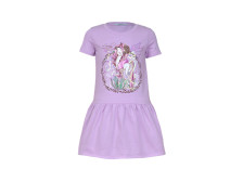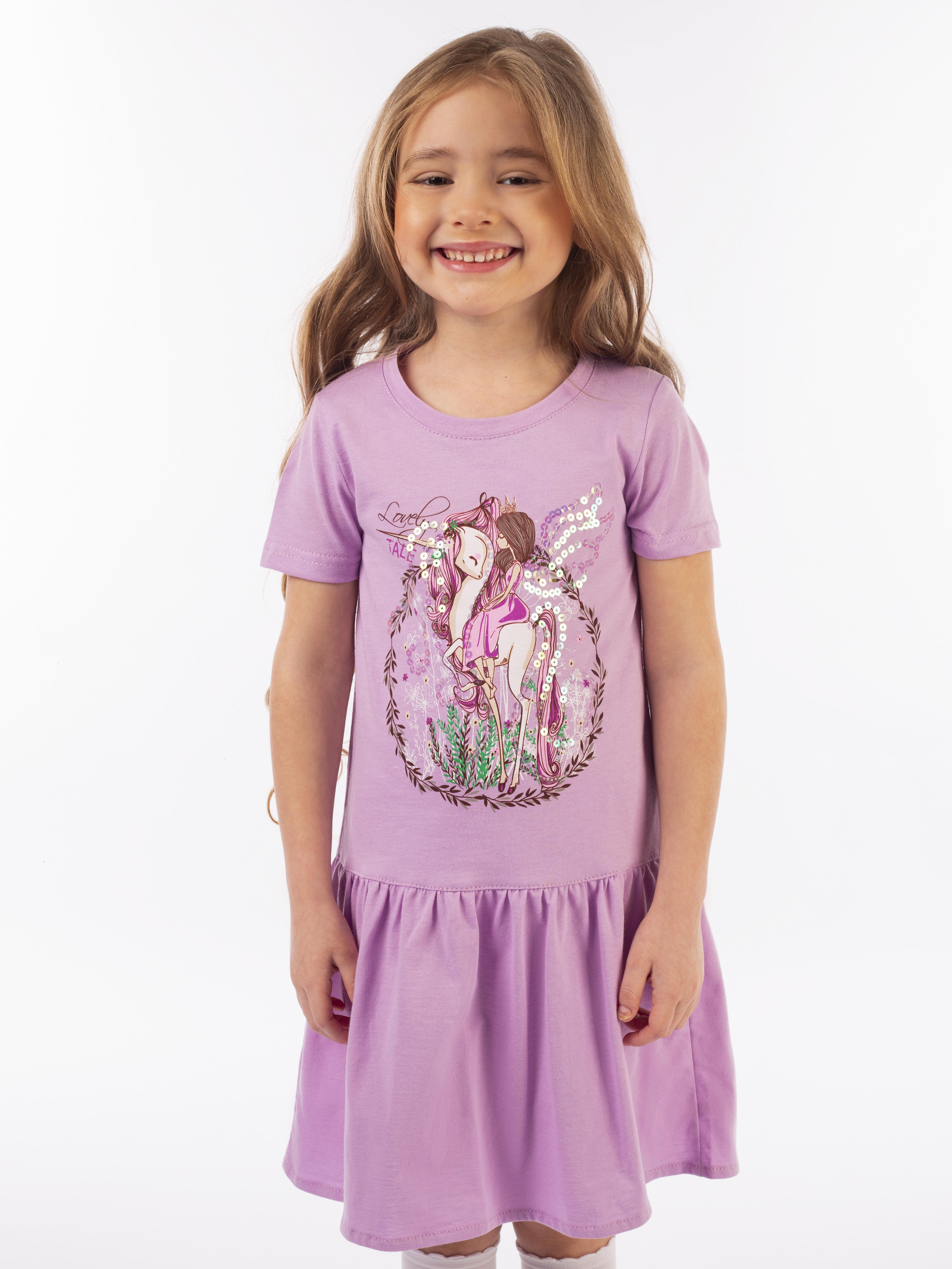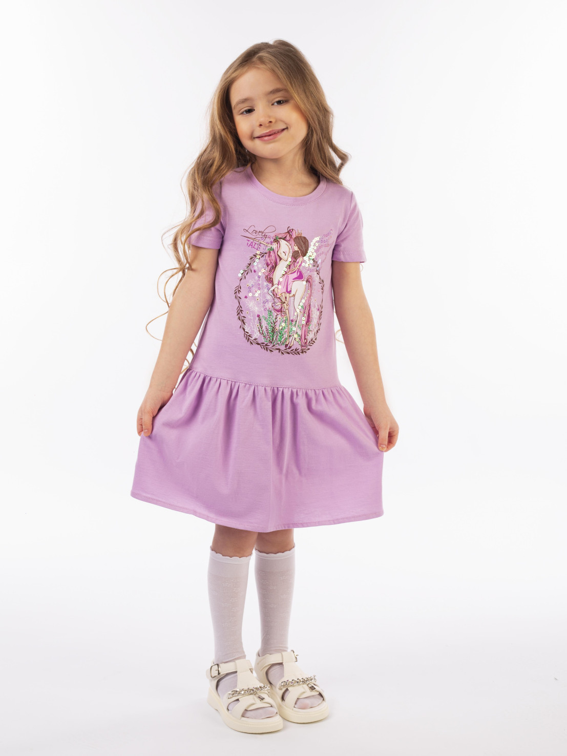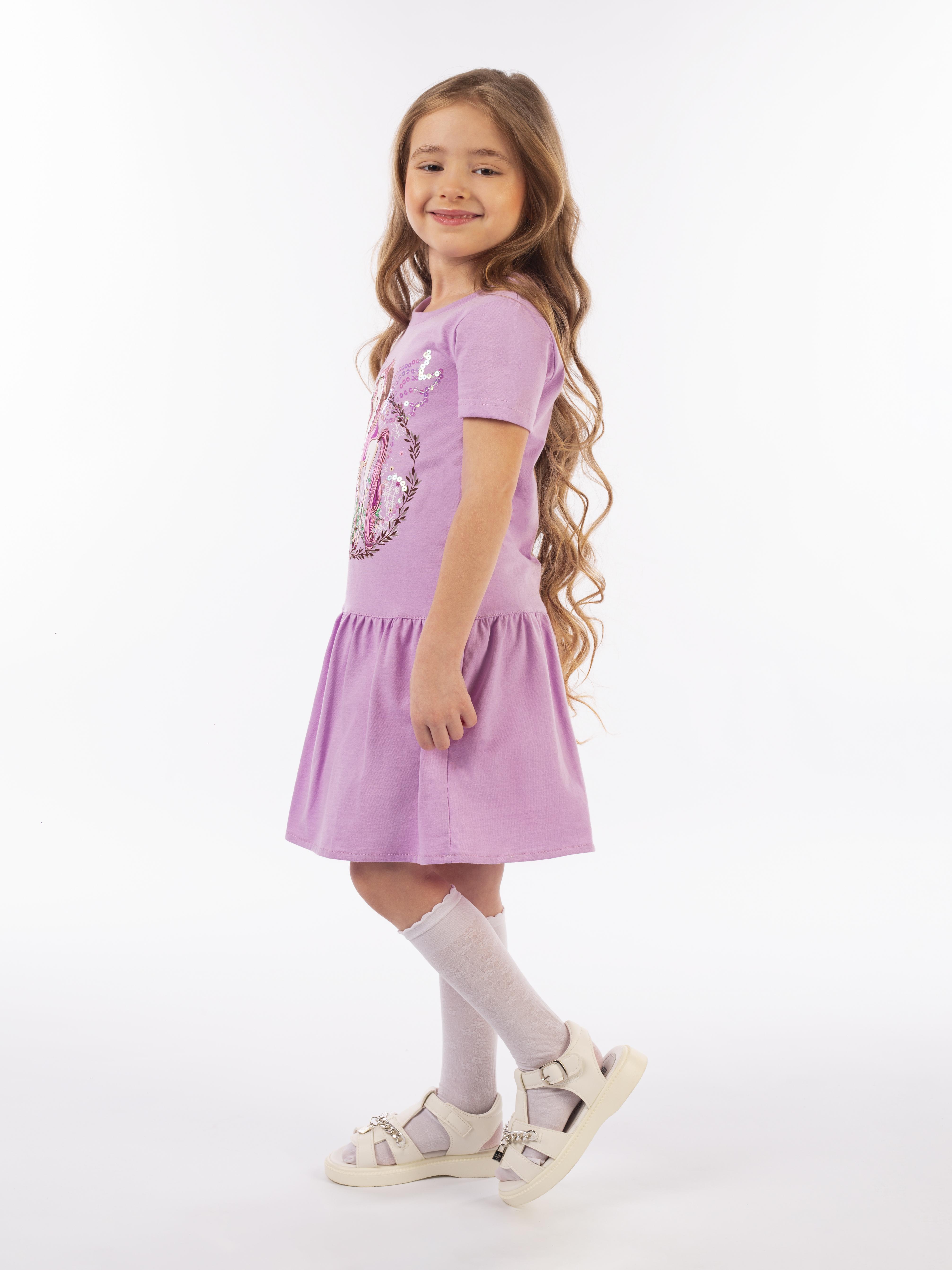 Кулирное полотно: 100% х/б. Платье-силуэт трапеция,короткий рукав,юбка отрезная со сборкой.Горловина обработана планкой.Печать и вышивка(пайетки) на полочке.