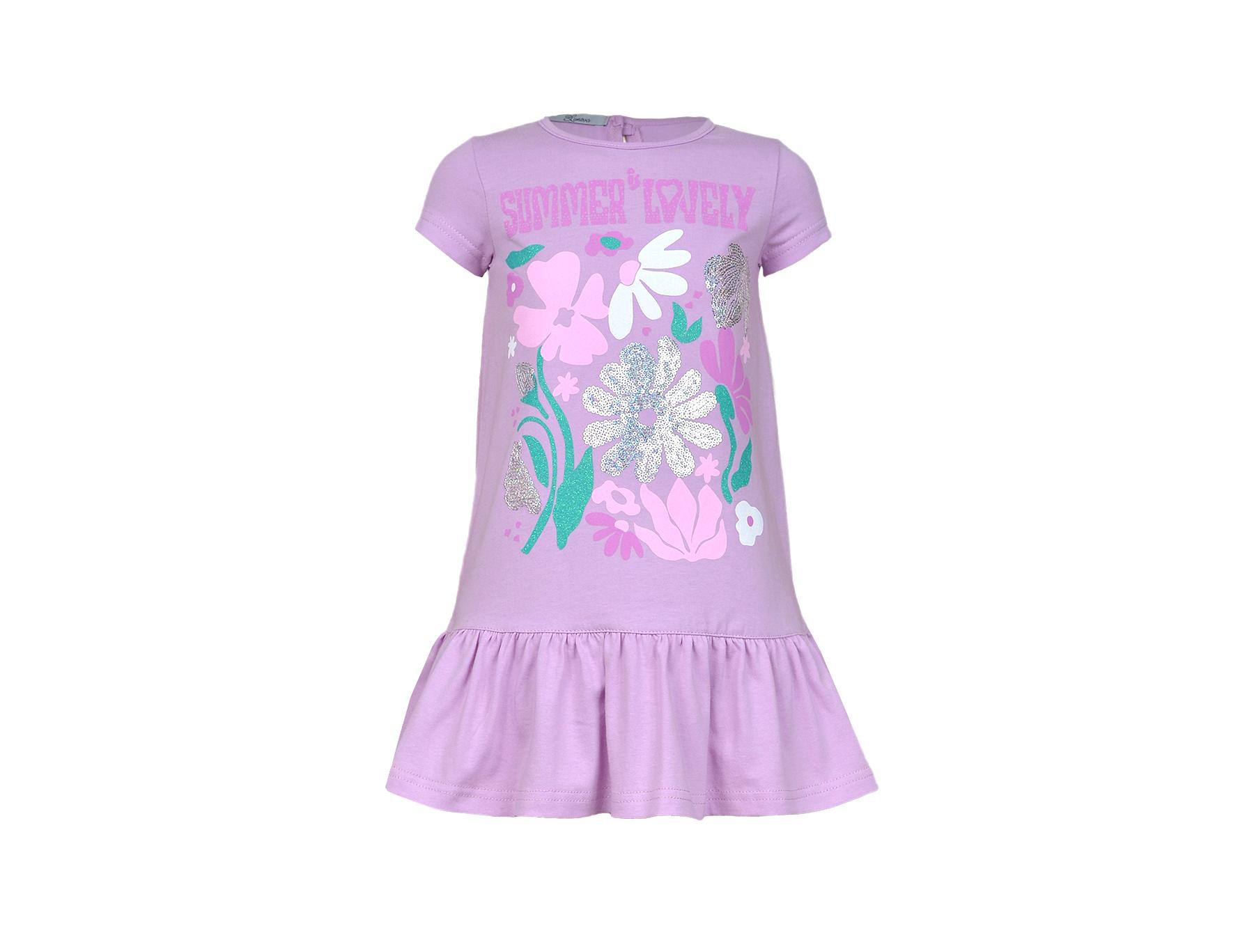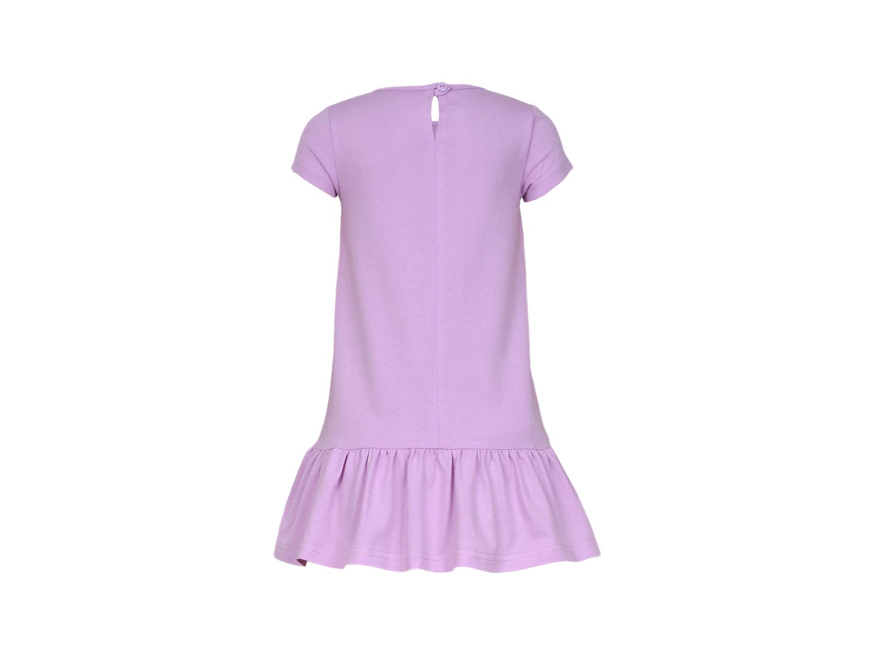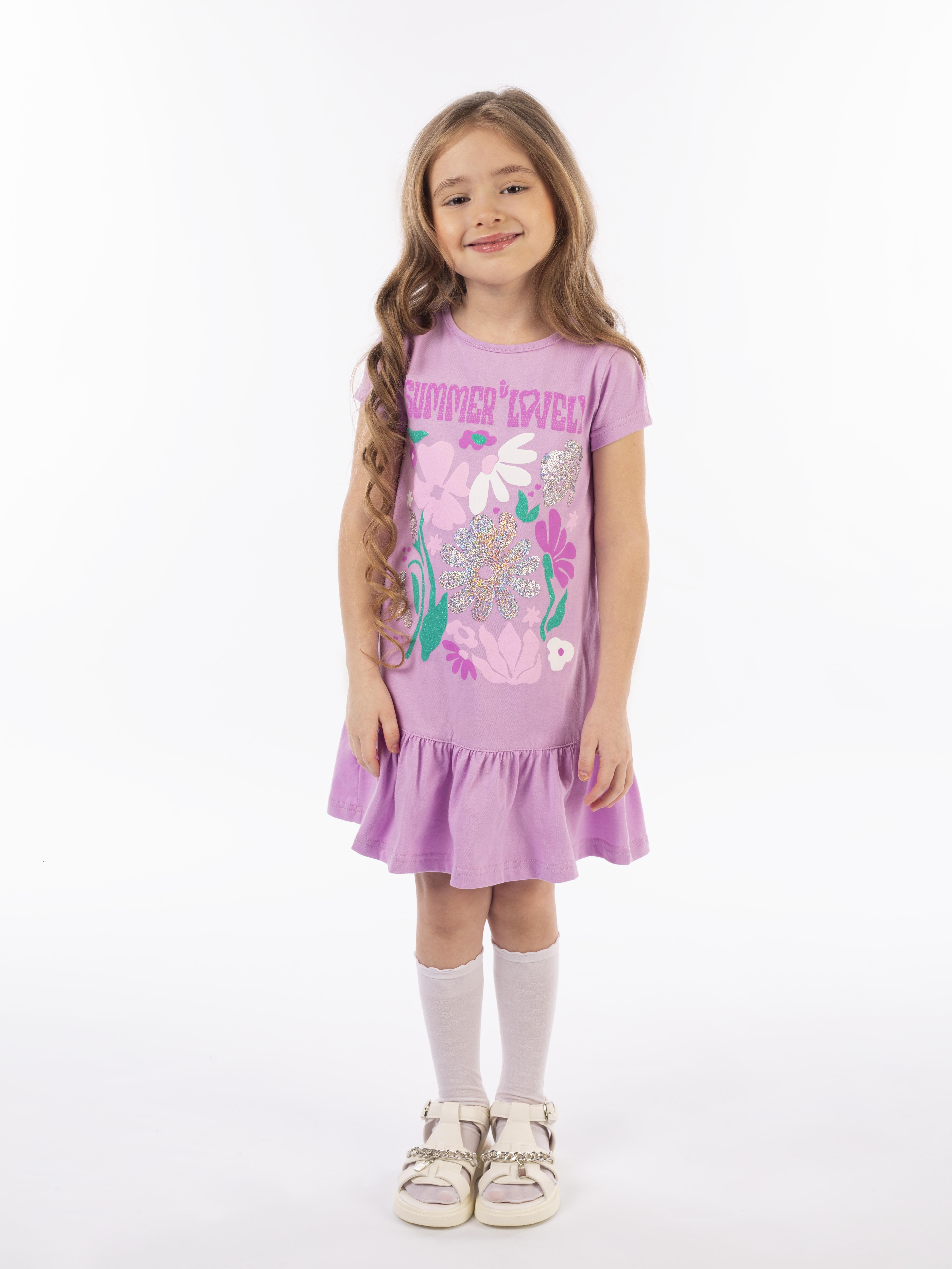 Кулирное полотно: 100% х/б. Платье-силуэт трапеция,короткий рукав,внизу волан.Печать и вышивка(пайетки) на переде.Горловина окантована.застежка по спинке на пуговицу.Ярлык на спинке.