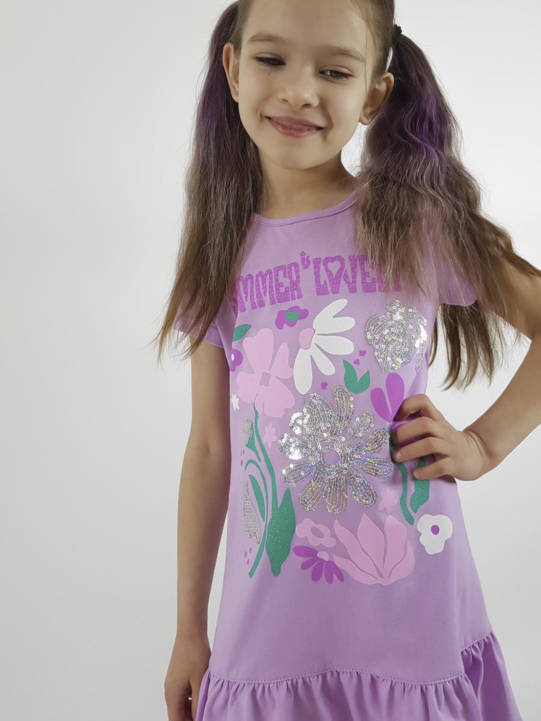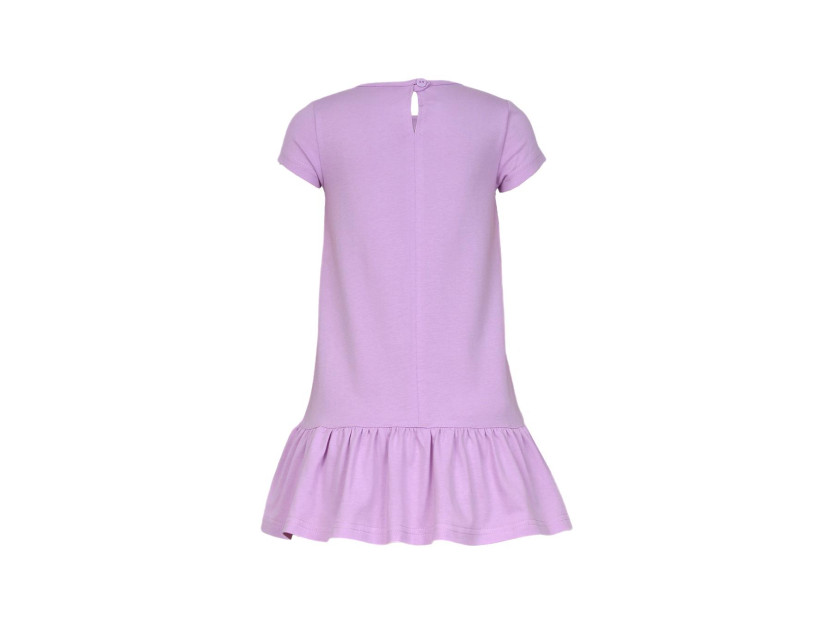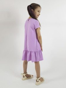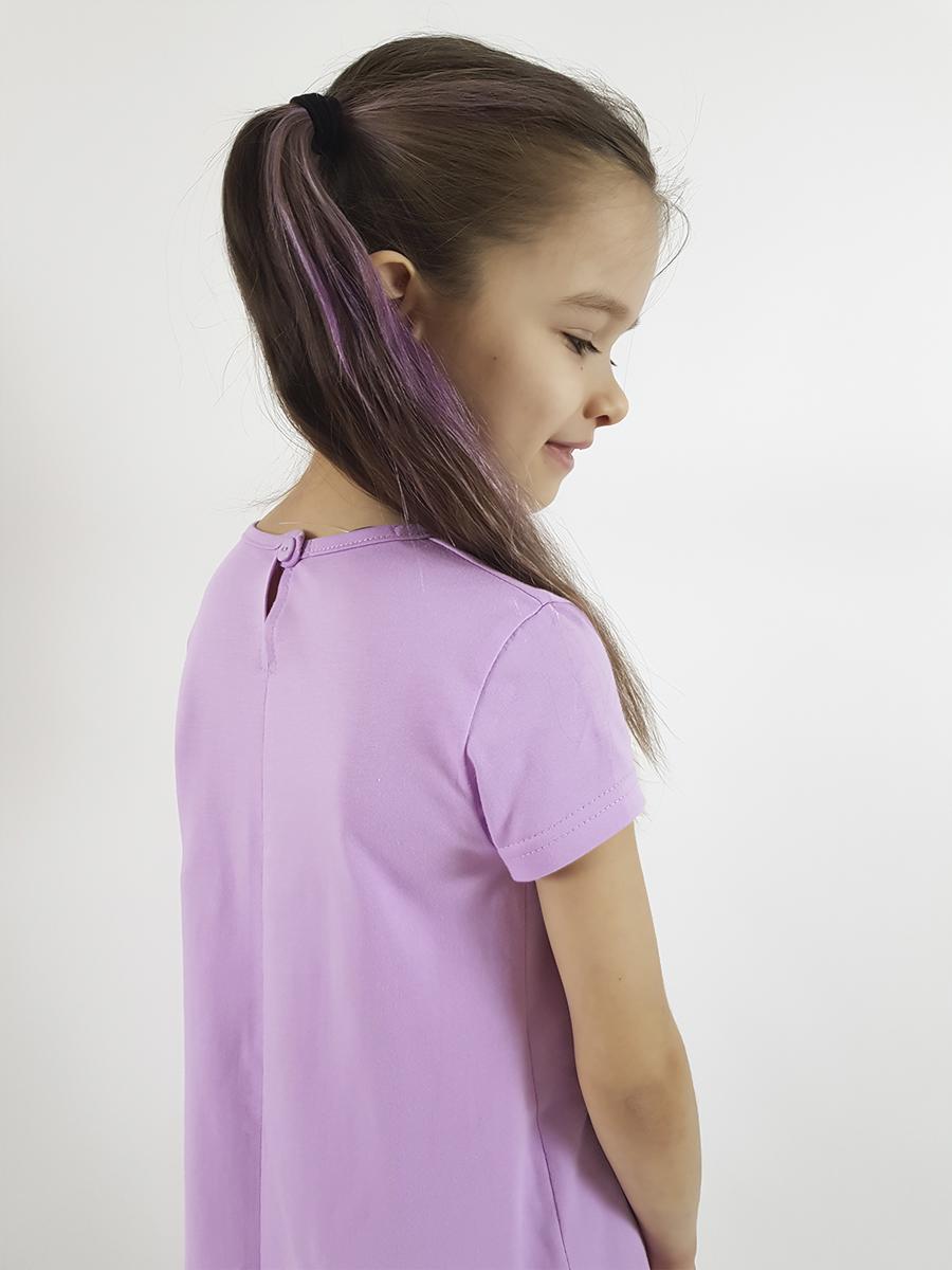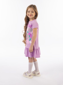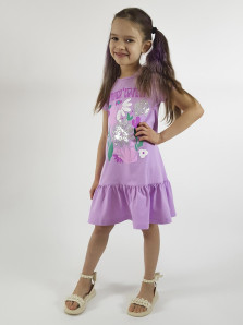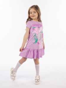 Кулирное полотно: 100% х/б. Платье-силуэт трапеция,короткий рукав,внизу волан.Печать и вышивка(пайетки) на переде.Горловина окантована.застежка по спинке на пуговицу.Ярлык на спинке.